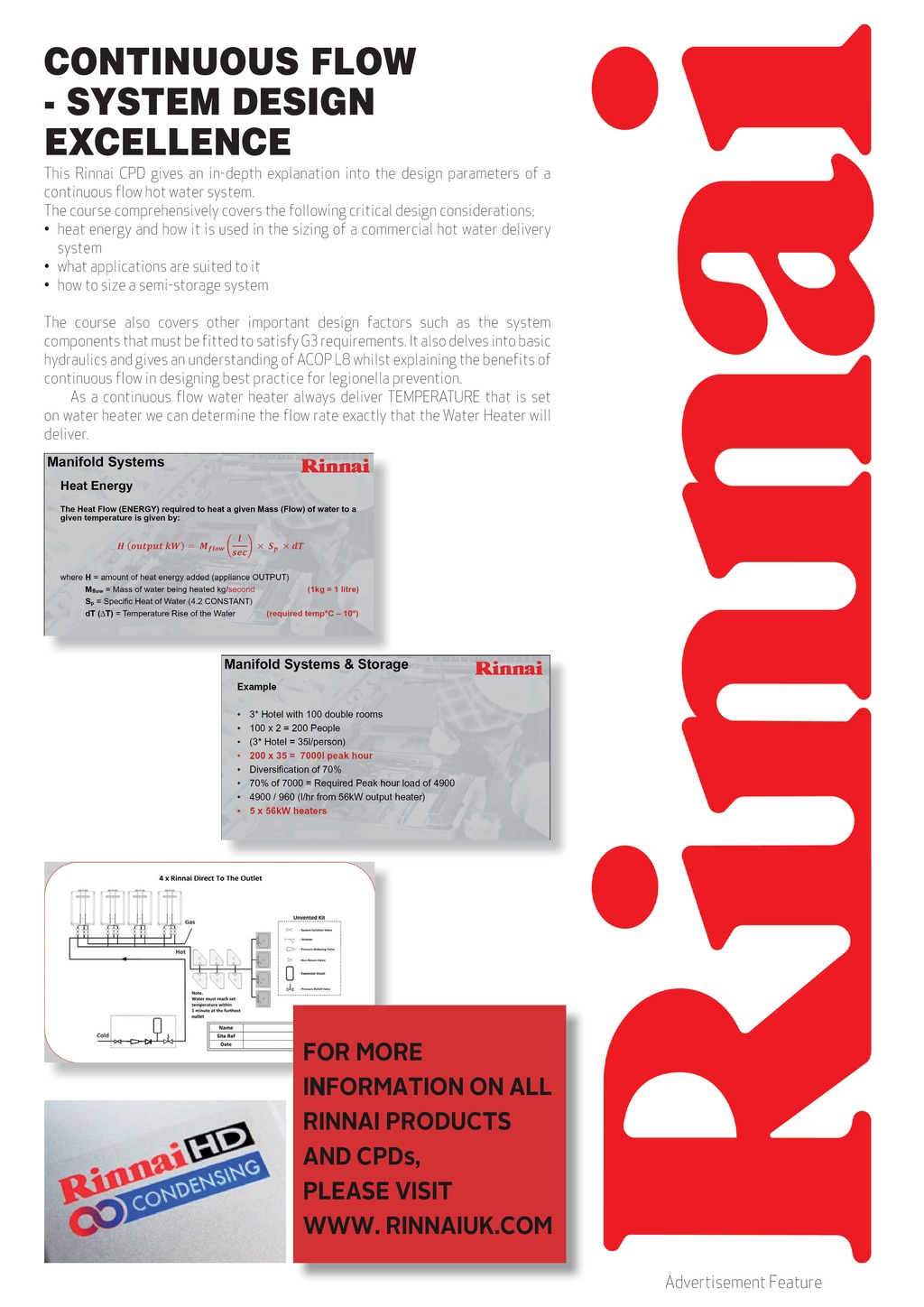 CONTINUOUS FLOW - SYSTEM DESIGN EXCELLENCE This Rinnai CPD gives an in-depth explanation into the design parameters of a continuous ow hot water system. The course comprehensively covers the following critical design considerations; heat energy and how it is used in the sizing of a commercial hot water delivery system what applications are suited to it how to size a semi-storage system The course also covers other important design factors such as the system components that must be tted to satisfy G3 requirements. It also delves into basic hydraulics and gives an understanding of ACOP L8 whilst explaining the benets of continuous ow in designing best practice for legionella prevention. As a continuous ow water heater always deliver TEMPERATURE that is set on water heater we can determine the ow rate exactly that the Water Heater will deliver. . 48 April 2019 www.cibsejournal.com Advertisement Feature p48.CIBSEMagApr19.indd 48 20/03/2019 14:31