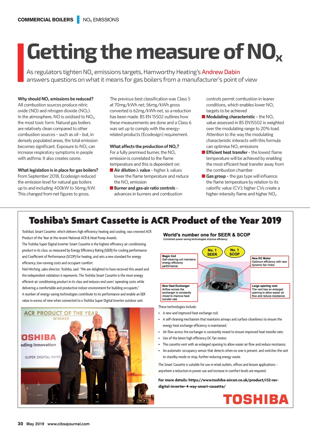 COMMERCIAL BOILERS | NOX EMISSIONS Getting the measure of NOx As regulators tighten NOx emissions targets, Hamworthy Heatings Andrew Dabin answers questions on what it means for gas boilers from a manufacturers point of view Why should NOx emissions be reduced? All combustion sources produce nitric oxide (NO) and nitrogen dioxide (NO2). In the atmosphere, NO is oxidised to NO2, the most toxic form. Natural gas boilers are relatively clean compared to other combustion sources such as oil but, in densely populated areas, the total emission becomes significant. Exposure to NO2 can increase respiratory symptoms in people with asthma. It also creates ozone. What legislation is in place for gas boilers? From September 2018, Ecodesign reduced the emission level for natural gas boilers up to and including 400kW to 56mg/kW. This changed from net figures to gross. Theprevious best classification was Class5 at 70mg/kWh net; 56mg/kWh gross converted is 62mg/kWh net, so a reduction has been made. BS EN 15502 outlines how these measurements are done and a Class6 was set up to comply with the energyrelated products (Ecodesign) requirement. What affects the production of NOx? For a fully premixed burner, the NOx emission is correlated to the flame temperature and this is dependent on: Air dilution value higher values lower the flame temperature and reduce the NOx emission Burner and gas-air ratio controls advances in burners and combustion controls permit combustion in leaner conditions, which enables lower NOx targets to be achieved Modulating characteristic the NOx value assessed in BS EN15502 is weighted over the modulating range to 20% load. Attention to the way the modulating characteristic interacts with this formula can optimise NOx emissions Efficient heat transfer the lowest flame temperature will be achieved by enabling the most efficient heat transfer away from the combustion chamber Gas group the gas type will influence the flame temperature by relation to its calorific value (CV); higher CVs create a higher-intensity flame and higher NOx. Toshibas Smart Cassette is ACR Product of the Year 2019 Toshibas Smart Cassette, which delivers high efciency heating and cooling, was crowned ACR Product of the Year at the recent National ACR & Heat Pump Awards. The Toshiba Super Digital Inverter Smart Cassette is the highest efciency air conditioning product in its class, as measured by Energy Efciency Rating (SEER) for cooling performance and Coefcient of Performance (SCOP) for heating, and sets a new standard for energy efciency, low running costs and occupant comfort. Neil Hitching, sales director, Toshiba, said: We are delighted to have received this award and the independent validation it represents. The Toshiba Smart Cassette is the most energy efcient air conditioning product in its class and reduces end users operating costs while delivering a comfortable and productive indoor environment for building occupants. A number of energy-saving technologies contribute to its performance and enable an EER value in excess of nine when connected to a Toshiba Super Digital Inverter outdoor unit. These technologies include: A new and improved heat exchange coil; A self-cleaning mechanism that maintains airways and surface cleanliness to ensure the energy heat exchange efciency is maintained; Air ow across the exchanger is constantly mixed to ensure improved heat transfer rate; Use of the latest high efciency DC fan motor; The cassette vent with an enlarged opening to allow easier air ow and reduce resistance; An automatic occupancy sensor that detects when no one is present, and switches the unit to standby mode or stop, further reducing energy waste. The Smart Cassette is suitable for use in retail outlets, ofces and leisure applications anywhere a reduction in power use and increase in comfort levels are required. For more details: https://www.toshiba-aircon.co.uk/product/r32-ravdigital-inverter-4-way-smart-cassette/ 30 May 2019 www.cibsejournal.com CIBSE May19 pp30-31 Hamworthy NOX Supp.indd 30 26/04/2019 16:21