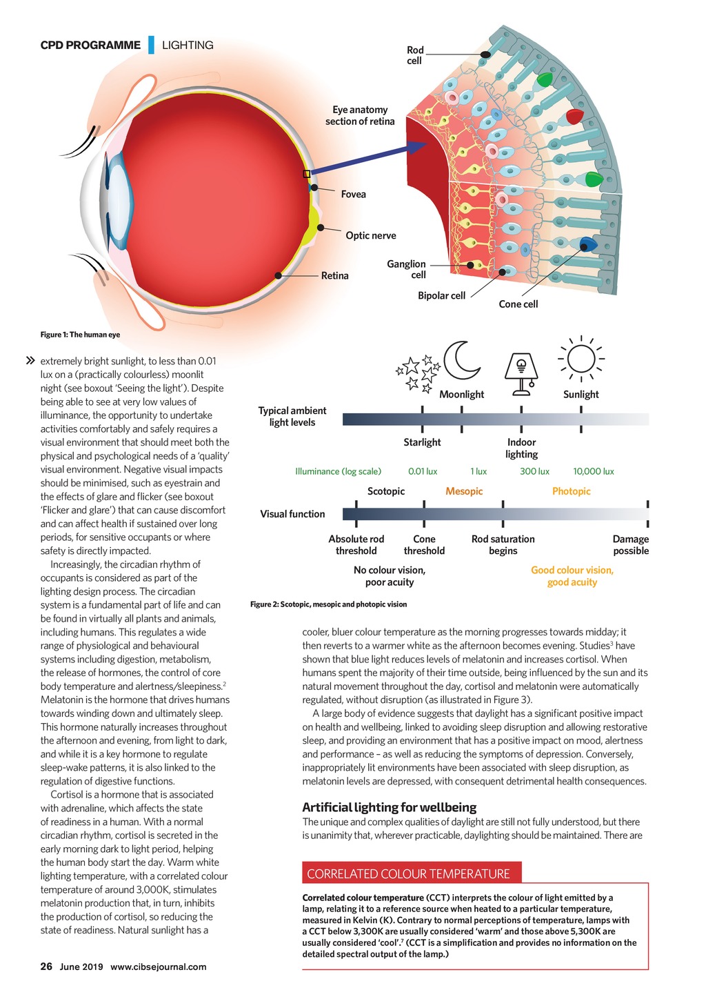 CPD PROGRAMME | LIGHTING Rod cell Eye anatomy section of retina Fovea Optic nerve Ganglion cell Retina Bipolar cell Cone cell Figure 1: The human eye extremely bright sunlight, to less than 0.01 lux on a (practically colourless) moonlit night (see boxout Seeing the light). Despite being able to see at very low values of illuminance, the opportunity to undertake activities comfortably and safely requires a visual environment that should meet both the physical and psychological needs of a quality visual environment. Negative visual impacts should be minimised, such as eyestrain and the effects of glare and icker (see boxout Flicker and glare) that can cause discomfort and can affect health if sustained over long periods, for sensitive occupants or where safety is directly impacted. Increasingly, the circadian rhythm of occupants is considered as part of the lighting design process. The circadian system is a fundamental part of life and can be found in virtually all plants and animals, including humans. This regulates a wide range of physiological and behavioural systems including digestion, metabolism, the release of hormones, the control of core body temperature and alertness/sleepiness.2 Melatonin is the hormone that drives humans towards winding down and ultimately sleep. This hormone naturally increases throughout the afternoon and evening, from light to dark, and while it is a key hormone to regulate sleep-wake patterns, it is also linked to the regulation of digestive functions. Cortisol is a hormone that is associated with adrenaline, which affects the state of readiness in a human. With a normal circadian rhythm, cortisol is secreted in the early morning dark to light period, helping the human body start the day. Warm white lighting temperature, with a correlated colour temperature of around 3,000K, stimulates melatonin production that, in turn, inhibits the production of cortisol, so reducing the state of readiness. Natural sunlight has a Moonlight Sunlight Typical ambient light levels Starlight Illuminance (log scale) 0.01 lux Scotopic Indoor lighting 1 lux 300 lux 10,000 lux Photopic Mesopic Visual function Absolute rod threshold Cone threshold Rod saturation begins No colour vision, poor acuity Damage possible Good colour vision, good acuity Figure 2: Scotopic, mesopic and photopic vision cooler, bluer colour temperature as the morning progresses towards midday; it then reverts to a warmer white as the afternoon becomes evening. Studies3 have shown that blue light reduces levels of melatonin and increases cortisol. When humans spent the majority of their time outside, being inuenced by the sun and its natural movement throughout the day, cortisol and melatonin were automatically regulated, without disruption (as illustrated in Figure 3). A large body of evidence suggests that daylight has a signicant positive impact on health and wellbeing, linked to avoiding sleep disruption and allowing restorative sleep, and providing an environment that has a positive impact on mood, alertness and performance as well as reducing the symptoms of depression. Conversely, inappropriately lit environments have been associated with sleep disruption, as melatonin levels are depressed, with consequent detrimental health consequences. Artificial lighting for wellbeing The unique and complex qualities of daylight are still not fully understood, but there is unanimity that, wherever practicable, daylighting should be maintained. There are CORRELATED COLOUR TEMPERATURE Correlated colour temperature (CCT) interprets the colour of light emitted by a lamp, relating it to a reference source when heated to a particular temperature, measured in Kelvin (K). Contrary to normal perceptions of temperature, lamps with a CCT below 3,300K are usually considered warm and those above 5,300K are usually considered cool.7 (CCT is a simplication and provides no information on the detailed spectral output of the lamp.) 26 June 2019 www.cibsejournal.com CIBSE Jun19 pp25-28 CPD 147 Supp v4.indd 26 24/05/2019 14:53