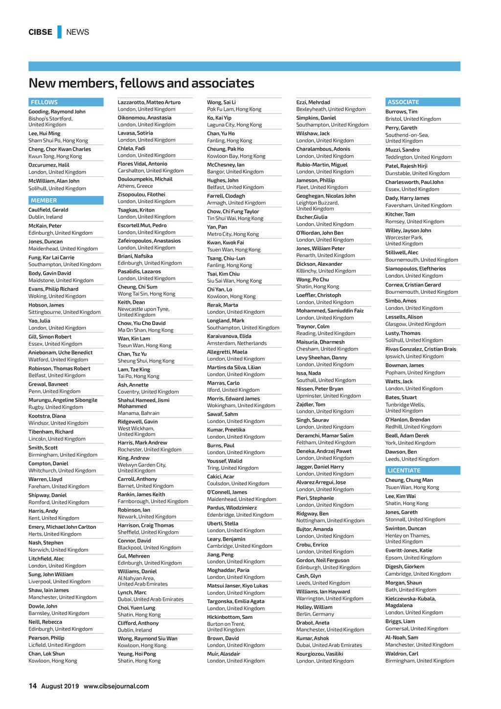 CIBSE | NEWS New members, fellows and associates FELLOWS ASSOCIATE Lazzarotto, Matteo Arturo London, United Kingdom Wong, Sai Li Pok Fu Lam, Hong Kong Ezzi, Mehrdad Bexleyheath, United Kingdom Oikonomou, Anastasia London, United Kingdom Ko, Kai Yip Laguna City, Hong Kong Simpkins, Daniel Southampton, United Kingdom Lee, Hui Ming Sham Shui Po, Hong Kong Lavasa, Sotiria London, United Kingdom Chan, Yu Ho Fanling, Hong Kong Wilshaw, Jack London, United Kingdom Perry, Gareth Southend-on-Sea, United Kingdom Cheng, Chor Kwan Charles Kwun Tong, Hong Kong Chlela, Fadi London, United Kingdom Cheung, Pak Ho Kowloon Bay, Hong Kong Charalambous, Adonis London, United Kingdom Muzzi, Sandro Teddington, United Kingdom Ozcurumez, Halil London, United Kingdom Flores Vidal, Antonio Carshalton, United Kingdom McChesney, Ian Bangor, United Kingdom Rubio-Martin, Miguel London, United Kingdom McWilliam, Alan John Solihull, United Kingdom Douloumpekis, Michail Athens, Greece Patel, Rajesh Hirji Dunstable, United Kingdom Hughes, John Belfast, United Kingdom Jameson, Phillip Fleet, United Kingdom Zisopoulou, Filothei London, United Kingdom Charlesworth, Paul John Essex, United Kingdom Farrell, Clodagh Armagh, United Kingdom Caulfield, Gerald Dublin, Ireland Tsagkas, Kriton London, United Kingdom Chow, Chi Fung Taylor Tin Shui Wai, Hong Kong Geoghegan, Nicolas John Leighton Buzzard, United Kingdom Dady, Harry James Faversham, United Kingdom McKain, Peter Edinburgh, United Kingdom Escortell Mut, Pedro London, United Kingdom Yan, Pan Metro City, Hong Kong Jones, Duncan Maidenhead, United Kingdom Zafeiropoulos, Anastasios London, United Kingdom Fung, Kar Lai Carrie Southampton, United Kingdom Briani, Nafsika Edinburgh, United Kingdom Kwan, Kwok Fai Tsuen Wan, Hong Kong Body, Gavin David Maidstone, United Kingdom Pasalidis, Lazaros London, United Kingdom Gooding, Raymond John Bishops Stortford, United Kingdom MEMBER Evans, Philip Richard Woking, United Kingdom Hobson, James Sittingbourne, United Kingdom Yao, Julia London, United Kingdom Cheung, Chi Sum Wong Tai Sin, Hong Kong Keith, Dean Newcastle upon Tyne, United Kingdom Chow, Yiu Cho David Ma On Shan, Hong Kong Tsang, Chiu-Lun Fanling, Hong Kong Tsai, Kim Chiu Siu Sai Wan, Hong Kong Chi Yan, Lo Kowloon, Hong Kong Rerak, Marta London, United Kingdom Longland, Mark Southampton, United Kingdom Karaivanova, Elida Amsterdam, Netherlands Gill, Simon Robert Essex, United Kingdom Wan, Kin Lam Tseun Wan, Hong Kong Aniebonam, Uche Benedict Watford, United Kingdom Chan, Tsz Yu Sheung Shui, Hong Kong Allegretti, Maela London, United Kingdom Robinson, Thomas Robert Belfast, United Kingdom Lam, Tze King Tai Po, Hong Kong Martins da Silva, Lilian London, United Kingdom Grewal, Bavneet Penn, United Kingdom Ash, Annette Coventry, United Kingdom Marras, Carlo Ilford, United Kingdom Murungu, Angeline Sibongile Rugby, United Kingdom Shahul Hameed, Jismi Mohammed Manama, Bahrain Morris, Edward James Wokingham, United Kingdom Kootstra, Diana Windsor, United Kingdom Tibenham, Richard Lincoln, United Kingdom Smith, Scott Birmingham, United Kingdom Ridgewell, Gavin West Wickham, United Kingdom Harris, Mark Andrew Rochester, United Kingdom Sawaf, Sahm London, United Kingdom Kumar, Preetika London, United Kingdom Burns, Paul London, United Kingdom Compton, Daniel Whitchurch, United Kingdom King, Andrew Welwyn Garden City, United Kingdom Warren, Lloyd Fareham, United Kingdom Carroll, Anthony Barnet, United Kingdom Shipway, Daniel Romford, United Kingdom Rankin, James Keith Farnborough, United Kingdom Harris, Andy Kent, United Kingdom Robinson, Ian Newark, United Kingdom Pardus, Wlodzimierz Edenbridge, United Kingdom Emery, Michael John Carlton Herts, United Kingdom Harrison, Craig Thomas Sheffield, United Kingdom Uberti, Stella London, United Kingdom Nash, Stephen Norwich, United Kingdom Connor, David Blackpool, United Kingdom Leary, Benjamin Cambridge, United Kingdom Gul, Mehreen Edinburgh, United Kingdom Jiang, Peng London, United Kingdom Williams, Daniel Al Nahyan Area, United Arab Emirates Moghaddar, Paria London, United Kingdom Litchfield, Alec London, United Kingdom Sung, John William Liverpool, United Kingdom Shaw, Iain James Manchester, United Kingdom Lynch, Marc Dubai, United Arab Emirates Youssef, Walid Tring, United Kingdom Cakici, Acar Coulsdon, United Kingdom OConnell, James Maidenhead, United Kingdom Matsui Janser, Kiyo Lukas London, United Kingdom Escher,Giulia London, United Kingdom ORiordan, John Ben London, United Kingdom Jones, William Peter Penarth, United Kingdom Dickson, Alexander Killinchy, United Kingdom Wong, Po Chu Shatin, Hong Kong Loeffler, Christoph London, United Kingdom Mohammed, Samiuddin Faiz London, United Kingdom Traynor, Colm Reading, United Kingdom Maisuria, Dharmesh Chesham, United Kingdom Levy Sheehan, Danny London, United Kingdom Issa, Nada Southall, United Kingdom Nissen, Peter Bryan Upminster, United Kingdom Burrows, Tim Bristol, United Kingdom Kitcher, Tom Romsey, United Kingdom Willey, Jayson John Worcester Park, United Kingdom Stillwell, Alec Bournemouth, United Kingdom Siamopoulos, Eleftherios London, United Kingdom Cornea, Cristian Gerard Bournemouth, United Kingdom Simbo, Amos London, United Kingdom Lessells, Alison Glasgow, United Kingdom Lusty, Thomas Solihull, United Kingdom Rivas Gonzalez, Cristian Brais Ipswich, United Kingdom Bowman, James Popham, United Kingdom Watts, Jack London, United Kingdom Zajdler, Tom London, United Kingdom Bates, Stuart Tunbridge Wells, United Kingdom Singh, Saurav London, United Kingdom OHanlon, Brendan Redhill, United Kingdom Deramchi, Mamar Salim Feltham, United Kingdom Beall, Adam Derek York, United Kingdom Deneka, Andrzej Pawet London, United Kingdom Dawson, Ben Leeds, United Kingdom Jagger, Daniel Harry London, United Kingdom LICENTIATE Alvarez Arregui, Jose London, United Kingdom Cheung, Chung Man Tsuen Wan, Hong Kong Pieri, Stephanie London, United Kingdom Lee, Kim Wai Shatin, Hong Kong Ridgway, Ben Notti