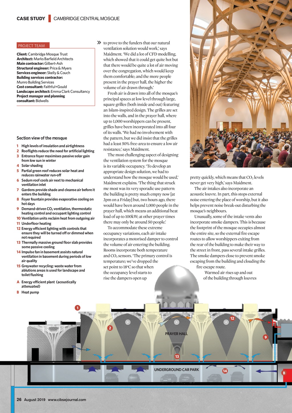 CASE STUDY | CAMBRIDGE CENTRAL MOSQUE PROJECT TEAM Client: Cambridge Mosque Trust Architect: Marks Barfield Architects Main contractor: Gilbert-Ash Structural engineer: Price & Myers Services engineer: Skelly & Couch Building services contractor: Munro Building Services Cost consultant: Faithful+Gould Landscape architect: Emma Clark Consultancy Project manager and planning consultant: Bidwells Section view of the mosque 1 High levels of insulation and airtightness 2 Rooflights reduce the need for artificial lighting 3 Entrance foyer maximises passive solar gain from low sun in winter 4 Solar shading 5 Partial green roof reduces solar heat and reduces rainwater run-off 6 Sedum roof cools air next to mechanical ventilation inlet 7 Gardens provide shade and cleanse air before it enters the building 8 Foyer fountain provides evaporative cooling on hot days 9 Demand-driven CO2 ventilation, thermostatic heating control and occupant lighting control 10Ventilation units reclaim heat from outgoing air 11 Underfloor heating 12Energy efficient lighting with controls that ensure they will be turned off or dimmed when not required 13 Thermally massive ground floor slab provides some passive cooling 14 Impulse fan in basement assists natural ventilation in basement during periods of low air quality 15Greywater recycling: waste water from ablutions areas is used for landscape and toiletflushing A Energy efficient plant (acoustically attenuated) B Heat pump to prove to the funders that our natural ventilation solution would work, says Maidment. We did a lot of CFD modelling, which showed that it could get quite hot but that there would be quite a lot of air moving over the congregation, which would keep them comfortable; and the more people present in the prayer hall, the higher the volume of air drawn through. Fresh air is drawn into all of the mosques principal spaces at low level through large, square grilles (both inside and out) featuring an Islam-inspired design. The grilles are set into the walls, and in the prayer hall, where up to 1,000 worshippers can be present, grilles have been incorporated into all four of its walls. We had no involvement with the pattern, but we did insist that the grilles had a least 50% free-area to ensure a low air resistance, says Maidment. The most challenging aspect of designing the ventilation system for the mosque is its variable occupancy. To develop an appropriate design solution, we had to understand how the mosque would be used, Maidment explains. The thing that struck me most was its very sporadic use pattern: the building is pretty much empty now [at 3pm on a Friday] but, two hours ago, there would have been around 1,000 people in the prayer hall, which means an additional heat load of up to 100kW; at other prayer times there may only be around 50 people. To accommodate these extreme occupancy variations, each air intake incorporates a motorised damper to control the volume of air entering the building. Rooms incorporate both temperature and CO2 sensors. The primary control is temperature; weve dropped the set point to 18oC so that when the occupancy level starts to rise the dampers open up pretty quickly, which means that CO2 levels never get very high, says Maidment. The air intakes also incorporate an acoustic louvre. In part, this stops external noise entering the place of worship, but it also helps prevent noise break-out disturbing the mosques neighbours. Unusually, some of the intake vents also incorporate smoke dampers. This is because the footprint of the mosque occupies almost the entire site, so the external fire escape routes to allow worshippers exiting from the rear of the building to make their way to the street in front, pass several intake grilles. The smoke dampers close to prevent smoke escaping from the building and clouding the fire escape route. Warmed air rises up and out of the building through louvres PRAYER HALL A UNDERGROUND CAR PARK 26 August 2019 www.cibsejournal.com CIBSE Aug19 pp24-28 Cambridge mosque.indd 26 19/07/2019 15:02