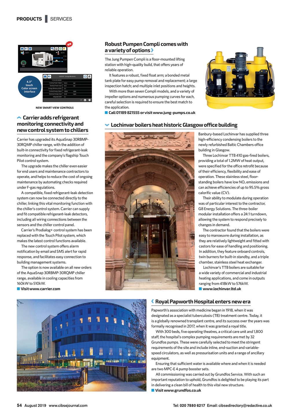 PRODUCTS | SERVICES Robust Pumpen Compli comes with avariety of options Carrier adds refrigerant monitoring connectivity and new control system to chillers Carrier has upgraded its AquaSnap 30RBMP30RQMP chiller range, with the addition of built-in connectivity for fixed refrigerant-leak monitoring and the companys flagship Touch Pilot control system. The upgrade makes the chiller even easier for end users and maintenance contractors to operate, and helps to reduce the cost of ongoing maintenance by automating checks required under F-gas regulations. A compatible, fixed refrigerant-leak detection system can now be connected directly to the chiller, linking this vital monitoring function with the chillers control system. Carrier can supply and fit compatible refrigerant-leak detectors, including all wiring connections between the sensors and the chiller control panel. Carriers Prodialog+ control system has been replaced with the Touch Pilot system, which makes the latest control functions available. The new control system offers alarm notification by email and SMS alert for rapid response, and facilitates easy connection to building management systems. The option is now available on all new orders of the AquaSnap 30RBMP-30RQMP chiller range, available in cooling capacities from 160kW to 510kW. Visit www.carrier.com The Jung Pumpen Compli is a floor-mounted lifting station with high-quality build, that offers years of reliableoperation. It features a robust, fixed float arm; a bonded metal tank plate for easy pump removal and replacement; a large inspection hatch; and multiple inlet positions and heights. With more than seven Compli models, and a variety of impeller options and numerous pumping curves for each, careful selection is required to ensure the best match to theapplication. Call 01189 821555 or visit www.jung-pumps.co.uk Lochinvar boilers heat historic Glasgow office building Banbury-based Lochinvar has supplied three high-efficiency condensing boilers to the newly refurbished Baltic Chambers office building in Glasgow. Three Lochinvar TTB 410 gas-fired boilers, providing a total of 1.2MW of heat output, were specified for the office retrofit because of their efficiency, flexibility and ease of operation. These stainless steel, floorstanding boilers have low NOx emissions and can achieve efficiencies of up to 95.5% gross calorific value (CV). Their ability to modulate during operation was of particular interest to the contractor, G8Energy Solutions. The three-boiler modularinstallation offers a 24:1 turndown, allowing the system to respond precisely to changes in demand. The contractor found that the boilers were easy to manoeuvre during installation, as they are relatively lightweight and fitted with castors for ease of handling and positioning. In addition, they feature onboard controls, twin burners for built-in standby, and a triple chamber, stainless steel heat exchanger. Lochinvars TTB boilers are suitable for a wide variety of commercial and industrial heating applications, and come in outputs ranging from 418kW to 576kW. www.lochinvar.ltd.uk Royal Papworth Hospital enters new era Papworths association with medicine began in 1918, when it was designated as a specialist tuberculosis (TB) treatment centre. Today, it isaglobally renowned transplant centre, and its success over the years was formally recognised in 2017, when it was granted a royal title. With 300 beds, five operating theatres, a critical care unit and 1,800 staff, the hospitals complex pumping requirements are met by 32 Grundfospumps. These were carefully selected to meet the stringent requirements of the site and include inline, end-suction and variablespeed circulators, as well as pressurisation units and a range of ancillary equipment. Ensuring that sufficient water is available where and when it is needed are two MPC-E 4 pump booster sets. All commissioning was carried out by Grundfos Service. With such an important reputation to uphold, Grundfos is delighted to be playing its part in delivering a clean bill of health to this vital new structure. Visit www.grundfos.co.uk 54 August 2019 www.cibsejournal.com CIBSE Aug19 pp53-55 Products.indd 54 Tel: 020 7880 6217 Email: cibsedirectory@redactive.co.uk 19/07/2019 15:07