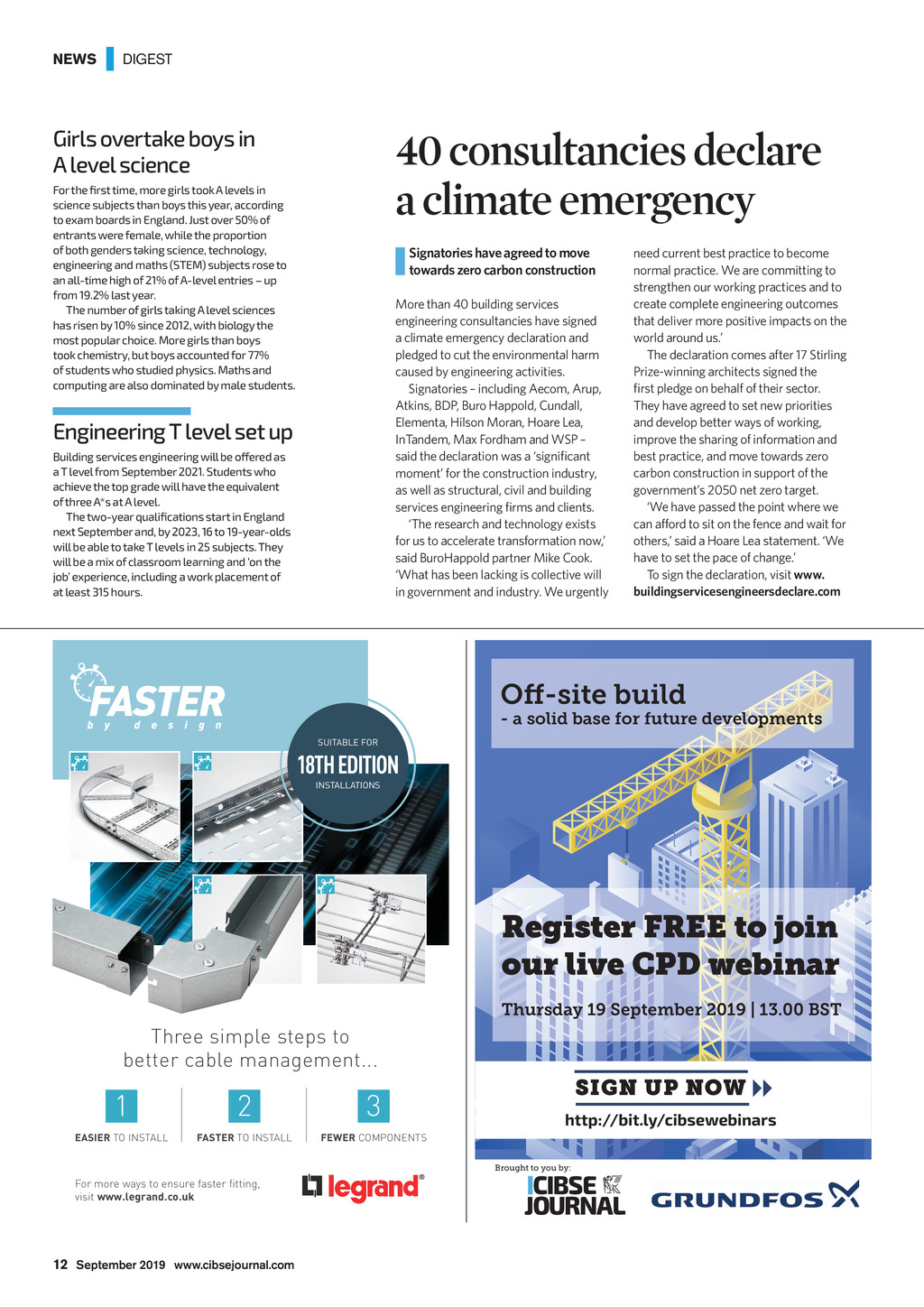 NEWS | DIGEST 40 consultancies declare a climate emergency Girls overtake boys in A level science For the first time, more girls took A levels in science subjects than boys this year, according to exam boards in England. Just over 50% of entrants were female, while the proportion of both genders taking science, technology, engineering and maths (STEM) subjects rose to an all-time high of 21% of A-level entries up from 19.2% last year. The number of girls taking A level sciences has risen by 10% since 2012, with biology the most popular choice. More girls than boys took chemistry, but boys accounted for 77% of students who studied physics. Maths and computing are also dominated by male students. Signatories have agreed to move towards zero carbon construction More than 40 building services engineering consultancies have signed a climate emergency declaration and pledged to cut the environmental harm caused by engineering activities. Signatories including Aecom, Arup, Atkins, BDP, Buro Happold, Cundall, Elementa, Hilson Moran, Hoare Lea, InTandem, Max Fordham and WSP said the declaration was a significant moment for the construction industry, as well as structural, civil and building services engineering firms and clients. The research and technology exists for us to accelerate transformation now, said BuroHappold partner Mike Cook. What has been lacking is collective will in government and industry. We urgently Engineering T level set up Building services engineering will be offered as a T level from September 2021. Students who achieve the top grade will have the equivalent of three A*s at A level. The two-year qualifications start in England next September and, by 2023, 16 to 19-year-olds will be able to take T levels in 25 subjects. They will be a mix of classroom learning and on the job experience, including a work placement of at least 315 hours. need current best practice to become normal practice. We are committing to strengthen our working practices and to create complete engineering outcomes that deliver more positive impacts on the world around us. The declaration comes after 17 Stirling Prize-winning architects signed the first pledge on behalf of their sector. They have agreed to set new priorities and develop better ways of working, improve the sharing of information and best practice, and move towards zero carbon construction in support of the governments 2050 net zero target. We have passed the point where we can afford to sit on the fence and wait for others, said a Hoare Lea statement. We have to set the pace of change. To sign the declaration, visit www. buildingservicesengineersdeclare.com Off-site build b y d e s i g - a solid base for future developments n SUITABLE FOR 18TH EDITION INSTALLATIONS Register FREE to join our live CPD webinar Thursday 19 September 2019 | 13.00 BST Three simple steps to better cable management... 1 2 3 EASIER TO INSTALL FASTER TO INSTALL FEWER COMPONENTS SIGN UP NOW http://bit.ly/cibsewebinars Brought to you by: For more ways to ensure faster fitting, visit www.legrand.co.uk CIBSE JOURNAL 12 September 2019 www.cibsejournal.com CIBSE Sep19 pp12 News.indd 12 23/08/2019 15:06