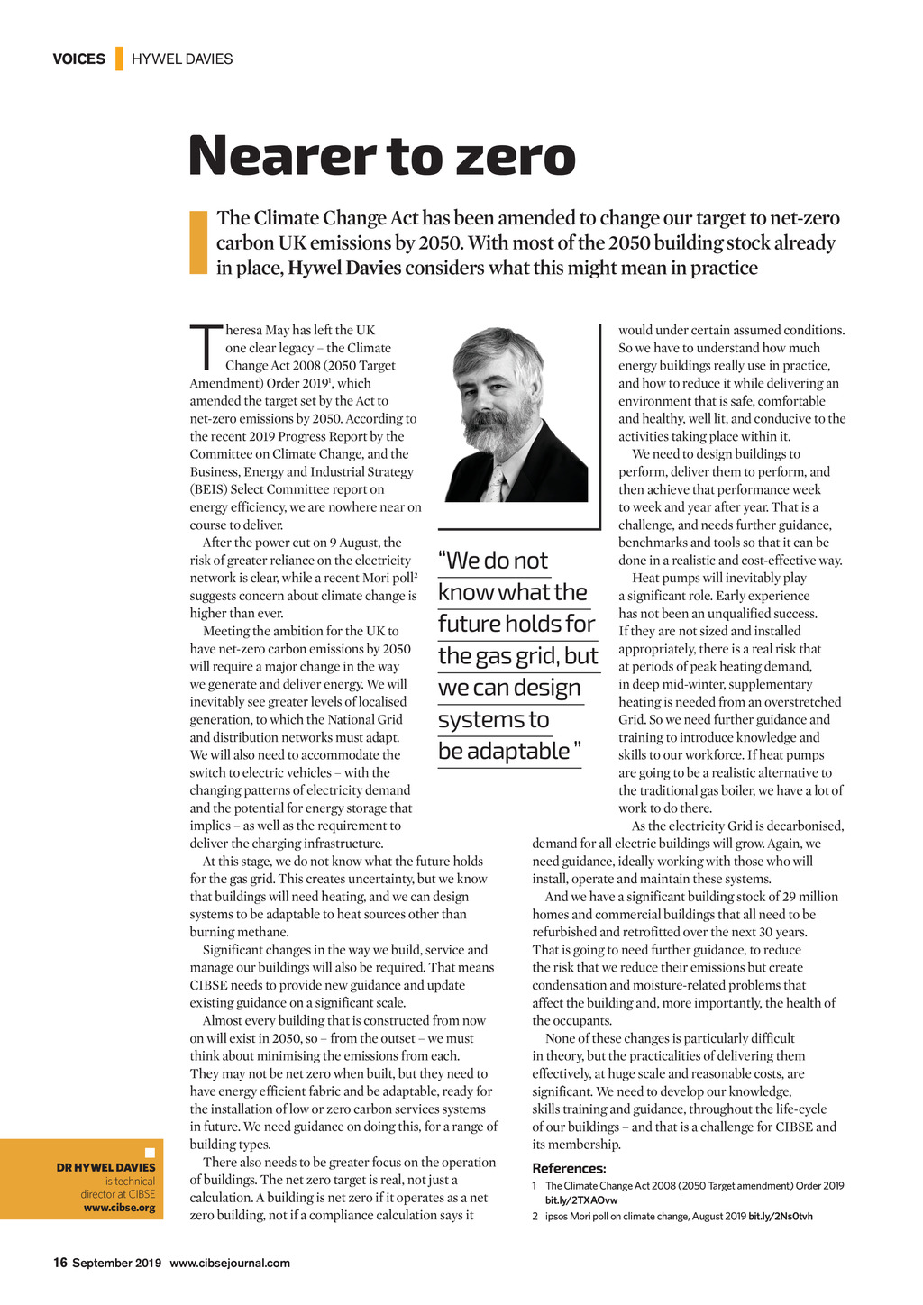 VOICES | HYWEL DAVIES Nearer to zero The Climate Change Act has been amended to change our target to net-zero carbon UK emissions by 2050. With most of the 2050 building stock already in place, Hywel Davies considers what this might mean in practice T heresa May has left the UK one clear legacy the Climate Change Act 2008 (2050 Target Amendment) Order 20191, which amended the target set by the Act to net-zero emissions by 2050. According to the recent 2019 Progress Report by the Committee on Climate Change, and the Business, Energy and Industrial Strategy (BEIS) Select Committee report on energy efficiency, we are nowhere near on course to deliver. After the power cut on 9 August, the risk of greater reliance on the electricity network is clear, while a recent Mori poll2 suggests concern about climate change is higher than ever. Meeting the ambition for the UK to have net-zero carbon emissions by 2050 will require a major change in the way we generate and deliver energy. We will inevitably see greater levels of localised generation, to which the National Grid and distribution networks must adapt. We will also need to accommodate the switch to electric vehicles with the changing patterns of electricity demand and the potential for energy storage that implies as well as the requirement to deliver the charging infrastructure. At this stage, we do not know what the future holds for the gas grid. This creates uncertainty, but we know that buildings will need heating, and we can design systems to be adaptable to heat sources other than burning methane. Significant changes in the way we build, service and manage our buildings will also be required. That means CIBSE needs to provide new guidance and update existing guidance on a significant scale. Almost every building that is constructed from now on will exist in 2050, so from the outset we must think about minimising the emissions from each. They may not be net zero when built, but they need to have energy efficient fabric and be adaptable, ready for the installation of low or zero carbon services systems in future. We need guidance on doing this, for a range of building types. There also needs to be greater focus on the operation of buildings. The net zero target is real, not just a calculation. A building is net zero if it operates as a net zero building, not if a compliance calculation says it would under certain assumed conditions. So we have to understand how much energy buildings really use in practice, and how to reduce it while delivering an environment that is safe, comfortable and healthy, well lit, and conducive to the activities taking place within it. We need to design buildings to perform, deliver them to perform, and then achieve that performance week to week and year after year. That is a challenge, and needs further guidance, benchmarks and tools so that it can be done in a realistic and cost-effective way. Heat pumps will inevitably play a significant role. Early experience has not been an unqualified success. If they are not sized and installed appropriately, there is a real risk that at periods of peak heating demand, in deep mid-winter, supplementary heating is needed from an overstretched Grid. So we need further guidance and training to introduce knowledge and skills to our workforce. If heat pumps are going to be a realistic alternative to the traditional gas boiler, we have a lot of work to do there. As the electricity Grid is decarbonised, demand for all electric buildings will grow. Again, we need guidance, ideally working with those who will install, operate and maintain these systems. And we have a significant building stock of 29 million homes and commercial buildings that all need to be refurbished and retrofitted over the next 30 years. That is going to need further guidance, to reduce the risk that we reduce their emissions but create condensation and moisture-related problems that affect the building and, more importantly, the health of the occupants. None of these changes is particularly difficult in theory, but the practicalities of delivering them effectively, at huge scale and reasonable costs, are significant. We need to develop our knowledge, skills training and guidance, throughout the life-cycle of our buildings and that is a challenge for CIBSE and its membership. We do not know what the future holds for the gas grid, but we can design systems to be adaptable DR HYWEL DAVIES is technical director at CIBSE www.cibse.org References: 1 T he Climate Change Act 2008 (2050 Target amendment) Order 2019 bit.ly/2TXAOvw 2 ipsos Mori poll on climate change, August 2019 bit.ly/2Ns0tvh 16 September 2019 www.cibsejournal.com CIBSE Sep19 pp16-17 Hywel Davies / Patrons.indd 16 23/08/2019 18:26