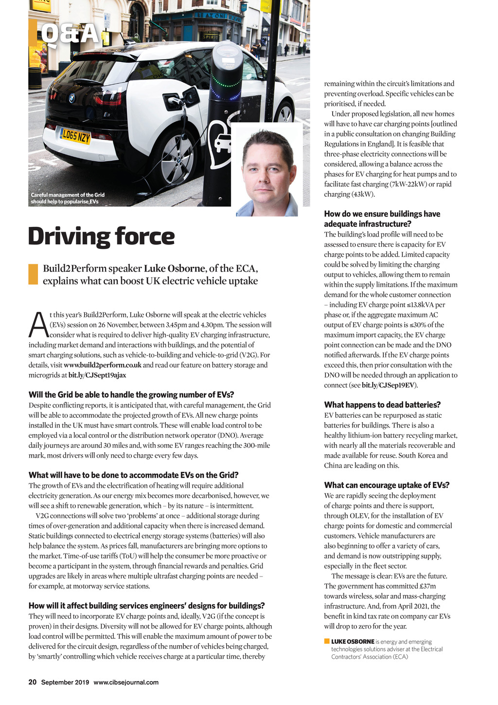 Q&A Careful management of the Grid should help to popularise EVs Driving force Build2Perform speaker Luke Osborne, of the ECA, explains what can boost UK electric vehicle uptake A t this years Build2Perform, Luke Osborne will speak at the electric vehicles (EVs) session on 26 November, between 3.45pm and 4.30pm. The session will consider what is required to deliver high-quality EV charging infrastructure, including market demand and interactions with buildings, and the potential of smart charging solutions, such as vehicle-to-building and vehicle-to-grid (V2G). For details, visit www.build2perform.co.uk and read our feature on battery storage and microgrids at bit.ly/CJSept19ajax Will the Grid be able to handle the growing number of EVs? Despite conflicting reports, it is anticipated that, with careful management, the Grid will be able to accommodate the projected growth of EVs. All new charge points installed in the UK must have smart controls. These will enable load control to be employed via a local control or the distribution network operator (DNO). Average daily journeys are around 30 miles and, with some EV ranges reaching the 300-mile mark, most drivers will only need to charge every few days. What will have to be done to accommodate EVs on the Grid? The growth of EVs and the electrification of heating will require additional electricity generation. As our energy mix becomes more decarbonised, however, we will see a shift to renewable generation, which by its nature is intermittent. V2G connections will solve two problems at once additional storage during times of over-generation and additional capacity when there is increased demand. Static buildings connected to electrical energy storage systems (batteries) will also help balance the system. As prices fall, manufacturers are bringing more options to the market. Time-of-use tariffs (ToU) will help the consumer be more proactive or become a participant in the system, through financial rewards and penalties. Grid upgrades are likely in areas where multiple ultrafast charging points are needed for example, at motorway service stations. How will it affect building services engineers designs for buildings? They will need to incorporate EV charge points and, ideally, V2G (if the concept is proven) in their designs. Diversity will not be allowed for EV charge points, although load control will be permitted. This will enable the maximum amount of power to be delivered for the circuit design, regardless of the number of vehicles being charged, by smartly controlling which vehicle receives charge at a particular time, thereby remaining within the circuits limitations and preventing overload. Specific vehicles can be prioritised, if needed. Under proposed legislation, all new homes will have to have car charging points [outlined in a public consultation on changing Building Regulations in England]. It is feasible that three-phase electricity connections will be considered, allowing a balance across the phases for EV charging for heat pumps and to facilitate fast charging (7kW-22kW) or rapid charging (43kW). How do we ensure buildings have adequate infrastructure? The buildings load profile will need to be assessed to ensure there is capacity for EV charge points to be added. Limited capacity could be solved by limiting the charging output to vehicles, allowing them to remain within the supply limitations. If the maximum demand for the whole customer connection including EV charge point 13.8kVA per phase or, if the aggregate maximum AC output of EV charge points is 30% of the maximum import capacity, the EV charge point connection can be made and the DNO notified afterwards. If the EV charge points exceed this, then prior consultation with the DNO will be needed through an application to connect (see bit.ly/CJSep19EV). What happens to dead batteries? EV batteries can be repurposed as static batteries for buildings. There is also a healthy lithium-ion battery recycling market, with nearly all the materials recoverable and made available for reuse. South Korea and China are leading on this. What can encourage uptake of EVs? We are rapidly seeing the deployment of charge points and there is support, through OLEV, for the installation of EV charge points for domestic and commercial customers. Vehicle manufacturers are also beginning to offer a variety of cars, and demand is now outstripping supply, especially in the fleet sector. The message is clear: EVs are the future. The government has committed 37m towards wireless, solar and mass-charging infrastructure. And, from April 2021, the benefit in kind tax rate on company car EVs will drop to zero for the year. LUKE OSBORNE is energy and emerging technologies solutions adviser at the Electrical Contractors Association (ECA) 20 September 2019 www.cibsejournal.com CIBSE Sep19 pp20-21 Q&A / Overheating.indd 20 23/08/2019 16:19