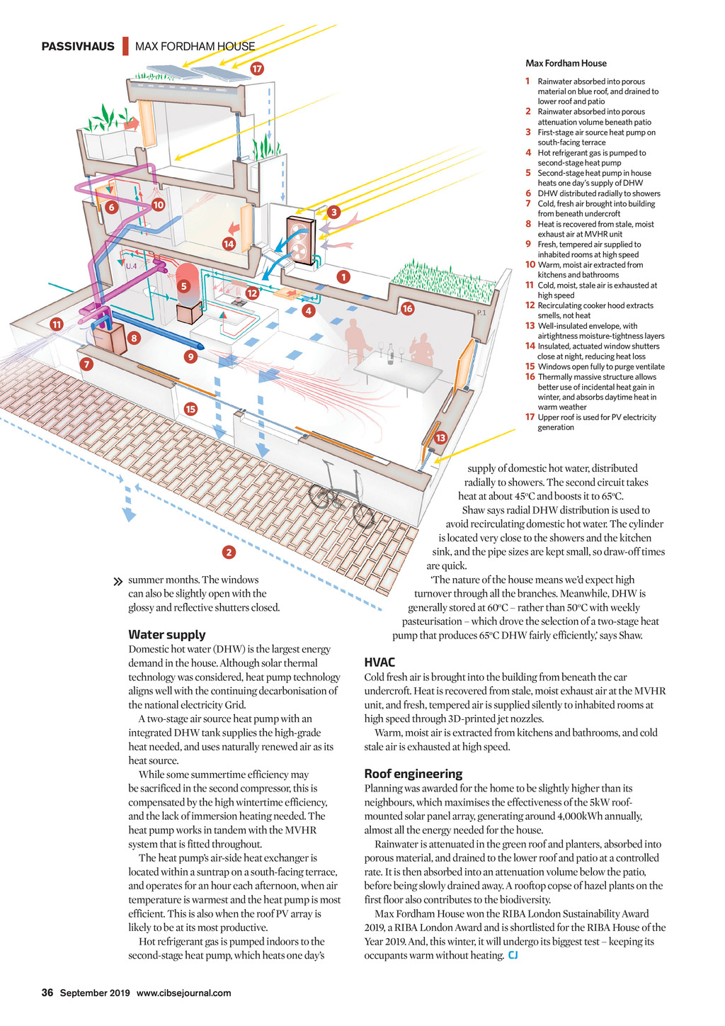 PASSIVHAUS | MAX FORDHAM HOUSE Max Fordham House 1 Rainwater absorbed into porous material on blue roof, and drained to lower roof and patio 2Rainwater absorbed into porous attenuation volume beneath patio 3 First-stage air source heat pump on south-facing terrace 4 Hot refrigerant gas is pumped to second-stage heat pump 5 Second-stage heat pump in house heats one days supply of DHW 6 DHW distributed radially to showers 7 Cold, fresh air brought into building from beneath undercroft 8 Heat is recovered from stale, moist exhaust air at MVHR unit 9 Fresh, tempered air supplied to inhabited rooms at high speed 10 Warm, moist air extracted from kitchens and bathrooms 11 Cold, moist, stale air is exhausted at high speed 12Recirculating cooker hood extracts smells, not heat 13 Well-insulated envelope, with airtightness moisture-tightness layers 14 Insulated, actuated window shutters close at night, reducing heat loss 15 Windows open fully to purge ventilate 16 Thermally massive structure allows better use of incidental heat gain in winter, and absorbs daytime heat in warm weather 17 Upper roof is used for PV electricity generation summer months. The windows can also be slightly open with the glossy and reflective shutters closed. Water supply Domestic hot water (DHW) is the largest energy demand in the house. Although solar thermal technology was considered, heat pump technology aligns well with the continuing decarbonisation of the national electricity Grid. A two-stage air source heat pump with an integrated DHW tank supplies the high-grade heat needed, and uses naturally renewed air as its heat source. While some summertime efficiency may be sacrificed in the second compressor, this is compensated by the high wintertime efficiency, and the lack of immersion heating needed. The heat pump works in tandem with the MVHR system that is fitted throughout. The heat pumps air-side heat exchanger is located within a suntrap on a south-facing terrace, and operates for an hour each afternoon, when air temperature is warmest and the heat pump is most efficient. This is also when the roof PV array is likely to be at its most productive. Hot refrigerant gas is pumped indoors to the second-stage heat pump, which heats one days supply of domestic hot water, distributed radially to showers. The second circuit takes heat at about 45oC and boosts it to 65oC. Shaw says radial DHW distribution is used to avoid recirculating domestic hot water. The cylinder is located very close to the showers and the kitchen sink, and the pipe sizes are kept small, so draw-off times are quick. The nature of the house means wed expect high turnover through all the branches. Meanwhile, DHW is generally stored at 60oC rather than 50oC with weekly pasteurisation which drove the selection of a two-stage heat pump that produces 65oC DHW fairly efficiently, says Shaw. HVAC Cold fresh air is brought into the building from beneath the car undercroft. Heat is recovered from stale, moist exhaust air at the MVHR unit, and fresh, tempered air is supplied silently to inhabited rooms at high speed through 3D-printed jet nozzles. Warm, moist air is extracted from kitchens and bathrooms, and cold stale air is exhausted at high speed. Roof engineering Planning was awarded for the home to be slightly higher than its neighbours, which maximises the effectiveness of the 5kW roofmounted solar panel array, generating around 4,000kWh annually, almost all the energy needed for the house. Rainwater is attenuated in the green roof and planters, absorbed into porous material, and drained to the lower roof and patio at a controlled rate. It is then absorbed into an attenuation volume below the patio, before being slowly drained away. A rooftop copse of hazel plants on the first floor also contributes to the biodiversity. Max Fordham House won the RIBA London Sustainability Award 2019, a RIBA London Award and is shortlisted for the RIBA House of the Year 2019. And, this winter, it will undergo its biggest test keeping its occupants warm without heating. CJ 36 September 2019 www.cibsejournal.com CIBSE Sep19 pp34-36 Max Fordham House.indd 36 23/08/2019 16:31