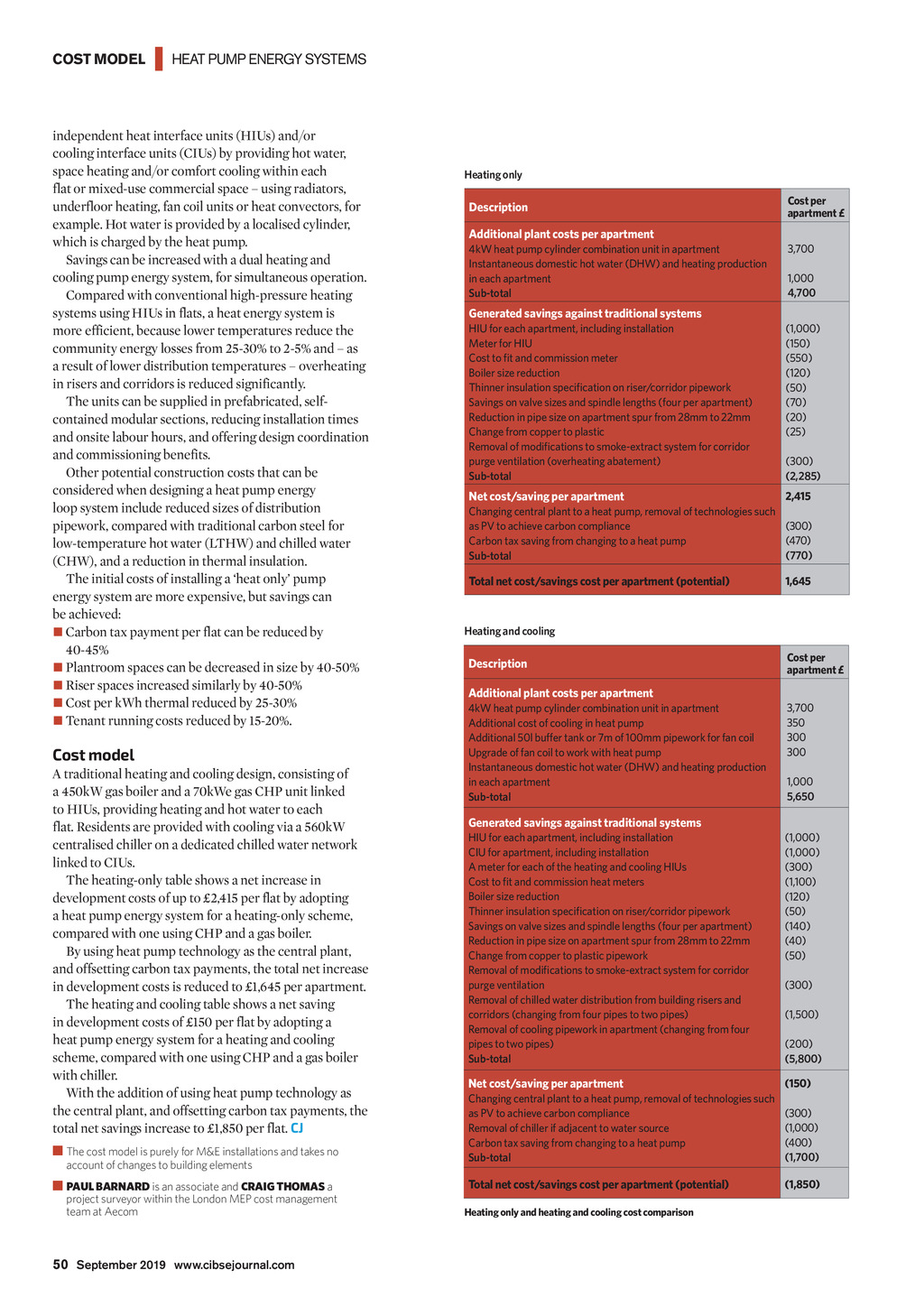 COST MODEL | HEAT PUMP ENERGY SYSTEMS independent heat interface units (HIUs) and/or cooling interface units (CIUs) by providing hot water, space heating and/or comfort cooling within each flat or mixed-use commercial space using radiators, underfloor heating, fan coil units or heat convectors, for example. Hot water is provided by a localised cylinder, which is charged by the heat pump. Savings can be increased with a dual heating and cooling pump energy system, for simultaneous operation. Compared with conventional high-pressure heating systems using HIUs in flats, a heat energy system is more efficient, because lower temperatures reduce the community energy losses from 25-30% to 2-5% and as a result of lower distribution temperatures overheating in risers and corridors is reduced significantly. The units can be supplied in prefabricated, selfcontained modular sections, reducing installation times and onsite labour hours, and offering design coordination and commissioning benefits. Other potential construction costs that can be considered when designing a heat pump energy loop system include reduced sizes of distribution pipework, compared with traditional carbon steel for low-temperature hot water (LTHW) and chilled water (CHW), and a reduction in thermal insulation. The initial costs of installing a heat only pump energy system are more expensive, but savings can be achieved: n Carbon tax payment per flat can be reduced by 40-45% n Plantroom spaces can be decreased in size by 40-50% n Riser spaces increased similarly by 40-50% n Cost per kWh thermal reduced by 25-30% n Tenant running costs reduced by 15-20%. Cost model A traditional heating and cooling design, consisting of a 450kW gas boiler and a 70kWe gas CHP unit linked to HIUs, providing heating and hot water to each flat. Residents are provided with cooling via a 560kW centralised chiller on a dedicated chilled water network linked to CIUs. The heating-only table shows a net increase in development costs of up to 2,415 per flat by adopting a heat pump energy system for a heating-only scheme, compared with one using CHP and a gas boiler. By using heat pump technology as the central plant, and offsetting carbon tax payments, the total net increase in development costs is reduced to 1,645 per apartment. The heating and cooling table shows a net saving in development costs of 150 per flat by adopting a heat pump energy system for a heating and cooling scheme, compared with one using CHP and a gas boiler with chiller. With the addition of using heat pump technology as the central plant, and offsetting carbon tax payments, the total net savings increase to 1,850 per flat. CJ The cost model is purely for M&E installations and takes no account of changes to building elements PAUL BARNARD is an associate and CRAIG THOMAS a project surveyor within the London MEP cost management team at Aecom Heating only Description Cost per apartment Additional plant costs per apartment 4kW heat pump cylinder combination unit in apartment Instantaneous domestic hot water (DHW) and heating production in each apartment Sub-total 3,700 1,000 4,700 Generated savings against traditional systems HIU for each apartment, including installation Meter for HIU Cost to fit and commission meter Boiler size reduction Thinner insulation specification on riser/corridor pipework Savings on valve sizes and spindle lengths (four per apartment) Reduction in pipe size on apartment spur from 28mm to 22mm Change from copper to plastic Removal of modifications to smoke-extract system for corridor purge ventilation (overheating abatement) Sub-total (1,000) (150) (550) (120) (50) (70) (20) (25) (300) (2,285) Net cost/saving per apartment 2,415 Changing central plant to a heat pump, removal of technologies such (300) as PV to achieve carbon compliance (470) Carbon tax saving from changing to a heat pump (770) Sub-total Total net cost/savings cost per apartment (potential) 1,645 Heating and cooling Description Cost per apartment Additional plant costs per apartment 4kW heat pump cylinder combination unit in apartment Additional cost of cooling in heat pump Additional 50l buffer tank or 7m of 100mm pipework for fan coil Upgrade of fan coil to work with heat pump Instantaneous domestic hot water (DHW) and heating production in each apartment Sub-total 3,700 350 300 300 1,000 5,650 Generated savings against traditional systems HIU for each apartment, including installation CIU for apartment, including installation A meter for each of the heating and cooling HIUs Cost to fit and commission heat meters Boiler size reduction Thinner insulation specification on riser/corridor pipework Savings on valve sizes and spindle lengths (four per apartment) Reduction in pipe size on apartment spur from 28mm to 22mm Change from copper to plastic pipework Removal of modifications to smoke-extract system for corridor purge ventilation Removal of chilled water distribution from building risers and corridors (changing from four pipes to two pipes) Removal of cooling pipework in apartment (changing from four pipes to two pipes) Sub-total (1,000) (1,000) (300) (1,100) (120) (50) (140) (40) (50) Net cost/saving per apartment (150) Changing central plant to a heat pump, removal of technologies such as PV to achieve carbon compliance Removal of chiller if adjacent to water source Carbon tax saving from changing to a heat pump Sub-total (300) (1,000) (400) (1,700) Total net cost/savings cost per apartment (potential) (1,850) (300) (1,500) (200) (5,800) Heating only and heating and cooling cost comparison 50 September 2019 www.cibsejournal.com CIBSE Sep19 pp49-50 Cost Model.indd 50 23/08/2019 16:28