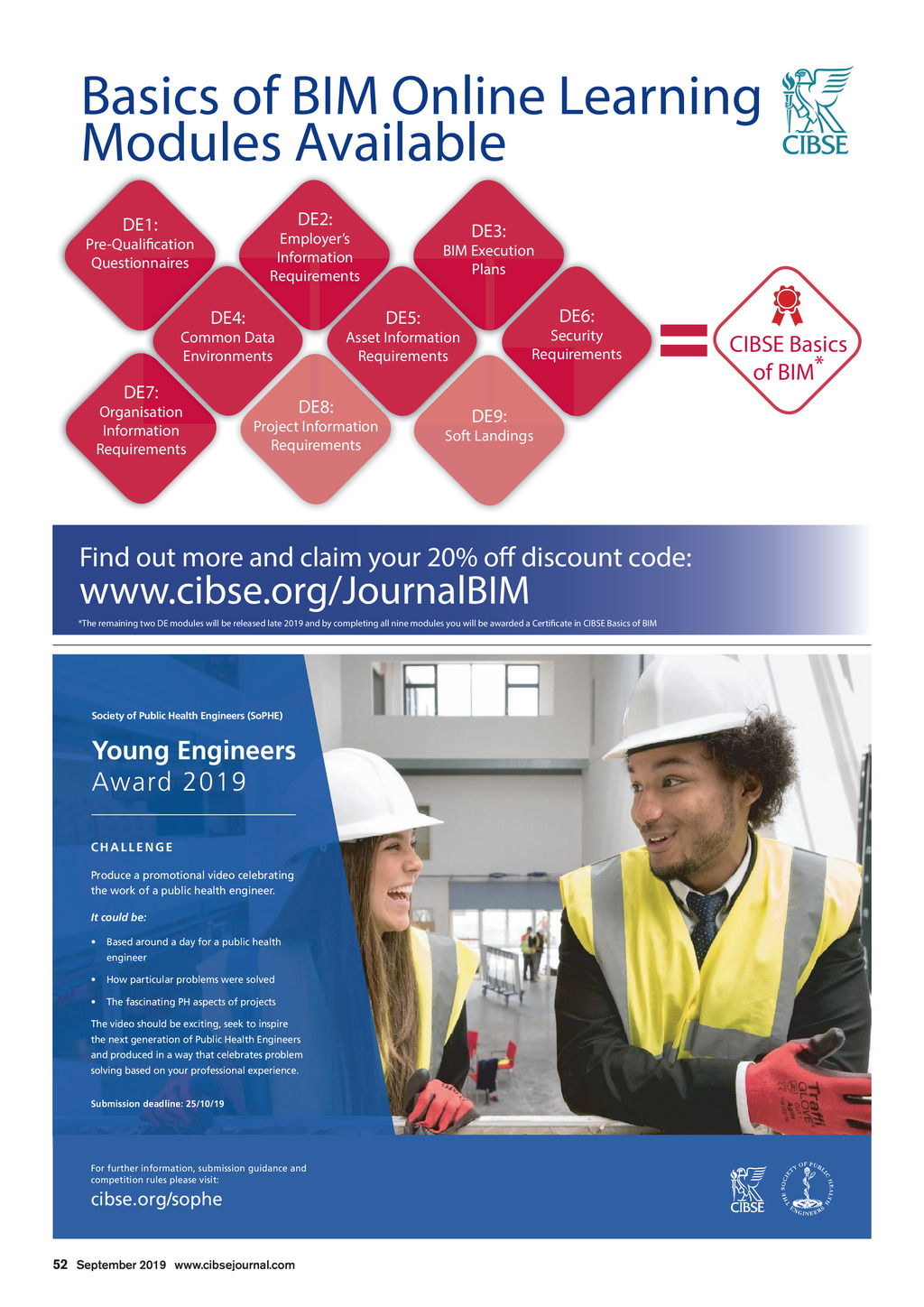 Basics of BIM Online Learning Modules Available DE2: DE1: DE3: Employers Information Requirements Pre-Qualification Questionnaires BIM Execution Plans DE4: DE5: DE6: Common Data Environments Asset Information Requirements Security Requirements DE7: Organisation Information Requirements DE8: Project Information Requirements = CIBSE Basics of BIM* DE9: Soft Landings Find out more and claim your 20% off discount code: www.cibse.org/JournalBIM *The remaining two DE modules will be released late 2019 and by completing all nine modules you will be awarded a Certificate in CIBSE Basics of BIM Society of Public Health Engineers (SoPHE) Young Engineers Award 2019 CHALLENGE Produce a promotional video celebrating the work of a public health engineer. It could be: Based around a day for a public health How particular problems were solved The fascinating PH aspects of projects engineer The video should be exciting, seek to inspire the next generation of Public Health Engineers and produced in a way that celebrates problem solving based on your professional experience. Submission deadline: 25/10/19 For further information, submission guidance and competition rules please visit: cibse.org/sophe 52 September 2019 www.cibsejournal.com p52.CIBSEMagSEPT19.indd 52 20/08/2019 15:08