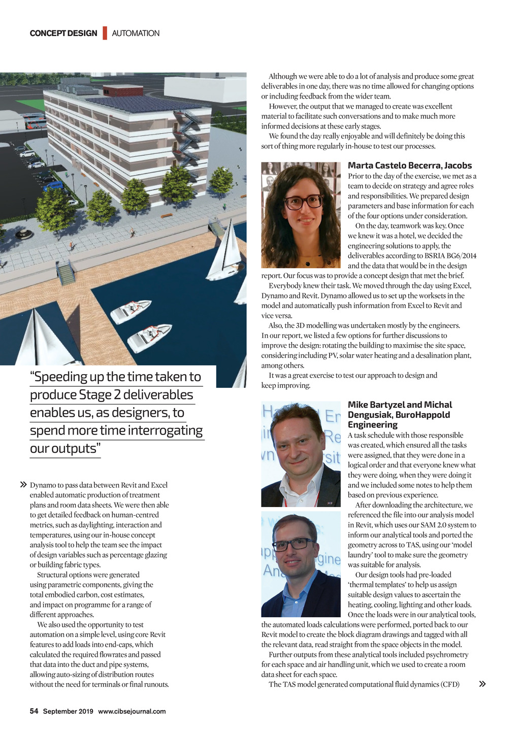 CONCEPT DESIGN | AUTOMATION Although we were able to do a lot of analysis and produce some great deliverables in one day, there was no time allowed for changing options or including feedback from the wider team. However, the output that we managed to create was excellent material to facilitate such conversations and to make much more informed decisions at these early stages. We found the day really enjoyable and will definitely be doing this sort of thing more regularly in-house to test our processes. Marta Castelo Becerra, Jacobs Speeding up the time taken to produce Stage 2 deliverables enables us, as designers, to spend more time interrogating our outputs Dynamo to pass data between Revit and Excel enabled automatic production of treatment plans and room data sheets. We were then able to get detailed feedback on human-centred metrics, such as daylighting, interaction and temperatures, using our in-house concept analysis tool to help the team see the impact of design variables such as percentage glazing or building fabric types. Structural options were generated using parametric components, giving the total embodied carbon, cost estimates, and impact on programme for a range of different approaches. We also used the opportunity to test automation on a simple level, using core Revit features to add loads into end-caps, which calculated the required flowrates and passed that data into the duct and pipe systems, allowing auto-sizing of distribution routes without the need for terminals or final runouts. Prior to the day of the exercise, we met as a team to decide on strategy and agree roles and responsibilities. We prepared design parameters and base information for each of the four options under consideration. On the day, teamwork was key. Once we knew it was a hotel, we decided the engineering solutions to apply, the deliverables according to BSRIA BG6/2014 and the data that would be in the design report. Our focus was to provide a concept design that met the brief. Everybody knew their task. We moved through the day using Excel, Dynamo and Revit. Dynamo allowed us to set up the worksets in the model and automatically push information from Excel to Revit and vice versa. Also, the 3D modelling was undertaken mostly by the engineers. In our report, we listed a few options for further discussions to improve the design: rotating the building to maximise the site space, considering including PV, solar water heating and a desalination plant, among others. It was a great exercise to test our approach to design and keep improving. Mike Bartyzel and Michal Dengusiak, BuroHappold Engineering A task schedule with those responsible was created, which ensured all the tasks were assigned, that they were done in a logical order and that everyone knew what they were doing, when they were doing it and we included some notes to help them based on previous experience. After downloading the architecture, we referenced the file into our analysis model in Revit, which uses our SAM 2.0 system to inform our analytical tools and ported the geometry across to TAS, using our model laundry tool to make sure the geometry was suitable for analysis. Our design tools had pre-loaded thermal templates to help us assign suitable design values to ascertain the heating, cooling, lighting and other loads. Once the loads were in our analytical tools, the automated loads calculations were performed, ported back to our Revit model to create the block diagram drawings and tagged with all the relevant data, read straight from the space objects in the model. Further outputs from these analytical tools included psychrometry for each space and air handling unit, which we used to create a room data sheet for each space. The TAS model generated computational fluid dynamics (CFD) 54 September 2019 www.cibsejournal.com CIBSE Sep19 pp53-54, 56 Concept design.indd 54 23/08/2019 16:52