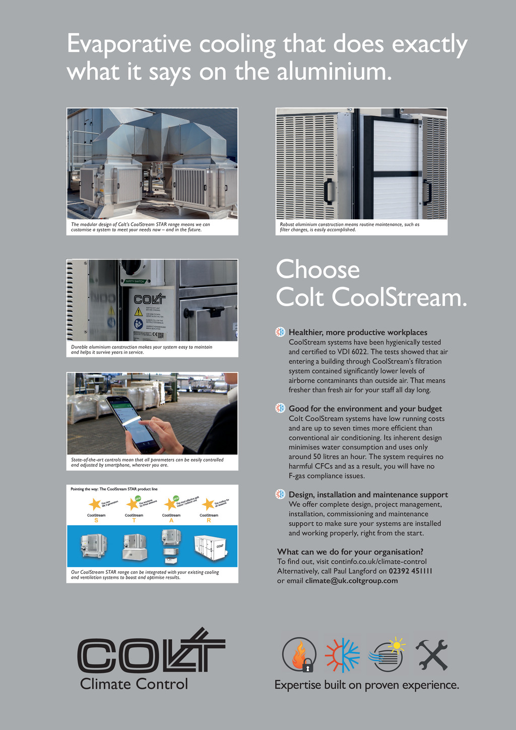 vaporative cooling that does exactly what it says on the aluminium. The modular design of Colts CoolStream STAR range means we can customise a system to meet your needs now and in the future. Robust aluminium construction means routine maintenance, such as PXIVGLERKIWMWIEWMP]EGGSQTPMWLIH Choose Colt CoolStream. Healthier, more productive workplaces Durable aluminium construction makes your system easy to maintain and helps it survive years in service. CoolStream systems have been hygienically tested ERHGIVXMIHXS:(-8LIXIWXWWLS[IHXLEXEMV IRXIVMRKEFYMPHMRKXLVSYKL SSP7XVIEQWPXVEXMSR W]WXIQGSRXEMRIHWMKRMGERXP]PS[IVPIZIPWSJ EMVFSVRIGSRXEQMRERXWXLERSYXWMHIEMV8LEXQIERW JVIWLIVXLERJVIWLEMVJSV]SYVWXEJJEPPHE]PSRK Good for the environment and your budget State-of-the-art controls mean that all parameters can be easily controlled and adjusted by smartphone, wherever you are. Colt CoolStream systems have low running costs ERHEVIYTXSWIZIRXMQIWQSVIIJGMIRXXLER GSRZIRXMSREPEMVGSRHMXMSRMRK-XWMRLIVIRXHIWMKR minimises water consumption and uses only EVSYRHPMXVIWERLSYV8LIW]WXIQVIUYMVIWRS LEVQJYP * WERHEWEVIWYPX]SY[MPPLEZIRS *KEWGSQTPMERGIMWWYIW Design, installation and maintenance support ;ISJJIVGSQTPIXIHIWMKRTVSNIGXQEREKIQIRX MRWXEPPEXMSRGSQQMWWMSRMRKERHQEMRXIRERGI support to make sure your systems are installed ERH[SVOMRKTVSTIVP]VMKLXJVSQXLIWXEVX What can we do for your organisation? Our CoolStream STAR range can be integrated with your existing cooling and ventilation systems to boost and optimise results. Climate Control 8SRHSYXZMWMXGSRXMRJSGSYOGPMQEXIGSRXVSP %PXIVREXMZIP]GEPP4EYP0ERKJSVHSR 02392 451111 or email climate@uk.coltgroup.com Expertise built on proven experience. 6 September 2019 www.cibsejournal.com p06.CIBSEMagSEPT19.indd 6 20/08/2019 14:36