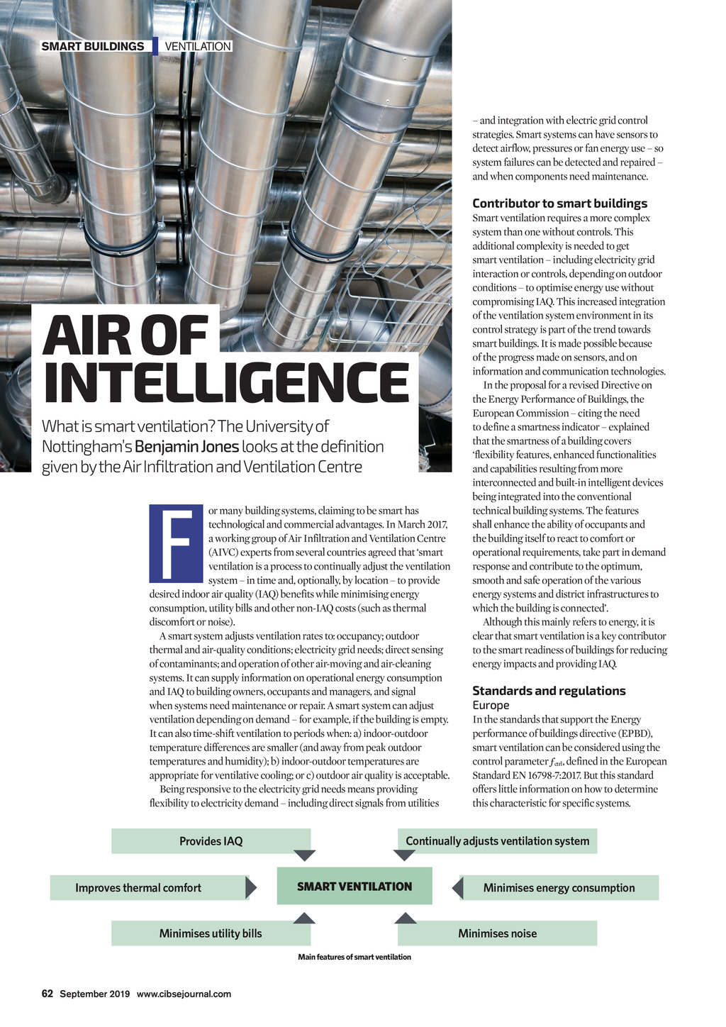 SMART BUILDINGS | VENTILATION and integration with electric grid control strategies. Smart systems can have sensors to detect airflow, pressures or fan energy use so system failures can be detected and repaired and when components need maintenance. Contributor to smart buildings AIR OF INTELLIGENCE What is smart ventilation? The University of Nottinghams Benjamin Jones looks at the definition given by the Air Infiltration and Ventilation Centre F or many building systems, claiming to be smart has technological and commercial advantages. In March 2017, a working group of Air Infiltration and Ventilation Centre (AIVC) experts from several countries agreed that smart ventilation is a process to continually adjust the ventilation system in time and, optionally, by location to provide desired indoor air quality (IAQ) benefits while minimising energy consumption, utility bills and other non-IAQ costs (such as thermal discomfort or noise). A smart system adjusts ventilation rates to: occupancy; outdoor thermal and air-quality conditions; electricity grid needs; direct sensing of contaminants; and operation of other air-moving and air-cleaning systems. It can supply information on operational energy consumption and IAQ to building owners, occupants and managers, and signal when systems need maintenance or repair. A smart system can adjust ventilation depending on demand for example, if the building is empty. It can also time-shift ventilation to periods when: a) indoor-outdoor temperature differences are smaller (and away from peak outdoor temperatures and humidity); b) indoor-outdoor temperatures are appropriate for ventilative cooling; or c) outdoor air quality is acceptable. Being responsive to the electricity grid needs means providing flexibility to electricity demand including direct signals from utilities Provides IAQ Improves thermal comfort Smart ventilation requires a more complex system than one without controls. This additional complexity is needed to get smart ventilation including electricity grid interaction or controls, depending on outdoor conditions to optimise energy use without compromising IAQ. This increased integration of the ventilation system environment in its control strategy is part of the trend towards smart buildings. It is made possible because of the progress made on sensors, and on information and communication technologies. In the proposal for a revised Directive on the Energy Performance of Buildings, the European Commission citing the need to define a smartness indicator explained that the smartness of a building covers flexibility features, enhanced functionalities and capabilities resulting from more interconnected and built-in intelligent devices being integrated into the conventional technical building systems. The features shall enhance the ability of occupants and the building itself to react to comfort or operational requirements, take part in demand response and contribute to the optimum, smooth and safe operation of the various energy systems and district infrastructures to which the building is connected. Although this mainly refers to energy, it is clear that smart ventilation is a key contributor to the smart readiness of buildings for reducing energy impacts and providing IAQ. Standards and regulations Europe In the standards that support the Energy performance of buildings directive (EPBD), smart ventilation can be considered using the control parameter ctrl, defined in the European Standard EN 16798-7:2017. But this standard offers little information on how to determine this characteristic for specific systems. Continually adjusts ventilation system SMART VENTILATION Minimises utility bills Minimises energy consumption Minimises noise Main features of smart ventilation 62 September 2019 www.cibsejournal.com CIBSE Sep19 pp62-63 Smart vent.indd 62 23/08/2019 15:17