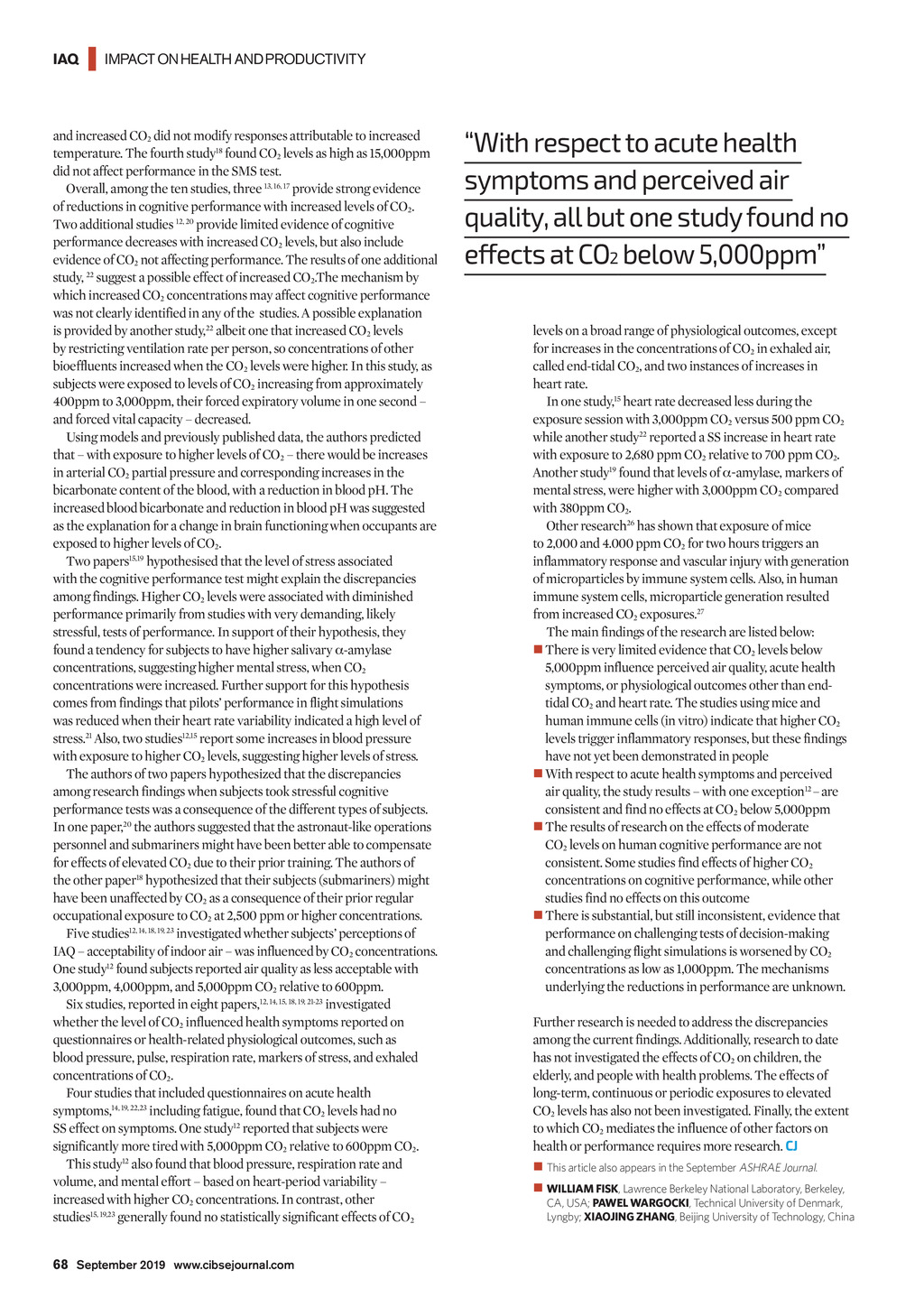IAQ | IMPACT ON HEALTH AND PRODUCTIVITY and increased CO2 did not modify responses attributable to increased temperature. The fourth study18 found CO2 levels as high as 15,000ppm did not affect performance in the SMS test. Overall, among the ten studies, three 13, 16, 17 provide strong evidence of reductions in cognitive performance with increased levels of CO2. Two additional studies 12, 20 provide limited evidence of cognitive performance decreases with increased CO2 levels, but also include evidence of CO2 not affecting performance. The results of one additional study, 22 suggest a possible effect of increased CO2.The mechanism by which increased CO2 concentrations may affect cognitive performance was not clearly identified in any of the studies. A possible explanation is provided by another study,22 albeit one that increased CO2 levels by restricting ventilation rate per person, so concentrations of other bioeffluents increased when the CO2 levels were higher. In this study, as subjects were exposed to levels of CO2 increasing from approximately 400ppm to 3,000ppm, their forced expiratory volume in one second and forced vital capacity decreased. Using models and previously published data, the authors predicted that with exposure to higher levels of CO2 there would be increases in arterial CO2 partial pressure and corresponding increases in the bicarbonate content of the blood, with a reduction in blood pH. The increased blood bicarbonate and reduction in blood pH was suggested as the explanation for a change in brain functioning when occupants are exposed to higher levels of CO2. Two papers15,19 hypothesised that the level of stress associated with the cognitive performance test might explain the discrepancies among findings. Higher CO2 levels were associated with diminished performance primarily from studies with very demanding, likely stressful, tests of performance. In support of their hypothesis, they found a tendency for subjects to have higher salivary -amylase concentrations, suggesting higher mental stress, when CO2 concentrations were increased. Further support for this hypothesis comes from findings that pilots performance in flight simulations was reduced when their heart rate variability indicated a high level of stress.21 Also, two studies12,15 report some increases in blood pressure with exposure to higher CO2 levels, suggesting higher levels of stress. The authors of two papers hypothesized that the discrepancies among research findings when subjects took stressful cognitive performance tests was a consequence of the different types of subjects. In one paper,20 the authors suggested that the astronaut-like operations personnel and submariners might have been better able to compensate for effects of elevated CO2 due to their prior training. The authors of the other paper18 hypothesized that their subjects (submariners) might have been unaffected by CO2 as a consequence of their prior regular occupational exposure to CO2 at 2,500 ppm or higher concentrations. Five studies12, 14, 18, 19, 23 investigated whether subjects perceptions of IAQ acceptability of indoor air was influenced by CO2 concentrations. One study12 found subjects reported air quality as less acceptable with 3,000ppm, 4,000ppm, and 5,000ppm CO2 relative to 600ppm. Six studies, reported in eight papers,12, 14, 15, 18, 19, 21-23 investigated whether the level of CO2 influenced health symptoms reported on questionnaires or health-related physiological outcomes, such as blood pressure, pulse, respiration rate, markers of stress, and exhaled concentrations of CO2. Four studies that included questionnaires on acute health symptoms,14, 19, 22,23 including fatigue, found that CO2 levels had no SS effect on symptoms. One study12 reported that subjects were significantly more tired with 5,000ppm CO2 relative to 600ppm CO2. This study12 also found that blood pressure, respiration rate and volume, and mental effort based on heart-period variability increased with higher CO2 concentrations. In contrast, other studies15, 19,23 generally found no statistically significant effects of CO2 With respect to acute health symptoms and perceived air quality, all but one study found no effects at CO2 below 5,000ppm levels on a broad range of physiological outcomes, except for increases in the concentrations of CO2 in exhaled air, called end-tidal CO2, and two instances of increases in heart rate. In one study,15 heart rate decreased less during the exposure session with 3,000ppm CO2 versus 500 ppm CO2 while another study22 reported a SS increase in heart rate with exposure to 2,680 ppm CO2 relative to 700 ppm CO2. Another study19 found that levels of -amylase, markers of mental stress, were higher with 3,000ppm CO2 compared with 380ppm CO2. Other research26 has shown that exposure of mice to 2,000 and 4.000 ppm CO2 for two hours triggers an inflammatory response and vascular injury with generation of microparticles by immune system cells. Also, in human immune system cells, microparticle generation resulted from increased CO2 exposures.27 The main findings of the research are listed below: There is very limited evidence that CO2 levels below 5,000ppm influence perceived air quality, acute health symptoms, or physiological outcomes other than endtidal CO2 and heart rate. The studies using mice and human immune cells (in vitro) indicate that higher CO2 levels trigger inflammatory responses, but these findings have not yet been demonstrated in people With respect to acute health symptoms and perceived air quality, the study results with one exception12 are consistent and find no effects at CO2 below 5,000ppm The results of research on the effects of moderate CO2 levels on human cognitive performance are not consistent. Some studies find effects of higher CO2 concentrations on cognitive performance, while other studies find no effects on this outcome There is substantial, but still inconsistent, evidence that performance on challengi