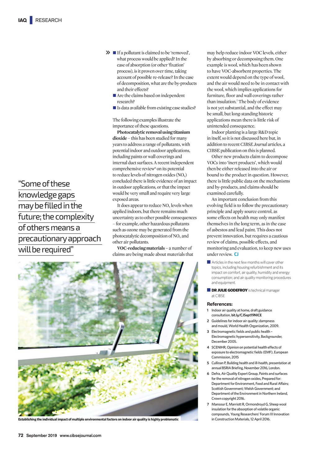 IAQ | RESEARCH n If a pollutant is claimed to be removed, what process would be applied? In the case of absorption (or other fixation process), is it proven over time, taking account of possible re-release? In the case of decomposition, what are the by-products and their effects? n Are the claims based on independent research? n Is data available from existing case studies? Some of these knowledge gaps may be filled in the future; the complexity of others means a precautionary approach will be required The following examples illustrate the importance of these questions. Photocatalytic removal using titanium dioxide this has been studied for many years to address a range of pollutants, with potential indoor and outdoor applications, including paints or wall coverings and internal duct surfaces. A recent independent comprehensive review6 on its potential to reduce levels of nitrogen oxides (NOx) concluded there is little evidence of an impact in outdoor applications, or that the impact would be very small and require very large exposed areas. It does appear to reduce NOx levels when applied indoors, but there remains much uncertainty as to other possible consequences for example, other hazardous pollutants such as ozone may be generated from the photocatalytic decomposition of NOx and other air pollutants. VOC-reducing materials a number of claims are being made about materials that may help reduce indoor VOC levels, either by absorbing or decomposing them. One example is wool, which has been shown to have VOC-absorbent properties. The extent would depend on the type of wool, and the air would need to be in contact with the wool, which implies applications for furniture, floor and wall coverings rather than insulation.7 The body of evidence is not yet substantial, and the effect may be small, but long-standing historic applications mean there is little risk of unintended consequence. Indoor planting is a large R&D topic in itself, so it is not discussed here but, in addition to recent CIBSE Journal articles, a CIBSE publication on this is planned. Other new products claim to decompose VOCs into inert products, which would then be either released into the air or bound to the product in question. However, there is little public data on the mechanisms and by-products, and claims should be examined carefully. An important conclusion from this evolving field is to follow the precautionary principle and apply source control, as some effects on health may only manifest themselves in the long term, as in the case of asbestos and lead paint. This does not prevent innovation, but requires a cautious review of claims, possible effects, and monitoring and evaluation, to keep new uses under review. CJ Articles in the next few months will cover other topics, including housing refurbishment and its impact on comfort, air quality, humidity and energy consumption; and air quality monitoring procedures and equipment. DR JULIE GODEFROY is technical manager at CIBSE References: 1 I ndoor air quality at home, draft guidance consultation, bit.ly/CJSept19NICE 2 Guidelines for indoor air quality: dampness and mould, World Health Organization, 2009. 3 Electromagnetic fields and public health Electromagnetic hypersensitivity, Backgrounder, December 2005. 4 SCENIHR, Opinion on potential health effects of exposure to electromagnetic fields (EMF), European Commission, 2015 5 Cullinan P, Building health and ill-health, presentation at annual BSRIA Briefing, November 2016, London. 6 Defra, Air Quality Expert Group, Paints and surfaces for the removal of nitrogen oxides, Prepared for: Department for Environment, Food and Rural Affairs; Scottish Government; Welsh Government; and Department of the Environment in Northern Ireland, Crown copyright 2016. Establishing the individual impact of multiple environmental factors on indoor air quality is highly problematic 7 Mansour E, Marriott R, Ormondroyd G, Sheep wool insulation for the absorption of volatile organic compounds, Young Researchers Forum III Innovation in Construction Materials, 12 April 2016. 72 September 2019 www.cibsejournal.com CIBSE Sep19 pp70-72 Research Air quality.indd 72 23/08/2019 15:24