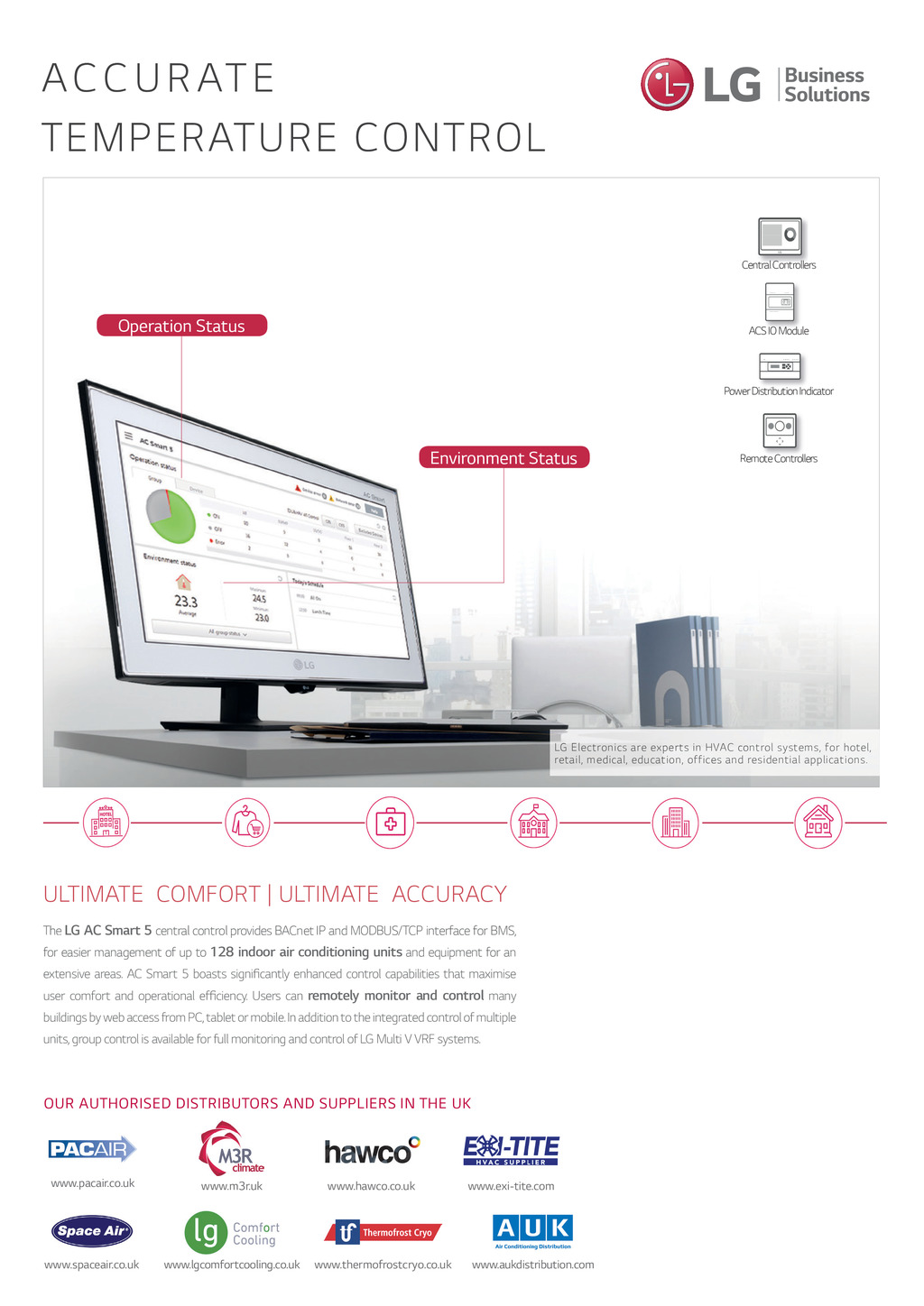 A C C U R AT E TEMPERATURE CONTROL Central Controllers Operation Status ACS IO Module Power Distribution Indicator Environment Status Remote Controllers L El LG Electronics are expper p er ts in HVA HVAC HV C co c ontrol o nt systems, for hotel, retail, medical, educatti t i on, onn of offic fices fic es and re r sidential appli p cations. ULTIMATE COMFORT | ULTIMATE ACCURACY The LG AC Smart 5 central control provides BACnet IP and MODBUS/TCP interface for BMS, for easier management of up to 128 indoor air conditioning units and equipment for an j}yjsxn{jfwjfx/LN^rfwyGgtfxyxxnlsnhfsyq~jsmfshjihtsywtqhfufgnqnynjxymfyrf}nrnxj zxjw htrktwy fsi tujwfyntsfq jkhnjsh~/ `xjwx hfs remotely monitor and controll rfs~ gznqinslxg~|jgfhhjxxkwtr[N0yfgqjytwrtgnqj/Tsfiinyntsytymjnsyjlwfyjihtsywtqtkrzqynuqj zsnyx0lwtzuhtsywtqnxf{fnqfgqjktwkzqqrtsnytwnslfsihtsywtqtkWRXzqynaa]Qx~xyjrx/ OUR AUTHORISED DISTRIBUTORS AND SUPPLIERS IN THE UK www.pacair.co.uk www.m3r.uk 74 September 2019www.lgcomfortcooling.co.uk www.cibsejournal.com www.spaceair.co.uk p74.CIBSEMagSEPT19.indd 74 www.hawco.co.uk www.thermofrostcryo.co.uk www.exi-tite.com www.aukdistribution.com 20/08/2019 15:14