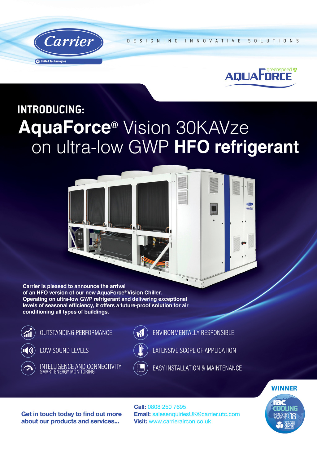AquaForce Vision 30KAVze on ultra-low GWP HFO refrigerant Carrier is pleased to announce the arrival of an HFO version of our new AquaForce Vision Chiller. Operating on ultra-low GWP refrigerant and delivering exceptional levels of seasonal efficiency, it offers a future-proof solution for air conditioning all types of buildings. WINNER 18 82 September 2019 www.cibsejournal.com p82.CIBSEMagSEPT19.indd 82 20/08/2019 15:20