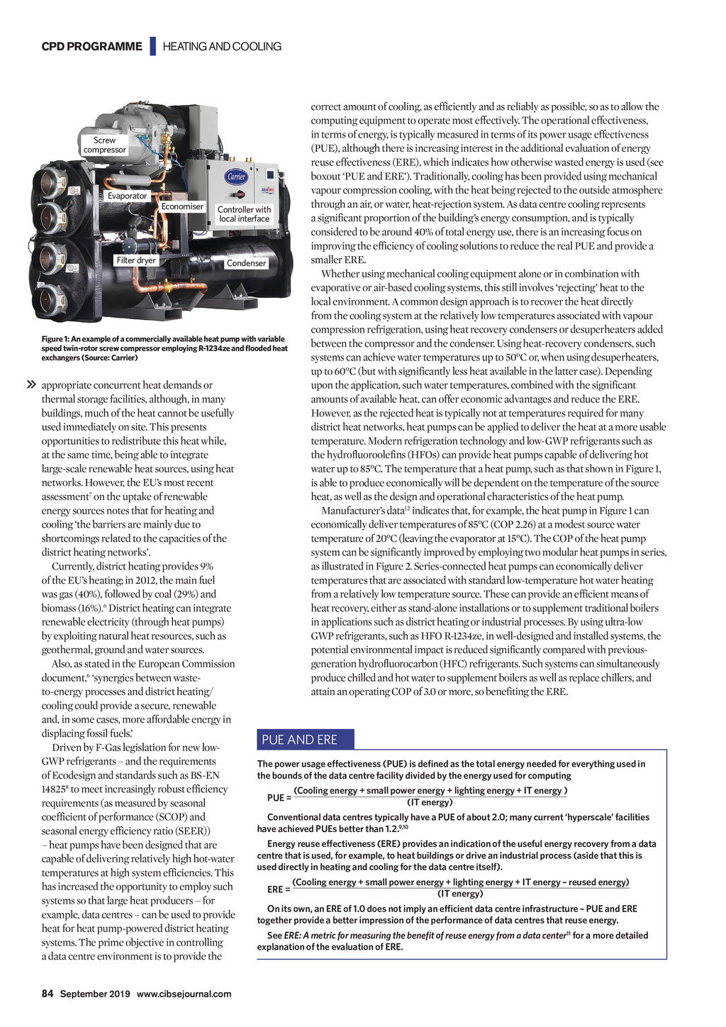 CPD PROGRAMME | HEATING AND COOLING Screw compressor Evaporator Economiser Filter dryer Controller with local interface Condenser Figure 1: An example of a commercially available heat pump with variable speed twin-rotor screw compressor employing R-1234ze and flooded heat exchangers (Source: Carrier) appropriate concurrent heat demands or thermal storage facilities, although, in many buildings, much of the heat cannot be usefully used immediately on site. This presents opportunities to redistribute this heat while, at the same time, being able to integrate large-scale renewable heat sources, using heat networks. However, the EUs most recent assessment7 on the uptake of renewable energy sources notes that for heating and cooling the barriers are mainly due to shortcomings related to the capacities of the district heating networks. Currently, district heating provides 9% of the EUs heating; in 2012, the main fuel was gas (40%), followed by coal (29%) and biomass (16%).6 District heating can integrate renewable electricity (through heat pumps) by exploiting natural heat resources, such as geothermal, ground and water sources. Also, as stated in the European Commission document,6 synergies between wasteto-energy processes and district heating/ cooling could provide a secure, renewable and, in some cases, more affordable energy in displacing fossil fuels. Driven by F-Gas legislation for new lowGWP refrigerants and the requirements of Ecodesign and standards such as BS-EN 148258 to meet increasingly robust efficiency requirements (as measured by seasonal coefficient of performance (SCOP) and seasonal energy efficiency ratio (SEER)) heat pumps have been designed that are capable of delivering relatively high hot-water temperatures at high system efficiencies. This has increased the opportunity to employ such systems so that large heat producers for example, data centres can be used to provide heat for heat pump-powered district heating systems. The prime objective in controlling a data centre environment is to provide the correct amount of cooling, as efficiently and as reliably as possible, so as to allow the computing equipment to operate most effectively. The operational effectiveness, in terms of energy, is typically measured in terms of its power usage effectiveness (PUE), although there is increasing interest in the additional evaluation of energy reuse effectiveness (ERE), which indicates how otherwise wasted energy is used (see boxout PUE and ERE). Traditionally, cooling has been provided using mechanical vapour compression cooling, with the heat being rejected to the outside atmosphere through an air, or water, heat-rejection system. As data centre cooling represents a significant proportion of the buildings energy consumption, and is typically considered to be around 40% of total energy use, there is an increasing focus on improving the efficiency of cooling solutions to reduce the real PUE and provide a smaller ERE. Whether using mechanical cooling equipment alone or in combination with evaporative or air-based cooling systems, this still involves rejecting heat to the local environment. A common design approach is to recover the heat directly from the cooling system at the relatively low temperatures associated with vapour compression refrigeration, using heat recovery condensers or desuperheaters added between the compressor and the condenser. Using heat-recovery condensers, such systems can achieve water temperatures up to 50C or, when using desuperheaters, up to 60C (but with significantly less heat available in the latter case). Depending upon the application, such water temperatures, combined with the significant amounts of available heat, can offer economic advantages and reduce the ERE. However, as the rejected heat is typically not at temperatures required for many district heat networks, heat pumps can be applied to deliver the heat at a more usable temperature. Modern refrigeration technology and low-GWP refrigerants such as the hydrofluoroolefins (HFOs) can provide heat pumps capable of delivering hot water up to 85C. The temperature that a heat pump, such as that shown in Figure 1, is able to produce economically will be dependent on the temperature of the source heat, as well as the design and operational characteristics of the heat pump. Manufacturers data12 indicates that, for example, the heat pump in Figure 1 can economically deliver temperatures of 85C (COP 2.26) at a modest source water temperature of 20C (leaving the evaporator at 15C). The COP of the heat pump system can be significantly improved by employing two modular heat pumps in series, as illustrated in Figure 2. Series-connected heat pumps can economically deliver temperatures that are associated with standard low-temperature hot water heating from a relatively low temperature source. These can provide an efficient means of heat recovery, either as stand-alone installations or to supplement traditional boilers in applications such as district heating or industrial processes. By using ultra-low GWP refrigerants, such as HFO R-1234ze, in well-designed and installed systems, the potential environmental impact is reduced significantly compared with previousgeneration hydrofluorocarbon (HFC) refrigerants. Such systems can simultaneously produce chilled and hot water to supplement boilers as well as replace chillers, and attain an operating COP of 3.0 or more, so benefiting the ERE. PUE AND ERE The power usage effectiveness (PUE) is defined as the total energy needed for everything used in the bounds of the data centre facility divided by the energy used for computing PUE = (Cooling energy + small power energy + lighting energy + IT energy ) (IT energy) Conventional data centres typically have a PUE of about 2.0; many current hyperscale facilities have achieved PUEs better than 1.2.9,10 Energy reuse effectiveness (ERE) provides an indication of the useful energy recovery from a data centre that is used, for ex