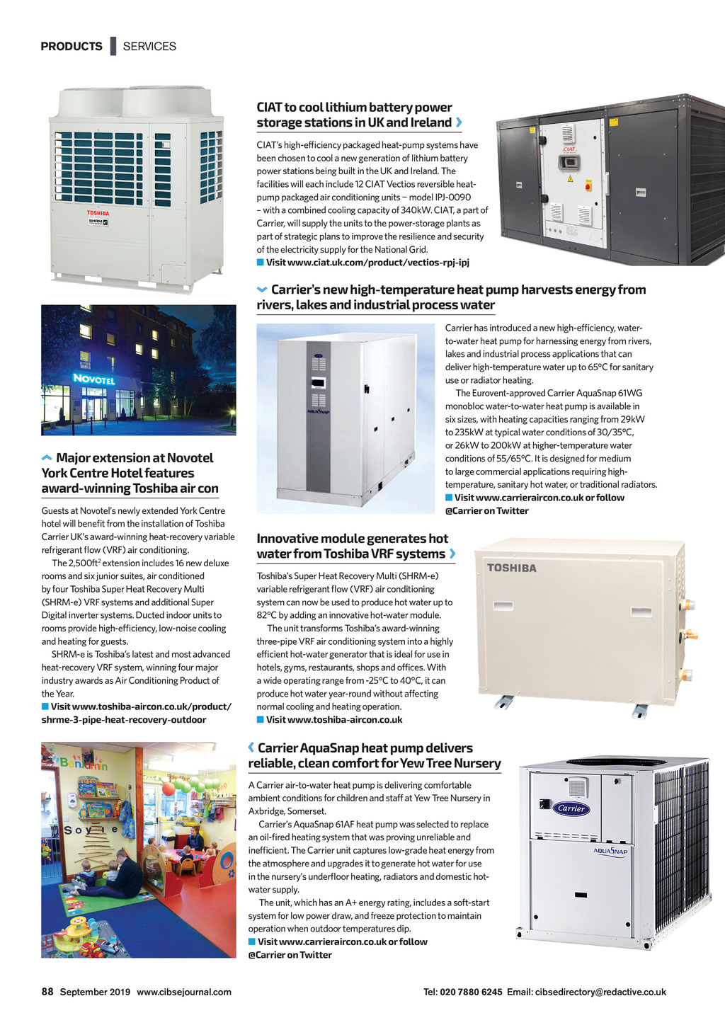 PRODUCTS | SERVICES CIAT to cool lithium battery power storage stations in UK and Ireland CIATs high-efficiency packaged heat-pump systems have been chosen to cool a new generation of lithium battery power stations being built in the UK and Ireland. The facilities will each include 12 CIAT Vectios reversible heatpump packaged air conditioning units model IPJ-0090 with a combined cooling capacity of 340kW. CIAT, a part of Carrier, will supply the units to the power-storage plants as part of strategic plans to improve the resilience and security of the electricity supply for the National Grid. Visit www.ciat.uk.com/product/vectios-rpj-ipj Carriers new high-temperature heat pump harvests energy from rivers, lakes and industrial process water Major extension at Novotel York Centre Hotel features award-winning Toshiba air con Guests at Novotels newly extended York Centre hotel will benefit from the installation of Toshiba Carrier UKs award-winning heat-recovery variable refrigerant flow (VRF) air conditioning. The 2,500ft2 extension includes 16 new deluxe rooms and six junior suites, air conditioned by four Toshiba Super Heat Recovery Multi (SHRM-e) VRF systems and additional Super Digital inverter systems. Ducted indoor units to rooms provide high-efficiency, low-noise cooling and heating for guests. SHRM-e is Toshibas latest and most advanced heat-recovery VRF system, winning four major industry awards as Air Conditioning Product of the Year. Visit www.toshiba-aircon.co.uk/product/ shrme-3-pipe-heat-recovery-outdoor Carrier has introduced a new high-efficiency, waterto-water heat pump for harnessing energy from rivers, lakes and industrial process applications that can deliver high-temperature water up to 65C for sanitary use or radiator heating. The Eurovent-approved Carrier AquaSnap 61WG monobloc water-to-water heat pump is available in six sizes, with heating capacities ranging from 29kW to 235kW at typical water conditions of 30/35C, or 26kW to 200kW at higher-temperature water conditions of 55/65C. It is designed for medium to large commercial applications requiring hightemperature, sanitary hot water, or traditional radiators. Visit www.carrieraircon.co.uk or follow @Carrier on Twitter Innovative module generates hot water from Toshiba VRF systems Toshibas Super Heat Recovery Multi (SHRM-e) variable refrigerant flow (VRF) air conditioning system can now be used to produce hot water up to 82C by adding an innovative hot-water module. The unit transforms Toshibas award-winning three-pipe VRF air conditioning system into a highly efficient hot-water generator that is ideal for use in hotels, gyms, restaurants, shops and offices. With a wide operating range from -25C to 40C, it can produce hot water year-round without affecting normal cooling and heating operation. Visit www.toshiba-aircon.co.uk Carrier AquaSnap heat pump delivers reliable, clean comfort for Yew Tree Nursery A Carrier air-to-water heat pump is delivering comfortable ambient conditions for children and staff at Yew Tree Nursery in Axbridge, Somerset. Carriers AquaSnap 61AF heat pump was selected to replace an oil-fired heating system that was proving unreliable and inefficient. The Carrier unit captures low-grade heat energy from the atmosphere and upgrades it to generate hot water for use in the nurserys underfloor heating, radiators and domestic hotwater supply. The unit, which has an A+ energy rating, includes a soft-start system for low power draw, and freeze protection to maintain operation when outdoor temperatures dip. Visit www.carrieraircon.co.uk or follow @Carrier on Twitter 88 September 2019 www.cibsejournal.com CIBSE Sep19 pp87-91 Products.indd 88 Tel: 020 7880 6245 Email: cibsedirectory@redactive.co.uk 23/08/2019 15:31