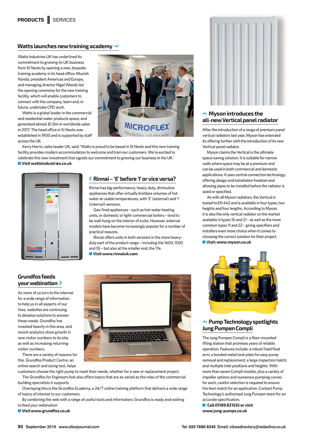 PRODUCTS | SERVICES Watts launches new training academy Watts Industries UK has underlined its commitment to growing its UK business from St Neots by opening a new, bespoke training academy in its head ofce. Munish Nanda, president Americas and Europe, and managing director Nigel Woods led the opening ceremony for the new training facility, which will enable customers to connect with the company, learn and, in future, undertake CPD work. Watts is a global leader in the commercial and residential water products space, and generated almost $1.5bn in worldwide sales in 2017. The head ofce in St Neots was established in 1900 and is supported by staff across the UK. Kerry Harris, sales leader UK, said: Watts is proud to be based in St Neots and this new training facility provides modern accommodation to welcome and train our customers. Were excited to celebrate this new investment that signals our commitment to growing our business in the UK. Visit wattsindustries.co.uk Myson introduces the all-new Vertical panel radiator Rinnai E before I or vice versa? Rinnai has big-performance, heavy-duty, diminutive appliances that offer virtually limitless volumes of hot water at usable temperatures, with E (external) and I (internal) versions. Gas-red appliances such as hot-water heating units, or domestic or light-commercial boilers tend to be wall-hung on the interior of a site. However, external models have become increasingly popular for a number of practical reasons. Rinnai offers units in both versions in the more heavyduty part of the product range including the 1600, 1500 and 55 but also at the smaller end, the 17e. Visit www.rinnaiuk.com After the introduction of a range of premium panel vertical radiators last year, Myson has extended its offering further with the introduction of its new Vertical panel radiator. Myson claims the Vertical is the ultimate space-saving solution. It is suitable for narrow walls where space may be at a premium and can be used in both commercial and domestic applications. It uses central connection technology, offering design and installation freedom and allowing pipes to be installed before the radiator is sized or specied. As with all Myson radiators, the Vertical is tested to EN 442 and is available in four types, two heights and four lengths. According to Myson, it is also the only vertical radiator on the market available in types 10 and 21 as well as the more common types 11 and 22 giving speciers and installers even more choice when it comes to choosing the correct solution for their project. Visit: www.myson.co.uk Grundfos feeds your webination As more of us turn to the internet for a wide range of information to help us in all aspects of our lives, websites are continuing to develop solutions to answer these needs. Grundfos has invested heavily in this area, and recent analytics show growth in new visitor numbers to its site, as well as increasing returning visitor numbers. There are a variety of reasons for this. Grundfos Product Centre, an online search and sizing tool, helps customers choose the right pump to meet their needs, whether for a new or replacement project. The Grundfos for Engineers hub also offers topics that are as varied as the roles of the commercial building specialists it supports. Overlaying this is the Grundfos Ecademy, a 24/7 online training platform that delivers a wide range of topics of interest to our customers. By combining the web with a range of useful tools and information, Grundfos is ready and waiting to feed your webination Visit www.grundfos.co.uk 90 September 2019 www.cibsejournal.com CIBSE Sep19 pp87-91 Products.indd 90 Pump Technology spotlights Jung Pumpen Compli The Jung Pumpen Compli is a oor-mounted lifting station that promises years of reliable operation. Features include: a robust xed oat arm; a bonded metal tank plate for easy pump removal and replacement; a large inspection hatch; and multiple inlet positions and heights. With more than seven Compli models, plus a variety of impeller options and numerous pumping curves for each, careful selection is required to ensure the best match for an application. Contact Pump Technologys authorised Jung Pumpen team for an accurate specication. Call 01189 821555 or visit www.jung-pumps.co.uk Tel: 020 7880 6245 Email: cibsedirectory@redactive.co.uk 23/08/2019 15:31