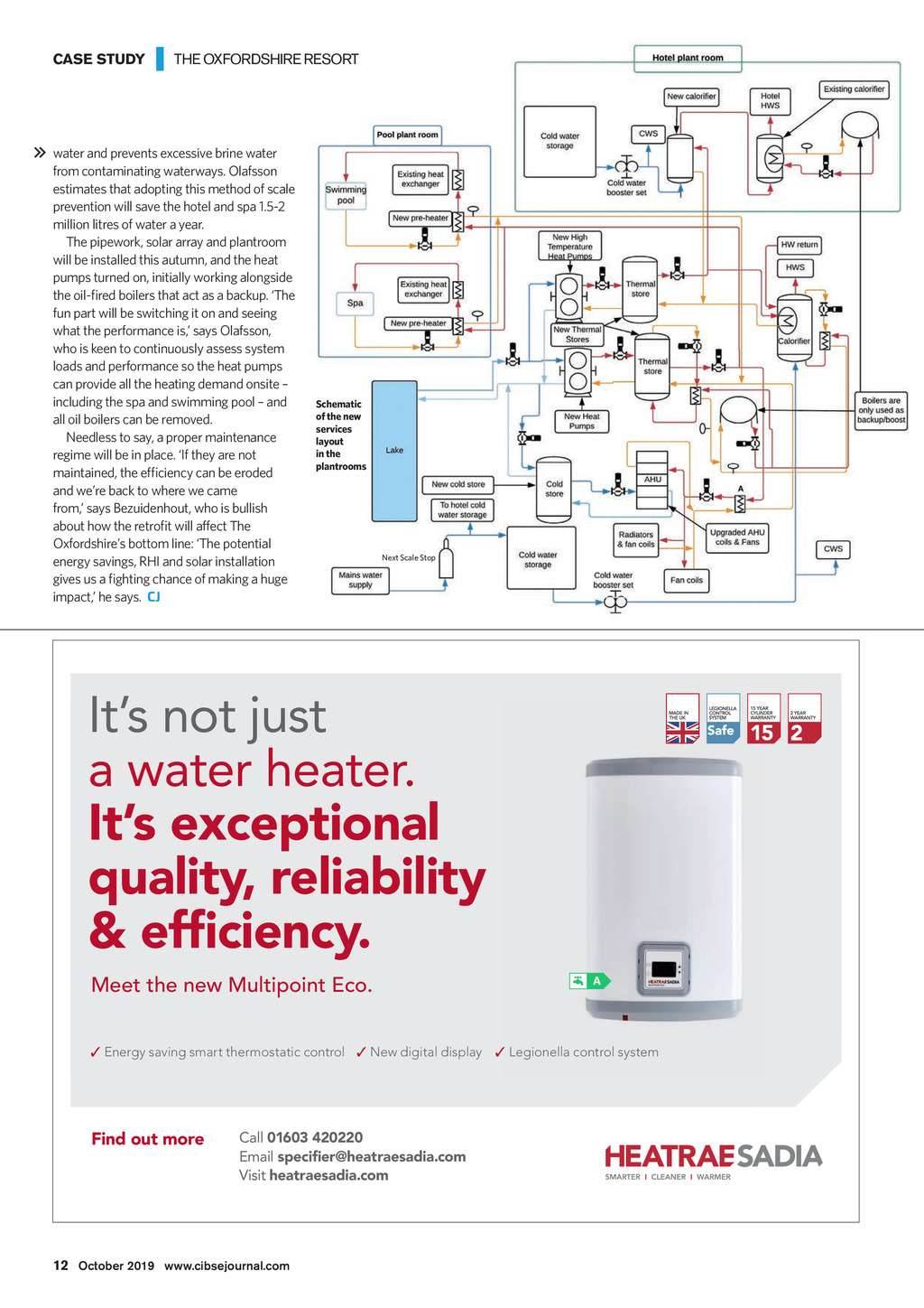 CASE STUDY | THE OXFORDSHIRE RESORT water and prevents excessive brine water from contaminating waterways. Olafsson estimates that adopting this method of scale prevention will save the hotel and spa 1.5-2 million litres of water a year. The pipework, solar array and plantroom will be installed this autumn, and the heat pumps turned on, initially working alongside the oil-red boilers that act as a backup. The fun part will be switching it on and seeing what the performance is, says Olafsson, who is keen to continuously assess system loads and performance so the heat pumps can provide all the heating demand onsite including the spa and swimming pool and all oil boilers can be removed. Needless to say, a proper maintenance regime will be in place. If they are not maintained, the efciency can be eroded and were back to where we came from, says Bezuidenhout, who is bullish about how the retrot will affect The xfordshires bottom line The potential energy savings, RHI and solar installation gives us a ghting chance of making a huge impact, he says. CJ Schematic of the new services layout in the plantrooms Next Scale Stop Its not just a water heater. Its exceptional quality, reliability & efficiency. 15 Meet the new Multipoint Eco. Energy saving smart thermostatic control Find out more New digital display Legionella control system Call 01603 420220 Email specifier@heatraesadia.com Visit heatraesadia.com DEPT_370219_HeatraeSadia_MultipointEco_HalfHoriz_CIBSEJournal.indd 1 10/09/2019 14:44 12 October 2019 www.cibsejournal.com CIBSE Oct19 pp10-13 Oxfordshre hotel Supp.indd 12 20/09/2019 17:36