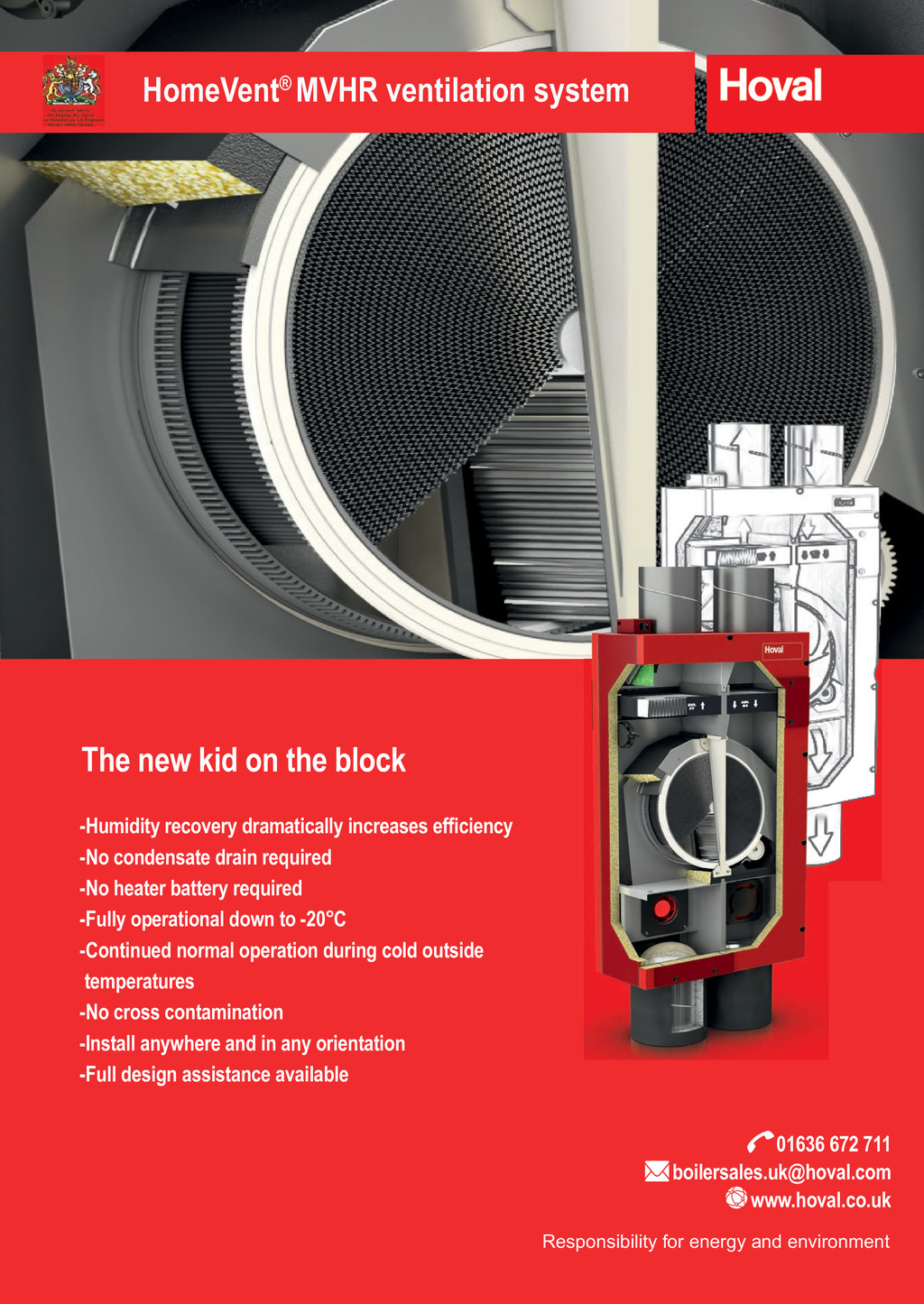 omeVent MVHR ventilation system The new kid on the block +XPLGLW\ UHFRYHU\ GUDPDWLFDOO\ LQFUHDVHV HIFLHQF\ -No condensate drain required -No heater battery required -Fully operational down to -20C -Continued normal operation during cold outside temperatures -No cross contamination -Install anywhere and in any orientation -Full design assistance available 01636 672 711 boilersales.uk@hoval.com www.hoval.co.uk Responsibility for energy and environment 2 October 2019 www.cibsejournal.com p02_CIBSEHOTELOCT19.indd 2 17/09/2019 15:30