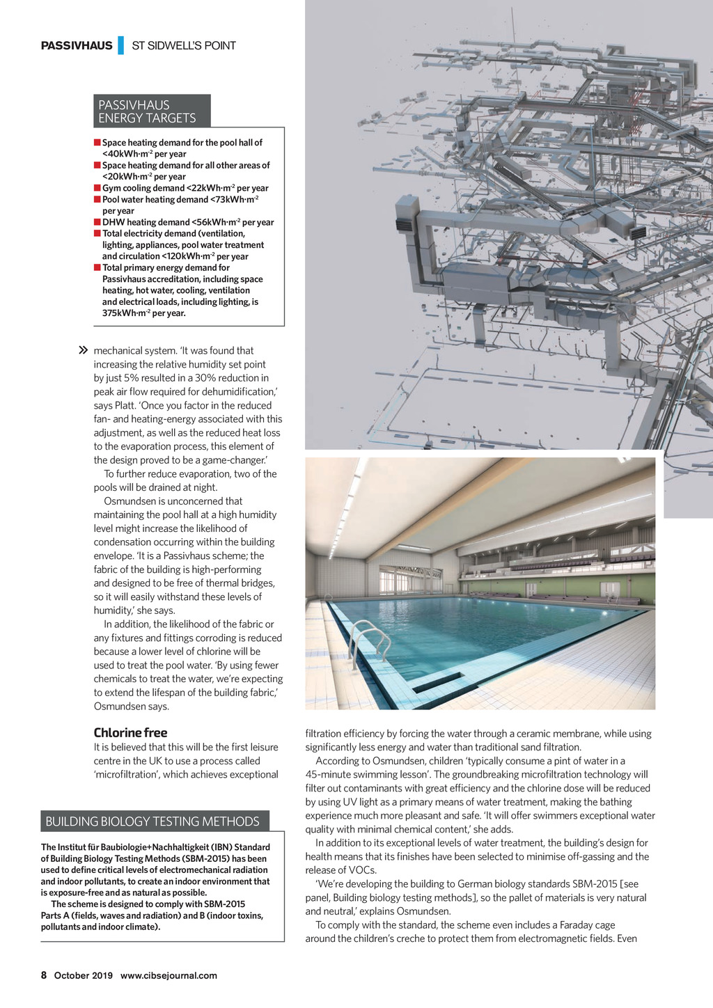 ASSIVHAUS | ST SIDWELLS POINT PASSIVHAUS ENERGY TARGETS pace heating demand for the pool hall of <40kWh.m-2 per year pace heating demand for all other areas of <20kWh.m-2 per year ym cooling demand h.m-2 per year ool water heating demand h.m-2 per year heating demand h.m-2 per year otal electricity demand ventilation, lighting, appliances, pool water treatment and circulation <120kWh.m-2 per year otal primary energy demand for assivhaus accreditation, including space heating, hot water, cooling, ventilation and electrical loads, including lighting, is h.m-2 per year. mechanical system. It was found that increasing the relative humidity set point by just 5% resulted in a 30% reduction in peak air ow required for dehumidication, says Platt. Once you factor in the reduced fan- and heating-energy associated with this ad ustment, as well as the reduced heat loss to the evaporation process, this element of the design proved to be a game-changer. To further reduce evaporation, two of the pools will be drained at night. Osmundsen is unconcerned that maintaining the pool hall at a high humidity level might increase the likelihood of condensation occurring within the building envelope. It is a Passivhaus scheme; the fabric of the building is high-performing and designed to be free of thermal bridges, so it will easily withstand these levels of humidity, she says. In addition, the likelihood of the fabric or any xtures and ttings corroding is reduced because a lower level of chlorine will be used to treat the pool water. By using fewer chemicals to treat the water, were expecting to extend the lifespan of the building fabric, Osmundsen says. Chlorine free It is believed that this will be the rst leisure centre in the UK to use a process called microltration, which achieves exceptional BUILDING BIOLOGY TESTING METHODS The Institut fr Baubiologie+Nachhaltigkeit (IBN) Standard of Building Biology Testing Methods (SBM-2015) has been used to define critical levels of electromechanical radiation and indoor pollutants, to create an indoor environment that is exposure-free and as natural as possible. he scheme is designed to comply with arts fields, waves and radiation and indoor to ins, pollutants and indoor climate . ltration efciency by forcing the water through a ceramic membrane, while using signicantly less energy and water than traditional sand ltration. According to smundsen, children typically consume a pint of water in a 45-minute swimming lesson. The groundbreaking microltration technology will lter out contaminants with great efciency and the chlorine dose will be reduced by using light as a primary means of water treatment, making the bathing experience much more pleasant and safe. It will offer swimmers exceptional water quality with minimal chemical content, she adds. In addition to its exceptional levels of water treatment, the buildings design for health means that its nishes have been selected to minimise off-gassing and the release of VOCs. Were developing the building to erman biology standards SBM-2015 see panel, Building biology testing methods , so the pallet of materials is very natural and neutral, explains smundsen. To comply with the standard, the scheme even includes a Faraday cage around the childrens creche to protect them from electromagnetic elds. Even 8 October 2019 www.cibsejournal.com CIBSE Oct19 pp06-09 Passivhaus pool Supp.indd 8 20/09/2019 13:47