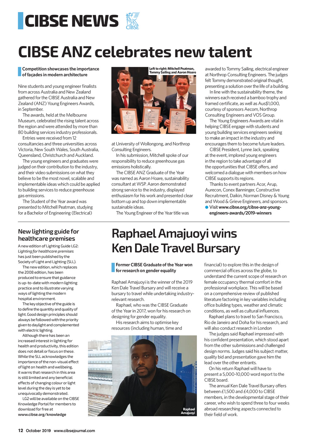 CIBSE NEWS CIBSE ANZ celebrates new talent Competition showcases the importance of faades in modern architecture Nine students and young engineer finalists from across Australia and New ealand gathered for the CIBSE Australia and New ealand AN Young Engineers Awards, in September. The awards, held at the Melbourne Museum, celebrated the rising talent across the region and were attended by more than 0 building services industry professionals. Entries were received from 12 consultancies and three universities across Victoria, New South Wales, South Australia, ueensland, Christchurch and Auckland. The young engineers and graduates were judged on their contribution to the industry, and their video submissions on what they believe to be the most novel, scalable and implementable ideas which could be applied to building services to reduce greenhouse gas emissions. The Student of the Year award was presented to Mitchell Peatman, studying for a Bachelor of Engineering Electrical New lighting guide for healthcare premises A new edition of Lighting Guide LG2: Lighting for healthcare premises has just been published by the Society of Light and Lighting (SLL). The new edition, which replaces the 2008 edition, has been produced to ensure that guidance is up-to-date with modern lighting practice and to illustrate varying ways of lighting the modern hospital environment. The key objective of the guide is to define the quantity and quality of light. Good design principles should always be followed with the priority given to daylight and complemented with electric lighting. Although there has been an increased interest in lighting for health and productivity, this edition does not detail or focus on these. While the SLL acknowledges the importance of the non-visual effect of light on health and wellbeing, it warns that research in this area is still limited and any beneficial effects of changing colour or light level during the day is yet to be unequivocally demonstrated. LG2 will be available on the CIBSE Knowledge Portal for members to download for free at www.cibse.org/knowledge Left to right: Mitchell Peatman, Tommy Sailing and Aaron Hoare at University of Wollongong, and Northrop Consulting Engineers. In his submission, Mitchell spoke of our responsibility to reduce greenhouse gas emissions holistically. The CIBSE AN Graduate of the Year was named as Aaron Hoare, sustainability consultant at WSP. Aaron demonstrated strong service to the industry, displayed enthusiasm for his work and presented clear bottom up and top down implementable sustainable ideas. The Young Engineer of the Year title was awarded to Tommy Sailing, electrical engineer at Northrop Consulting Engineers. The judges felt Tommy demonstrated original thought, presenting a solution over the life of a building. In line with the sustainability theme, the winners each received a bamboo trophy and framed certificate, as well as Aus 1,000, courtesy of sponsors Aecom, Northrop Consulting Engineers and V S Group. The Young Engineers Awards are vital in helping CIBSE engage with students and young building services engineers seeking to make an impact in the industry and encourages them to become future leaders. CIBSE President, Lynne Jack, speaking at the event, implored young engineers in the region to take advantage of all the opportunities that CIBSE offers, and welcomed a dialogue with members on how CIBSE supports its regions. Thanks to event partners Acor, Arup, Aurecon, Conex Banninger, Constructive Recruitment, Daikin, Norman Disney & Young and Wood & Grieve Engineers, and sponsors. Visit www.cibse.org/cibse-anz-youngengineers-awards/2019-winners Raphael Amajuoyi wins Ken Dale Travel Bursary Former CIBSE Graduate of the Year won for research on gender equality Raphael Amajuoyi is the winner of the 2019 en Dale Travel Bursary and will receive a bursary to travel while undertaking industryrelevant research. Raphael, who was the CIBSE Graduate of the Year in 2017, won for his research on designing for gender equality. His research aims to optimise key resources including human, time and Raphael Amajuoyi financial to explore this in the design of commercial offices across the globe, to understand the current scope of research on female occupancy thermal comfort in the professional workplace. This will be based on a comprehensive review of published literature factoring in key variables including office building types, weather and climatic conditions, as well as cultural influences. Raphael plans to travel to San Francisco, Rio de Janeiro and Doha for his research, and will also conduct research in London The judges said Raphael impressed with his confident presentation, which stood apart from the other submissions and challenged design norms. Judges said his subject matter, quality bid and presentation gave him the lead over the other entrants. n his return Raphael will have to present a ,000-10,000 word report to the CIBSE board. The annual en Dale Travel Bursary offers between 1, 00 and ,000 to CIBSE members, in the developmental stage of their career, who wish to spend three to four weeks abroad researching aspects connected to their field of work. 12 October 2019 www.cibsejournal.com CIBSE Oct19 pp12-14 CIBSE News.indd 12 20/09/2019 15:37