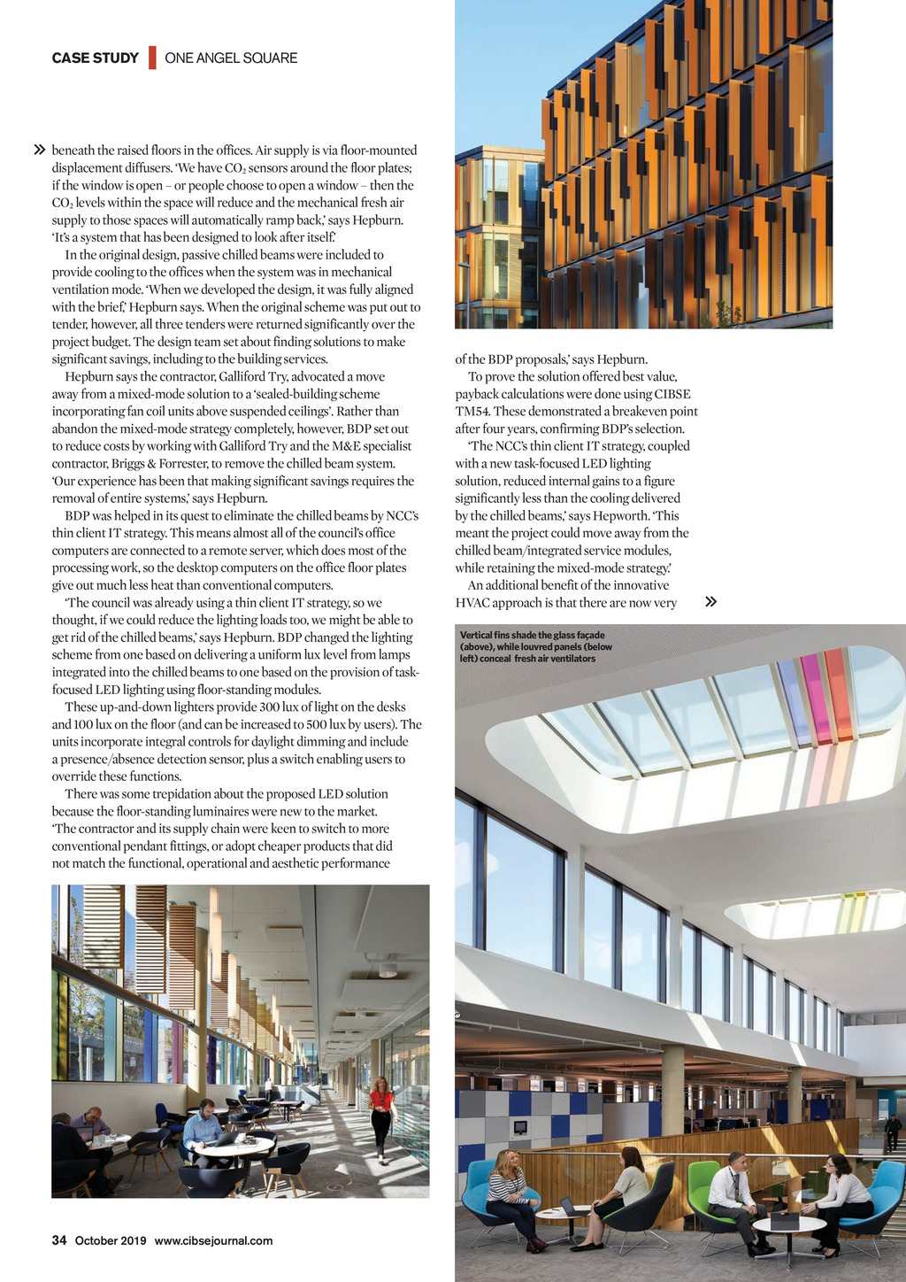 CASE STUDY | ONE ANGEL SQUARE beneath the raised floors in the offices. Air supply is via floor-mounted displacement diffusers. We have CO2 sensors around the floor plates; if the window is open or people choose to open a window then the CO2 levels within the space will reduce and the mechanical fresh air supply to those spaces will automatically ramp back, says Hepburn. Its a system that has been designed to look after itself. In the original design, passive chilled beams were included to provide cooling to the offices when the system was in mechanical ventilation mode. When we developed the design, it was fully aligned with the brief, Hepburn says. When the original scheme was put out to tender, however, all three tenders were returned significantly over the project budget. The design team set about finding solutions to make significant savings, including to the building services. Hepburn says the contractor, Galliford Try, advocated a move away from a mixed-mode solution to a sealed-building scheme incorporating fan coil units above suspended ceilings. Rather than abandon the mixed-mode strategy completely, however, BDP set out to reduce costs by working with Galliford Try and the M&E specialist contractor, Briggs & Forrester, to remove the chilled beam system. Our experience has been that making significant savings requires the removal of entire systems, says Hepburn. BDP was helped in its quest to eliminate the chilled beams by NCCs thin client IT strategy. This means almost all of the councils office computers are connected to a remote server, which does most of the processing work, so the desktop computers on the office floor plates give out much less heat than conventional computers. The council was already using a thin client IT strategy, so we thought, if we could reduce the lighting loads too, we might be able to get rid of the chilled beams, says Hepburn. BDP changed the lighting scheme from one based on delivering a uniform lux level from lamps integrated into the chilled beams to one based on the provision of taskfocused LED lighting using floor-standing modules. These up-and-down lighters provide 300 lux of light on the desks and 100 lux on the floor (and can be increased to 500 lux by users). The units incorporate integral controls for daylight dimming and include a presence/absence detection sensor, plus a switch enabling users to override these functions. There was some trepidation about the proposed LED solution because the floor-standing luminaires were new to the market. The contractor and its supply chain were keen to switch to more conventional pendant fittings, or adopt cheaper products that did not match the functional, operational and aesthetic performance of the BDP proposals, says Hepburn. To prove the solution offered best value, payback calculations were done using CIBSE TM54. These demonstrated a breakeven point after four years, confirming BDPs selection. The NCCs thin client IT strategy, coupled with a new task-focused LED lighting solution, reduced internal gains to a figure significantly less than the cooling delivered by the chilled beams, says Hepworth. This meant the project could move away from the chilled beam/integrated service modules, while retaining the mixed-mode strategy. An additional benefit of the innovative HVAC approach is that there are now very ertical ns shade the glass fa ade (above) while louvred panels (below left) conceal fresh air ventilators 34 October 2019 www.cibsejournal.com CIBSE Oct19 pp32-34, 36 One Angel Square.indd 34 20/09/2019 16:52