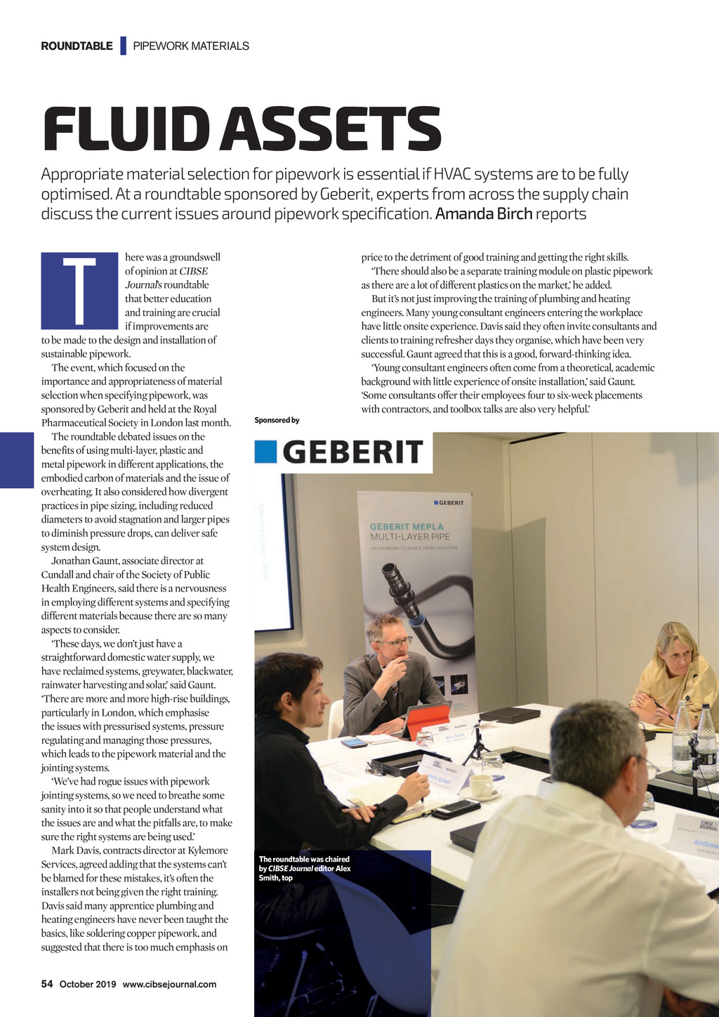 ROUNDTABLE | PIPEWORK MATERIALS FLUID ASSETS Appropriate material selection for pipework is essential if HVAC systems are to be fully optimised. At a roundtable sponsored by Geberit, experts from across the supply chain discuss the current issues around pipework specification. Amanda Birch reports T here was a groundswell of opinion at CIBSE Journals roundtable that better education and training are crucial if improvements are to be made to the design and installation of sustainable pipework. The event, which focused on the importance and appropriateness of material selection when specifying pipework, was sponsored by Geberit and held at the Royal Pharmaceutical Society in London last month. The roundtable debated issues on the benefits of using multi-layer, plastic and metal pipework in different applications, the embodied carbon of materials and the issue of overheating. It also considered how divergent practices in pipe sizing, including reduced diameters to avoid stagnation and larger pipes to diminish pressure drops, can deliver safe system design. Jonathan Gaunt, associate director at Cundall and chair of the Society of Public Health Engineers, said there is a nervousness in employing different systems and specifying different materials because there are so many aspects to consider. These days, we dont just have a straightforward domestic water supply, we have reclaimed systems, greywater, blackwater, rainwater harvesting and solar, said Gaunt. There are more and more high-rise buildings, particularly in London, which emphasise the issues with pressurised systems, pressure regulating and managing those pressures, which leads to the pipework material and the jointing systems. Weve had rogue issues with pipework jointing systems, so we need to breathe some sanity into it so that people understand what the issues are and what the pitfalls are, to make sure the right systems are being used. Mark Davis, contracts director at Kylemore Services, agreed adding that the systems cant be blamed for these mistakes, its often the installers not being given the right training. Davis said many apprentice plumbing and heating engineers have never been taught the basics, like soldering copper pipework, and suggested that there is too much emphasis on Sponsored by price to the detriment of good training and getting the right skills. There should also be a separate training module on plastic pipework as there are a lot of different plastics on the market, he added. But its not just improving the training of plumbing and heating engineers. Many young consultant engineers entering the workplace have little onsite experience. Davis said they often invite consultants and clients to training refresher days they organise, which have been very successful. Gaunt agreed that this is a good, forward-thinking idea. Young consultant engineers often come from a theoretical, academic background with little experience of onsite installation, said Gaunt. Some consultants offer their employees four to six-week placements with contractors, and toolbox talks are also very helpful. The roundtable was chaired by CIBSE Journal editor Alex Smith, top 54 October 2019 www.cibsejournal.com CIBSE Oct19 pp54-56, 58 Roundtable.indd 54 20/09/2019 16:07