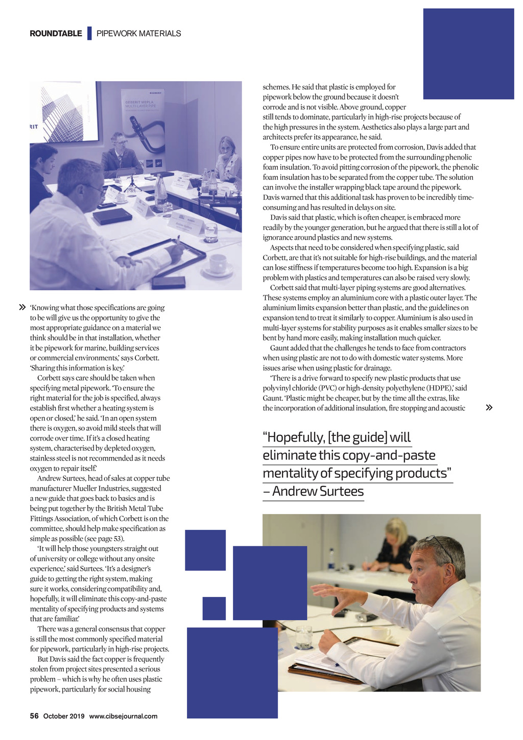 ROUNDTABLE | PIPEWORK MATERIALS Knowing what those specifications are going to be will give us the opportunity to give the most appropriate guidance on a material we think should be in that installation, whether it be pipework for marine, building services or commercial environments, says Corbett. Sharing this information is key. Corbett says care should be taken when specifying metal pipework. To ensure the right material for the job is specified, always establish first whether a heating system is open or closed, he said. In an open system there is oxygen, so avoid mild steels that will corrode over time. If its a closed heating system, characterised by depleted oxygen, stainless steel is not recommended as it needs oxygen to repair itself. Andrew Surtees, head of sales at copper tube manufacturer Mueller Industries, suggested a new guide that goes back to basics and is being put together by the British Metal Tube Fittings Association, of which Corbett is on the committee, should help make specification as simple as possible (see page 53). It will help those youngsters straight out of university or college without any onsite experience, said Surtees. Its a designers guide to getting the right system, making sure it works, considering compatibility and, hopefully, it will eliminate this copy-and-paste mentality of specifying products and systems that are familiar. There was a general consensus that copper is still the most commonly specified material for pipework, particularly in high-rise projects. But Davis said the fact copper is frequently stolen from project sites presented a serious problem which is why he often uses plastic pipework, particularly for social housing schemes. He said that plastic is employed for pipework below the ground because it doesnt corrode and is not visible. Above ground, copper still tends to dominate, particularly in high-rise projects because of the high pressures in the system. Aesthetics also plays a large part and architects prefer its appearance, he said. To ensure entire units are protected from corrosion, Davis added that copper pipes now have to be protected from the surrounding phenolic foam insulation. To avoid pitting corrosion of the pipework, the phenolic foam insulation has to be separated from the copper tube. The solution can involve the installer wrapping black tape around the pipework. Davis warned that this additional task has proven to be incredibly timeconsuming and has resulted in delays on site. Davis said that plastic, which is often cheaper, is embraced more readily by the younger generation, but he argued that there is still a lot of ignorance around plastics and new systems. Aspects that need to be considered when specifying plastic, said Corbett, are that its not suitable for high-rise buildings, and the material can lose stiffness if temperatures become too high. Expansion is a big problem with plastics and temperatures can also be raised very slowly. Corbett said that multi-layer piping systems are good alternatives. These systems employ an aluminium core with a plastic outer layer. The aluminium limits expansion better than plastic, and the guidelines on expansion tend to treat it similarly to copper. Aluminium is also used in multi-layer systems for stability purposes as it enables smaller sizes to be bent by hand more easily, making installation much quicker. Gaunt added that the challenges he tends to face from contractors when using plastic are not to do with domestic water systems. More issues arise when using plastic for drainage. There is a drive forward to specify new plastic products that use polyvinyl chloride (PVC) or high-density polyethylene (HDPE), said Gaunt. Plastic might be cheaper, but by the time all the extras, like the incorporation of additional insulation, fire stopping and acoustic Hopefully, [the guide] will eliminate this copy-and-paste mentality of specifying products Andrew Surtees 56 October 2019 www.cibsejournal.com CIBSE Oct19 pp54-56, 58 Roundtable.indd 56 20/09/2019 16:07