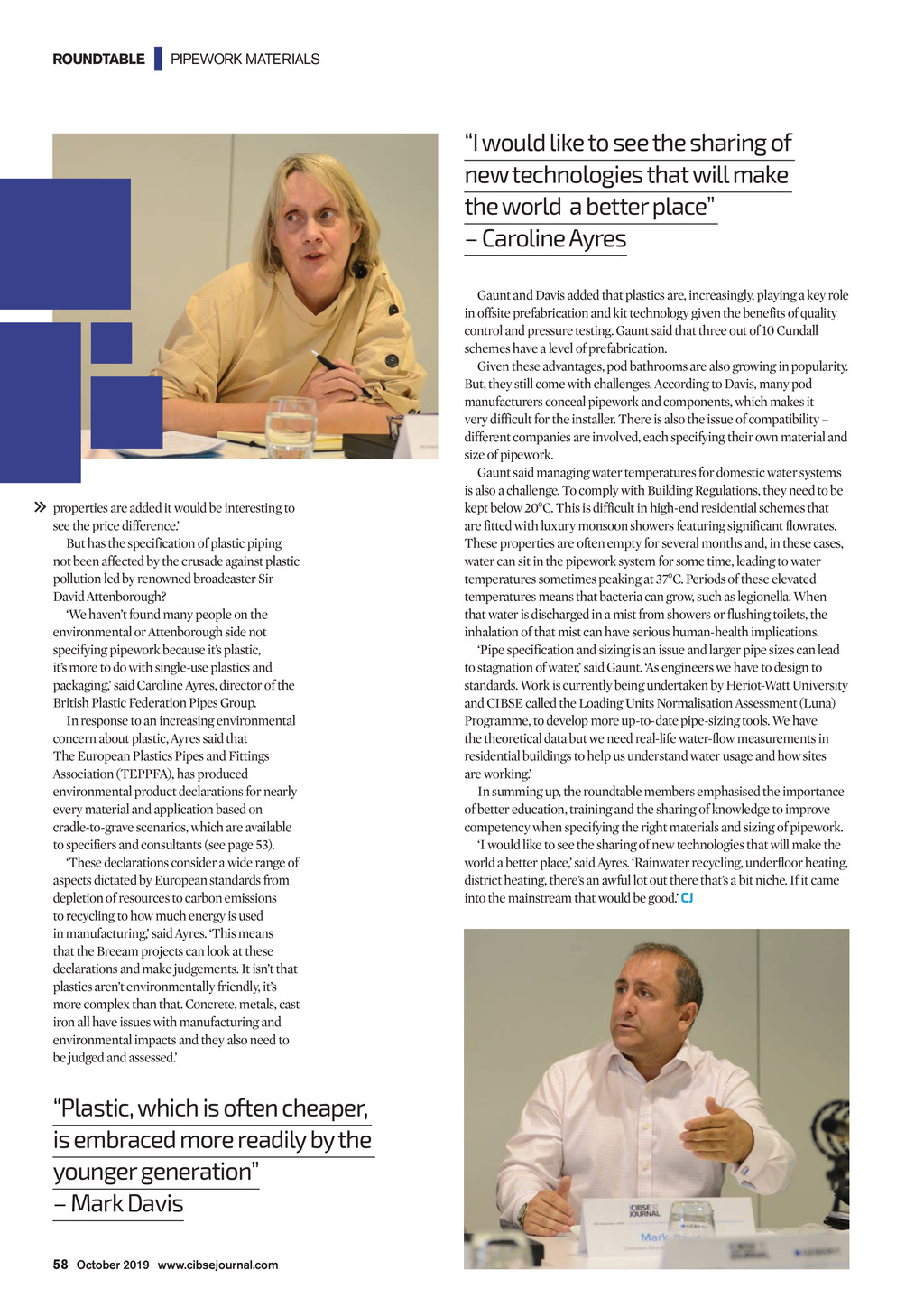ROUNDTABLE | PIPEWORK MATERIALS I would like to see the sharing of new technologies that will make the world a better place Caroline Ayres properties are added it would be interesting to see the price difference. But has the specification of plastic piping not been affected by the crusade against plastic pollution led by renowned broadcaster Sir David Attenborough? We havent found many people on the environmental or Attenborough side not specifying pipework because its plastic, its more to do with single-use plastics and packaging, said Caroline Ayres, director of the British Plastic Federation Pipes Group. In response to an increasing environmental concern about plastic, Ayres said that The European Plastics Pipes and Fittings Association (TEPPFA), has produced environmental product declarations for nearly every material and application based on cradle-to-grave scenarios, which are available to specifiers and consultants (see page 53). These declarations consider a wide range of aspects dictated by European standards from depletion of resources to carbon emissions to recycling to how much energy is used in manufacturing, said Ayres. This means that the Breeam projects can look at these declarations and make judgements. It isnt that plastics arent environmentally friendly, its more complex than that. Concrete, metals, cast iron all have issues with manufacturing and environmental impacts and they also need to be judged and assessed. Gaunt and Davis added that plastics are, increasingly, playing a key role in offsite prefabrication and kit technology given the benefits of quality control and pressure testing. Gaunt said that three out of 10 Cundall schemes have a level of prefabrication. Given these advantages, pod bathrooms are also growing in popularity. But, they still come with challenges. According to Davis, many pod manufacturers conceal pipework and components, which makes it very difficult for the installer. There is also the issue of compatibility different companies are involved, each specifying their own material and size of pipework. Gaunt said managing water temperatures for domestic water systems is also a challenge. To comply with Building Regulations, they need to be kept below 20C. This is difficult in high-end residential schemes that are fitted with luxury monsoon showers featuring significant flowrates. These properties are often empty for several months and, in these cases, water can sit in the pipework system for some time, leading to water temperatures sometimes peaking at 37C. Periods of these elevated temperatures means that bacteria can grow, such as legionella. When that water is discharged in a mist from showers or flushing toilets, the inhalation of that mist can have serious human-health implications. Pipe specification and sizing is an issue and larger pipe sizes can lead to stagnation of water, said Gaunt. As engineers we have to design to standards. Work is currently being undertaken by Heriot-Watt University and CIBSE called the Loading Units Normalisation Assessment (Luna) Programme, to develop more up-to-date pipe-sizing tools. We have the theoretical data but we need real-life water-flow measurements in residential buildings to help us understand water usage and how sites are working. In summing up, the roundtable members emphasised the importance of better education, training and the sharing of knowledge to improve competency when specifying the right materials and sizing of pipework. I would like to see the sharing of new technologies that will make the world a better place, said Ayres. Rainwater recycling, underfloor heating, district heating, theres an awful lot out there thats a bit niche. If it came into the mainstream that would be good. CJ Plastic, which is often cheaper, is embraced more readily by the younger generation Mark Davis 58 October 2019 www.cibsejournal.com CIBSE Oct19 pp54-56, 58 Roundtable.indd 58 20/09/2019 16:08