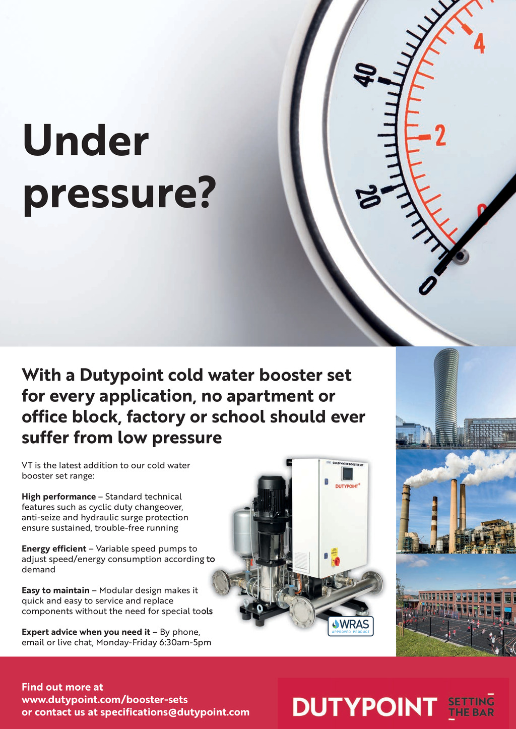 Under pressure? With a Dutypoint cold water booster set for every application, no apartment or office block, factory or school should ever suffer from low pressure VT is the latest addition to our cold water booster set range: High performance Standard technical features such as cyclic duty changeover, anti-seize and hydraulic surge protection ensure sustained, trouble-free running Energy efficient Variable speed pumps to adjust speed/energy consumption according to demand Easy to maintain Modular design makes it quick and easy to service and replace components without the need for special tools Expert advice when you need it By phone, email or live chat, Monday-Friday 6:30am-5pm Find out more at www.dutypoint.com/booster-sets 64 October 2019 www.cibsejournal.com or contact us at specifications@dutypoint.com p64.CIBSEMagOCT19.indd 64 17/09/2019 14:11