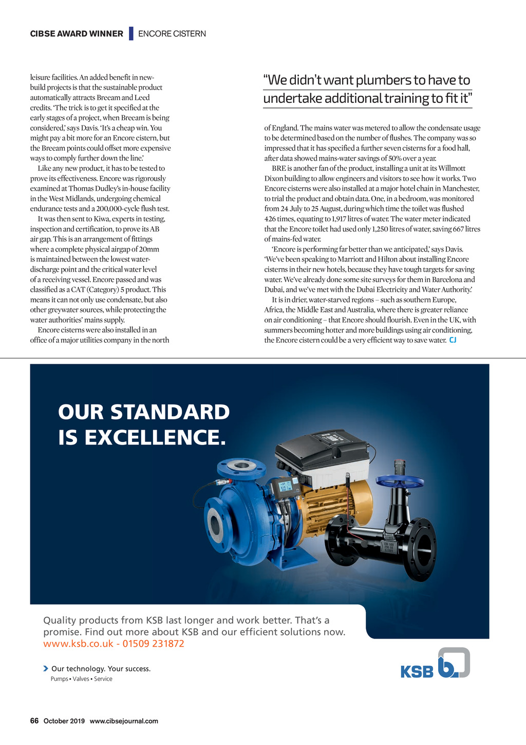 CIBSE AWARD WINNER | ENCORE CISTERN We didnt want plumbers to have to undertake additional training to fit it leisure facilities. An added benefit in newbuild projects is that the sustainable product automatically attracts Breeam and Leed credits. The trick is to get it specified at the early stages of a project, when Breeam is being considered, says Davis. Its a cheap win. You might pay a bit more for an Encore cistern, but the Breeam points could offset more expensive ways to comply further down the line. Like any new product, it has to be tested to prove its effectiveness. Encore was rigorously examined at Thomas Dudleys in-house facility in the West Midlands, undergoing chemical endurance tests and a 200,000-cycle flush test. It was then sent to Kiwa, experts in testing, inspection and certification, to prove its AB air gap. This is an arrangement of fittings where a complete physical airgap of 20mm is maintained between the lowest waterdischarge point and the critical water level of a receiving vessel. Encore passed and was classified as a CAT (Category) 5 product. This means it can not only use condensate, but also other greywater sources, while protecting the water authorities mains supply. Encore cisterns were also installed in an office of a major utilities company in the north of England. The mains water was metered to allow the condensate usage to be determined based on the number of flushes. The company was so impressed that it has specified a further seven cisterns for a food hall, after data showed mains-water savings of 50% over a year. BRE is another fan of the product, installing a unit at its Willmott Dixon building to allow engineers and visitors to see how it works. Two Encore cisterns were also installed at a major hotel chain in Manchester, to trial the product and obtain data. One, in a bedroom, was monitored from 24 July to 25 August, during which time the toilet was flushed 426 times, equating to 1,917 litres of water. The water meter indicated that the Encore toilet had used only 1,250 litres of water, saving 667 litres of mains-fed water. Encore is performing far better than we anticipated, says Davis. Weve been speaking to Marriott and Hilton about installing Encore cisterns in their new hotels, because they have tough targets for saving water. Weve already done some site surveys for them in Barcelona and Dubai, and weve met with the Dubai Electricity and Water Authority. It is in drier, water-starved regions such as southern Europe, Africa, the Middle East and Australia, where there is greater reliance on air conditioning that Encore should flourish. Even in the UK, with summers becoming hotter and more buildings using air conditioning, the Encore cistern could be a very efficient way to save water. CJ OUR STANDARD IS EXCELLENCE. Here is the new design. Any enquires should be sent to: sean.austen@ksb.com Here is the new design. Any enquires should be sent to: Quality products from KSB last longer and work better. Thats a promise. Find out more about KSB and our efficient solutions now. www.ksb.co.uk - 01509 231872 Pumps Valves Service 66 October 2019 www.cibsejournal.com CIBSE Oct19 pp65-66 Encore Cistern.indd 66 Here is the new design. Any enquires should be sent to: sean.austen@ksb.com 01278 458 686 20/09/2019 16:20