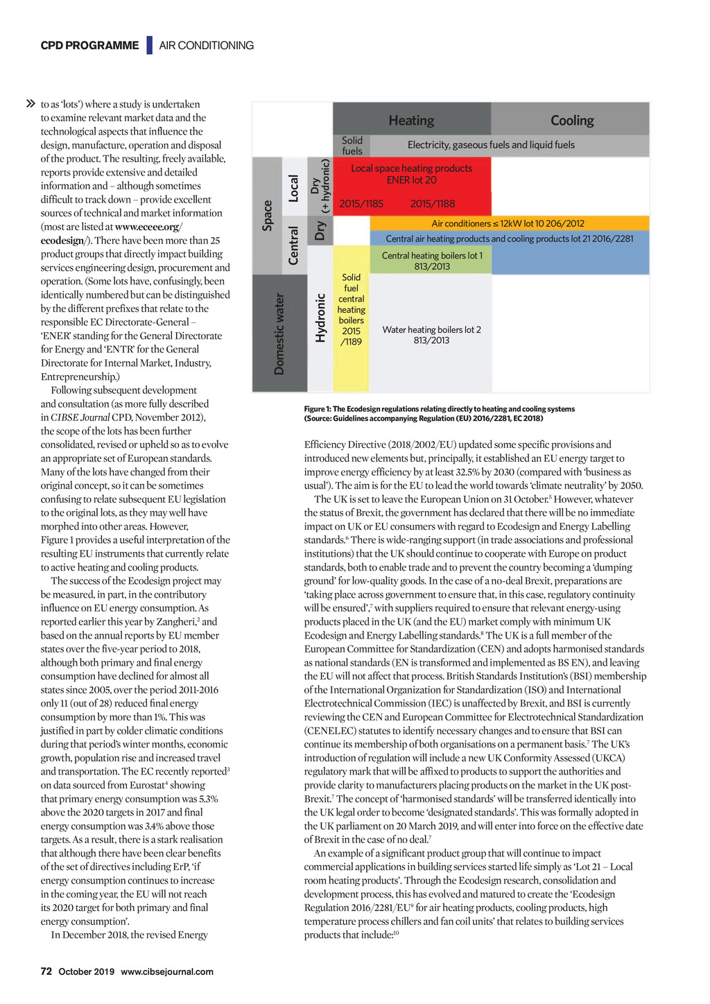 | AIR CONDITIONING Heating Dry Dry (+ hydronic) Cooling Electricity, gaseous fuels and liquid fuels Local space heating products ENER lot 20 2015/1185 2015/1188 Air conditioners 12kW lot 10 206/2012 Central air heating products and cooling products lot 21 2016/2281 Central heating boilers lot 1 813/2013 Hydronic Central Local Solid fuels Space to as lots) where a study is undertaken to examine relevant market data and the technological aspects that influence the design, manufacture, operation and disposal of the product. The resulting, freely available, reports provide extensive and detailed information and although sometimes difficult to track down provide excellent sources of technical and market information (most are listed at www.eceee.org/ ecodesign/). There have been more than 25 product groups that directly impact building services engineering design, procurement and operation. (Some lots have, confusingly, been identically numbered but can be distinguished by the different prefixes that relate to the responsible EC Directorate-General ENER standing for the General Directorate for Energy and ENTR for the General Directorate for Internal Market, Industry, Entrepreneurship.) Following subsequent development and consultation (as more fully described in CIBSE Journal CPD, November 2012), the scope of the lots has been further consolidated, revised or upheld so as to evolve an appropriate set of European standards. Many of the lots have changed from their original concept, so it can be sometimes confusing to relate subsequent EU legislation to the original lots, as they may well have morphed into other areas. However, Figure 1 provides a useful interpretation of the resulting EU instruments that currently relate to active heating and cooling products. The success of the Ecodesign project may be measured, in part, in the contributory influence on EU energy consumption. As reported earlier this year by Zangheri,2 and based on the annual reports by EU member states over the five-year period to 2018, although both primary and final energy consumption have declined for almost all states since 2005, over the period 2011-2016 only 11 (out of 28) reduced final energy consumption by more than 1%. This was justified in part by colder climatic conditions during that periods winter months, economic growth, population rise and increased travel and transportation. The EC recently reported3 on data sourced from Eurostat4 showing that primary energy consumption was 5.3% above the 2020 targets in 2017 and final energy consumption was 3.4% above those targets. As a result, there is a stark realisation that although there have been clear benefits of the set of directives including ErP, if energy consumption continues to increase in the coming year, the EU will not reach its 2020 target for both primary and final energy consumption. In December 2018, the revised Energy Domestic water CPD PROGRAMME Solid fuel central heating boilers 2015 /1189 Water heating boilers lot 2 813/2013 Figure 1: The Ecodesign regulations relating directly to heating and cooling systems (Source: Guidelines accompanying Regulation (EU) 2016/2281, EC 2018) Efficiency Directive (2018/2002/EU) updated some specific provisions and introduced new elements but, principally, it established an EU energy target to improve energy efficiency by at least 32.5% by 2030 (compared with business as usual). The aim is for the EU to lead the world towards climate neutrality by 2050. The UK is set to leave the European Union on 31 October.5 However, whatever the status of Brexit, the government has declared that there will be no immediate impact on UK or EU consumers with regard to Ecodesign and Energy Labelling standards.6 There is wide-ranging support (in trade associations and professional institutions) that the UK should continue to cooperate with Europe on product standards, both to enable trade and to prevent the country becoming a dumping ground for low-quality goods. In the case of a no-deal Brexit, preparations are taking place across government to ensure that, in this case, regulatory continuity will be ensured,7 with suppliers required to ensure that relevant energy-using products placed in the UK (and the EU) market comply with minimum UK Ecodesign and Energy Labelling standards.8 The UK is a full member of the European Committee for Standardization (CEN) and adopts harmonised standards as national standards (EN is transformed and implemented as BS EN), and leaving the EU will not affect that process. British Standards Institutions (BSI) membership of the International Organization for Standardization (ISO) and International Electrotechnical Commission (IEC) is unaffected by Brexit, and BSI is currently reviewing the CEN and European Committee for Electrotechnical Standardization (CENELEC) statutes to identify necessary changes and to ensure that BSI can continue its membership of both organisations on a permanent basis.7 The UKs introduction of regulation will include a new UK Conformity Assessed (UKCA) regulatory mark that will be affixed to products to support the authorities and provide clarity to manufacturers placing products on the market in the UK postBrexit.7 The concept of harmonised standards will be transferred identically into the UK legal order to become designated standards. This was formally adopted in the UK parliament on 20 March 2019, and will enter into force on the effective date of Brexit in the case of no deal.7 An example of a significant product group that will continue to impact commercial applications in building services started life simply as Lot 21 Local room heating products. Through the Ecodesign research, consolidation and development process, this has evolved and matured to create the Ecodesign Regulation 2016/2281/EU9 for air heating products, cooling products, high temperature process chillers and fan coil units that relates to building services products that include:10 72 October 2019 www.cibsejournal