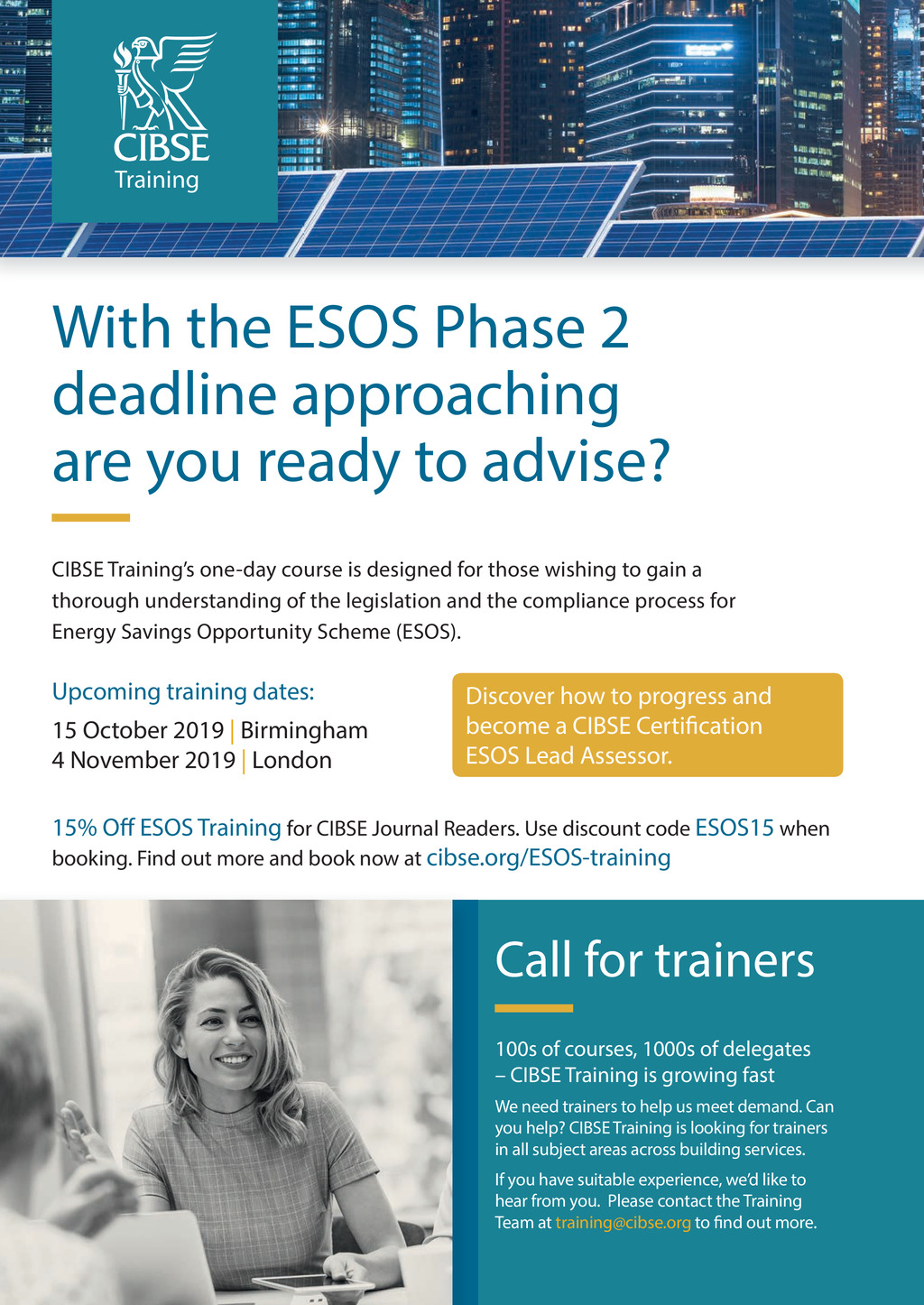 Training With the ESOS Phase 2 deadline approaching are you ready to advise? CIBSE Trainings one-day course is designed for those wishing to gain a thorough understanding of the legislation and the compliance process for Energy Savings Opportunity Scheme (ESOS). Upcoming training dates: 15 October 2019 | Birmingham 4 November 2019 | London Discover how to progress and become a CIBSE Certification ESOS Lead Assessor. 15% Off ESOS Training for CIBSE Journal Readers. Use discount code ESOS15 when booking. Find out more and book now at cibse.org/ESOS-training Call for trainers 100s of courses, 1000s of delegates CIBSE Training is growing fast We need trainers to help us meet demand. Can you help? CIBSE Training is looking for trainers in all subject areas across building services. If you have suitable experience, wed like to hear from you. Please contact the Training Team at training@cibse.org to find out more. 76 October 2019 www.cibsejournal.com p76.CIBSEMagOCT19.indd 76 18/09/2019 15:46