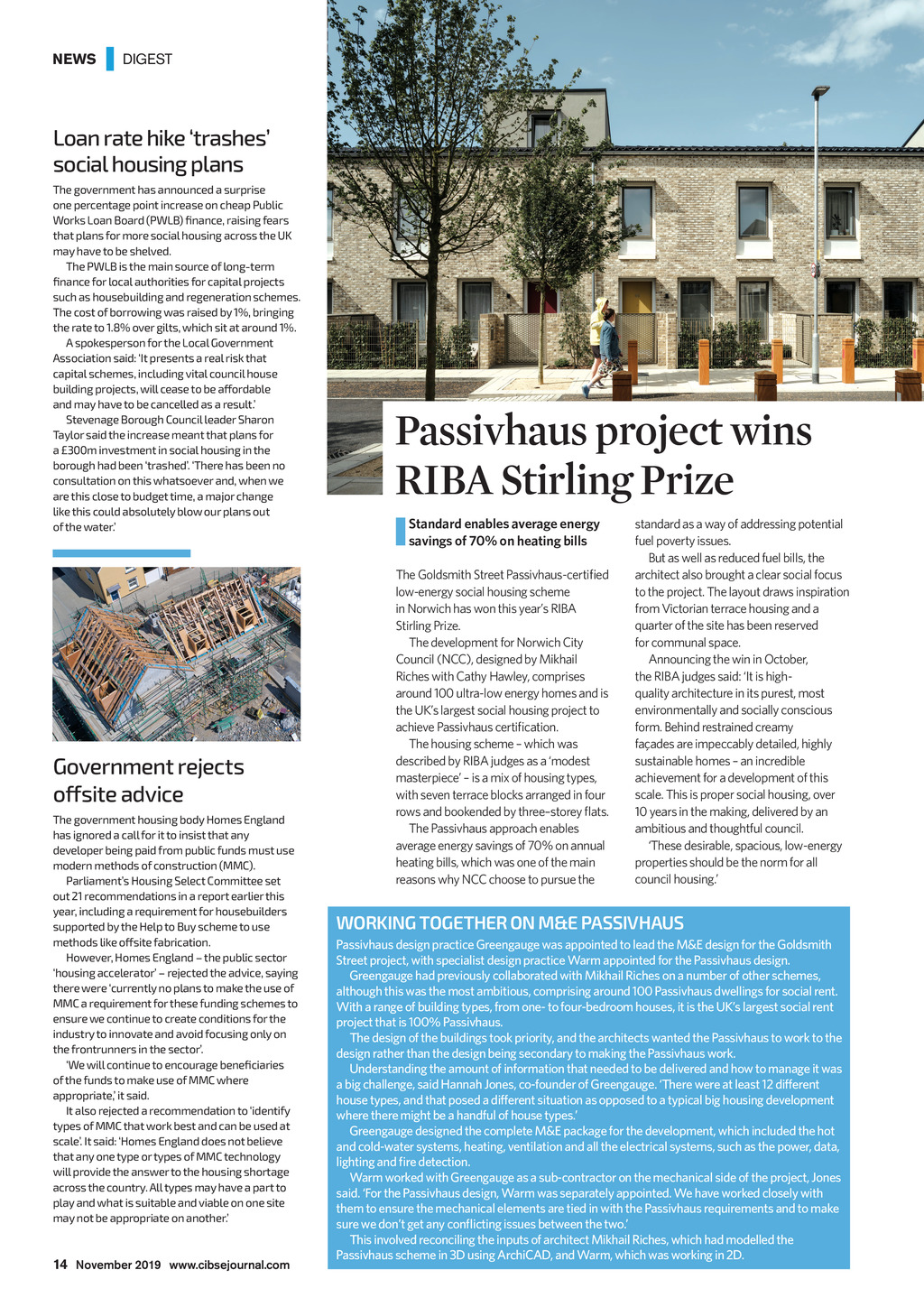NEWS | DIGEST Loan rate hike trashes social housing plans The government has announced a surprise one percentage point increase on cheap Public Works Loan Board (PWLB) finance, raising fears that plans for more social housing across the UK may have to be shelved. The PWLB is the main source of long-term finance for local authorities for capital projects such as housebuilding and regeneration schemes. The cost of borrowing was raised by 1%, bringing the rate to 1.8% over gilts, which sit at around 1%. A spokesperson for the Local Government Association said: It presents a real risk that capital schemes, including vital council house building projects, will cease to be affordable and may have to be cancelled as a result. Stevenage Borough Council leader Sharon Taylor said the increase meant that plans for a 300m investment in social housing in the borough had been trashed. There has been no consultation on this whatsoever and, when we are this close to budget time, a major change like this could absolutely blow our plans out of the water. Government rejects offsite advice The government housing body Homes England has ignored a call for it to insist that any developer being paid from public funds must use modern methods of construction (MMC). Parliaments Housing Select Committee set out 21 recommendations in a report earlier this year, including a requirement for housebuilders supported by the Help to Buy scheme to use methods like offsite fabrication. However, Homes England the public sector housing accelerator rejected the advice, saying there were currently no plans to make the use of MMC a requirement for these funding schemes to ensure we continue to create conditions for the industry to innovate and avoid focusing only on the frontrunners in the sector. We will continue to encourage beneficiaries of the funds to make use of MMC where appropriate, it said. It also rejected a recommendation to identify types of MMC that work best and can be used at scale. It said: Homes England does not believe that any one type or types of MMC technology will provide the answer to the housing shortage across the country. All types may have a part to play and what is suitable and viable on one site may not be appropriate on another. 14 November 2019 www.cibsejournal.com CIBSE Nov19 pp14 News Goldsmith.indd 14 Passivhaus project wins RIBA Stirling Prize Standard enables average energy savings of 70% on heating bills The Goldsmith Street Passivhaus-certified low-energy social housing scheme in Norwich has won this years RIBA Stirling Prize. The development for Norwich City Council (NCC), designed by Mikhail Riches with Cathy Hawley, comprises around 100 ultra-low energy homes and is the UKs largest social housing project to achieve Passivhaus certification. The housing scheme which was described by RIBA judges as a modest masterpiece is a mix of housing types, with seven terrace blocks arranged in four rows and bookended by threestorey flats. The Passivhaus approach enables average energy savings of 70% on annual heating bills, which was one of the main reasons why NCC choose to pursue the standard as a way of addressing potential fuel poverty issues. But as well as reduced fuel bills, the architect also brought a clear social focus to the project. The layout draws inspiration from Victorian terrace housing and a quarter of the site has been reserved for communal space. Announcing the win in October, the RIBA judges said: It is highquality architecture in its purest, most environmentally and socially conscious form. Behind restrained creamy faades are impeccably detailed, highly sustainable homes an incredible achievement for a development of this scale. This is proper social housing, over 10 years in the making, delivered by an ambitious and thoughtful council. These desirable, spacious, low-energy properties should be the norm for all council housing. WORKING TOGETHER ON M&E PASSIVHAUS Passivhaus design practice Greengauge was appointed to lead the M&E design for the Goldsmith Street project, with specialist design practice Warm appointed for the Passivhaus design. Greengauge had previously collaborated with Mikhail Riches on a number of other schemes, although this was the most ambitious, comprising around 100 Passivhaus dwellings for social rent. With a range of building types, from one- to four-bedroom houses, it is the UKs largest social rent project that is 100% Passivhaus. The design of the buildings took priority, and the architects wanted the Passivhaus to work to the design rather than the design being secondary to making the Passivhaus work. Understanding the amount of information that needed to be delivered and how to manage it was a big challenge, said Hannah Jones, co-founder of Greengauge. There were at least 12 different house types, and that posed a different situation as opposed to a typical big housing development where there might be a handful of house types. Greengauge designed the complete M&E package for the development, which included the hot and cold-water systems, heating, ventilation and all the electrical systems, such as the power, data, lighting and fire detection. Warm worked with Greengauge as a sub-contractor on the mechanical side of the project, Jones said. For the Passivhaus design, Warm was separately appointed. We have worked closely with them to ensure the mechanical elements are tied in with the Passivhaus requirements and to make sure we dont get any conflicting issues between the two. This involved reconciling the inputs of architect Mikhail Riches, which had modelled the Passivhaus scheme in 3D using ArchiCAD, and Warm, which was working in 2D. 25/10/2019 15:24