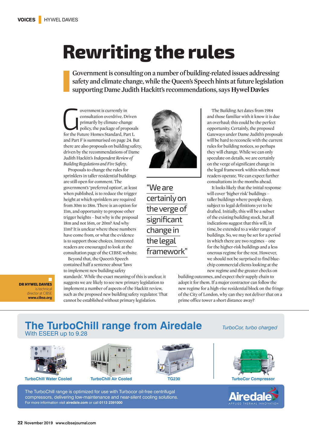 VOICES | HYWEL DAVIES Rewriting the rules Government is consulting on a number of building-related issues addressing safety and climate change, while the Queens Speech hints at future legislation supporting Dame Judith Hackitts recommendations, says Hywel Davies G overnment is currently in consultation overdrive. Driven primarily by climate-change policy, the package of proposals for the Future Homes Standard, Part L and Part F is summarised on page 24. But there are also proposals on building safety, driven by the recommendations of Dame Judith Hackitts Independent Review of Building Regulations and Fire Safety. Proposals to change the rules for sprinklers in taller residential buildings are still open for comment. The governments preferred option, at least when published, is to reduce the trigger height at which sprinklers are required from 30m to 18m. There is an option for 11m, and opportunity to propose other trigger heights but why is the proposal 18m and not 16m, or 20m? And why 11m? It is unclear where these numbers have come from, or what the evidence is to support those choices. Interested readers are encouraged to look at the consultation page of the CIBSE website. Beyond that, the Queens Speech contained half a sentence about laws to implement new building safety standards. While the exact meaning of this is unclear, it suggests we are likely to see new primary legislation to implement a number of aspects of the Hackitt review, such as the proposed new building safety regulator. That cannot be established without primary legislation. The Building Act dates from 1984 and those familiar with it know it is due an overhaul; this could be the perfect opportunity. Certainly, the proposed Gateways under Dame Judiths proposals will be hard to reconcile with the current rules for building notices, so perhaps they will change. While we can only speculate on details, we are certainly on the verge of significant change in the legal framework within which most readers operate. We can expect further consultations in the months ahead. It looks likely that the initial response will cover higher risk buildings taller buildings where people sleep, subject to legal definitions yet to be drafted. Initially, this will be a subset of the existing building stock, but all indications suggest that this will, in time, be extended to a wider range of buildings. So, we may be set for a period in which there are two regimes one for the higher-risk buildings and a less onerous regime for the rest. However, we should not be surprised to find bluechip commercial clients looking at the new regime and the greater checks on building outcomes, and expect their supply chain to adopt it for them. If a major contractor can follow the new regime for a high-rise residential block on the fringe of the City of London, why can they not deliver that on a prime office tower a short distance away? We are certainly on the verge of significant change in the legal framework DR HYWEL DAVIES is technical director at CIBSE www.cibse.org The TurboChill range from Airedale With ESEER up to 9.28 TurboChill Water Cooled TurboChill Air Cooled TG230 TurboCor, turbo charged TurboCor Compressor The TurboChill range is optimized for use with Turbocor oil-free centrifugal compressors, delivering low-maintenance and near-silent cooling solutions. For more information visit airedale.com or call 0113 2391000 22 November 2019 www.cibsejournal.com CIBSE Nov19 pp22-23 Hywel Davies.indd 22 25/10/2019 14:42
