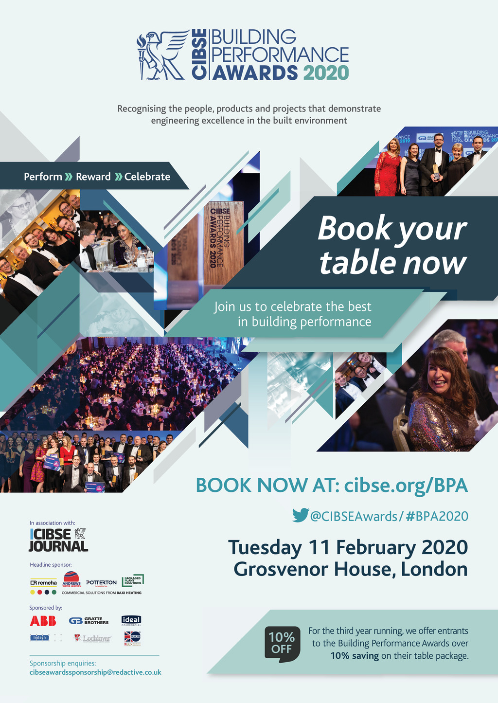 Recognising the people, products and projects that demonstrate engineering excellence in the built environment Perform Reward Celebrate Book your table now Join us to celebrate the best in building performance BOOK NOW AT: cibse.org/BPA @CIBSEAwards / #BPA2020 In association with: Headline sponsor: Tuesday 11 February 2020 Grosvenor House, London Sponsored by: 10% OFF Sponsorship enquiries: cibseawardssponsorship@redactive.co.uk 34 November 2019 www.cibsejournal.com p34.CIBSEMagNOV19.indd 34 For the third year running, we offer entrants to the Building Performance Awards over 10% saving on their table package. 22/10/2019 14:43