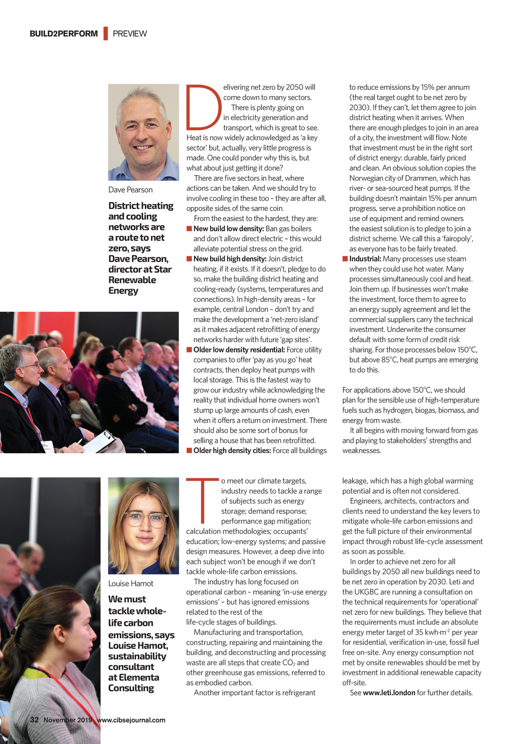 BUILD2PERFORM | PREVIEW D Dave Pearson District heating and cooling networks are a route to net zero, says Dave Pearson, director at Star Renewable Energy elivering net zero by 2050 will come down to many sectors. There is plenty going on in electricity generation and transport, which is great to see. Heat is now widely acknowledged as a key sector but, actually, very little progress is made. One could ponder why this is, but what about just getting it done? There are five sectors in heat, where actions can be taken. And we should try to involve cooling in these too they are after all, opposite sides of the same coin. From the easiest to the hardest, they are: New build low density: Ban gas boilers and dont allow direct electric this would alleviate potential stress on the grid. New build high density: Join district heating, if it exists. If it doesnt, pledge to do so, make the building district heating and cooling-ready (systems, temperatures and connections). In high-density areas for example, central London dont try and make the development a net-zero island as it makes adjacent retrofitting of energy networks harder with future gap sites. Older low density residential: Force utility companies to offer pay as you go heat contracts, then deploy heat pumps with local storage. This is the fastest way to grow our industry while acknowledging the reality that individual home owners wont stump up large amounts of cash, even when it offers a return on investment. There should also be some sort of bonus for selling a house that has been retrofitted. Older high density cities: Force all buildings T Louise Hamot We must tackle wholelife carbon emissions, says Louise Hamot, sustainability consultant at Elementa Consulting o meet our climate targets, industry needs to tackle a range of subjects such as energy storage; demand response; performance gap mitigation; calculation methodologies; occupants education; low-energy systems; and passive design measures. However, a deep dive into each subject wont be enough if we dont tackle whole-life carbon emissions. The industry has long focused on operational carbon meaning in-use energy emissions but has ignored emissions related to the rest of the life-cycle stages of buildings. Manufacturing and transportation, constructing, repairing and maintaining the building, and deconstructing and processing waste are all steps that create CO2 and other greenhouse gas emissions, referred to as embodied carbon. Another important factor is refrigerant to reduce emissions by 15% per annum (the real target ought to be net zero by 2030). If they cant, let them agree to join district heating when it arrives. When there are enough pledges to join in an area of a city, the investment will flow. Note that investment must be in the right sort of district energy: durable, fairly priced and clean. An obvious solution copies the Norwegian city of Drammen, which has river- or sea-sourced heat pumps. If the building doesnt maintain 15% per annum progress, serve a prohibition notice on use of equipment and remind owners the easiest solution is to pledge to join a district scheme. We call this a fairopoly, as everyone has to be fairly treated. Industrial: Many processes use steam when they could use hot water. Many processes simultaneously cool and heat. Join them up. If businesses wont make the investment, force them to agree to an energy supply agreement and let the commercial suppliers carry the technical investment. Underwrite the consumer default with some form of credit risk sharing. For those processes below 150oC, but above 85oC, heat pumps are emerging to do this. For applications above 150oC, we should plan for the sensible use of high-temperature fuels such as hydrogen, biogas, biomass, and energy from waste. It all begins with moving forward from gas and playing to stakeholders strengths and weaknesses. leakage, which has a high global warming potential and is often not considered. Engineers, architects, contractors and clients need to understand the key levers to mitigate whole-life carbon emissions and get the full picture of their environmental impact through robust life-cycle assessment as soon as possible. In order to achieve net zero for all buildings by 2050 all new buildings need to be net zero in operation by 2030. Leti and the UKGBC are running a consultation on the technical requirements for operational net zero for new buildings. They believe that the requirements must include an absolute energy meter target of 35 kwh.m-2 per year for residential, verification in-use, fossil fuel free on-site. Any energy consumption not met by onsite renewables should be met by investment in additional renewable capacity off-site. See www.leti.london for further details. 32 November 2019 www.cibsejournal.com CIBSE Nov19 pp31-32 Build2Perform.indd 32 25/10/2019 18:01