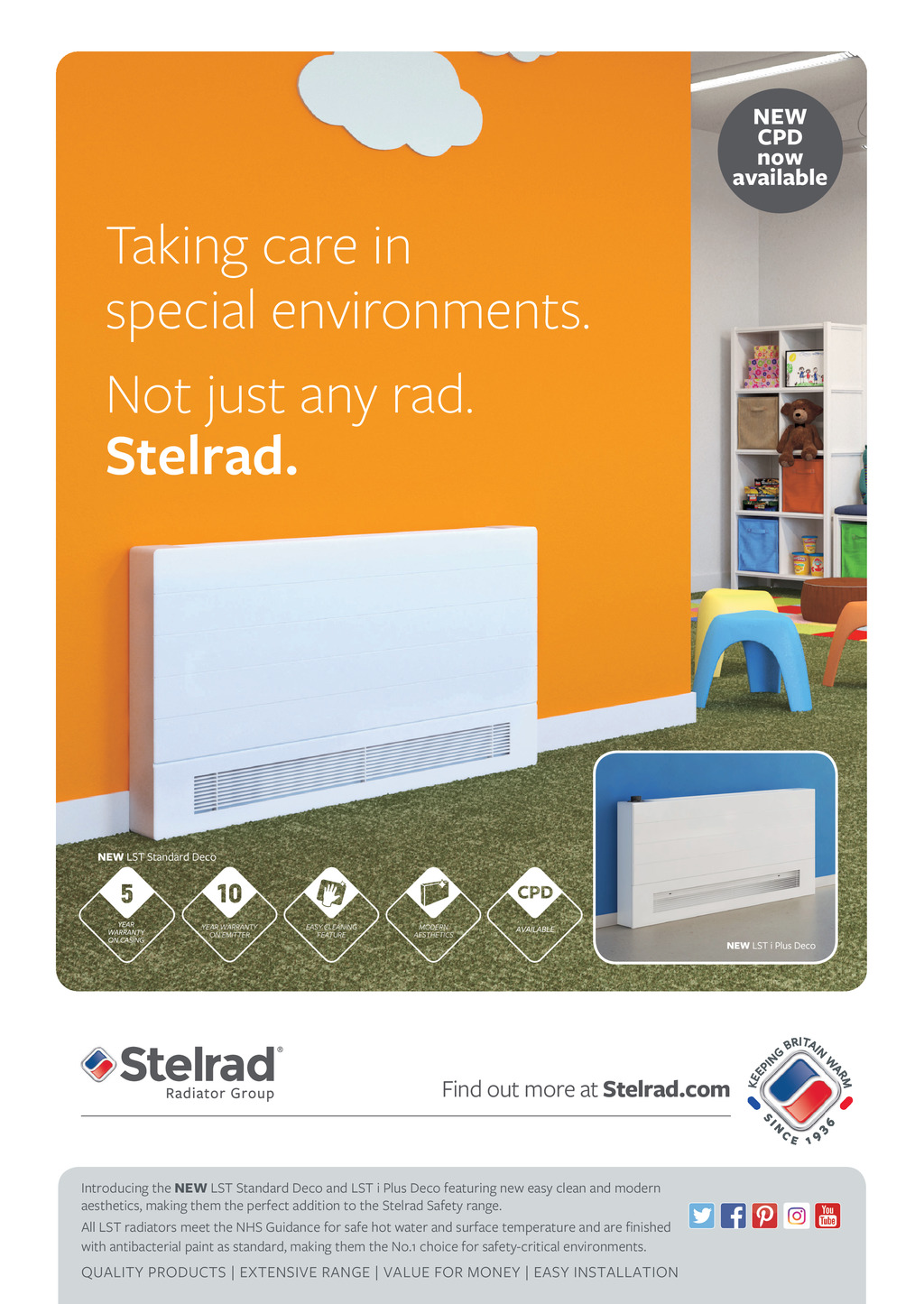 NEW CPD now available Taking care in special environments. Not just any rad. Stelrad. YEAR WARRANTY ON EMITTER EASY CLEANING FEATURE MODERN AESTHETICS Find out more at Stelrad.com Introducing the NEW LST Standard Deco and LST i Plus Deco featuring new easy clean and modern aesthetics, making them the perfect addition to the Stelrad Safety range. All LST radiators meet the NHS Guidance for safe hot water and surface temperature and are nished with antibacterial paint as standard, making them the No.1 choice for safety-critical environments. 50 November 2019 www.cibsejournal.com QUALITY PRODUCTS | EXTENSIVE RANGE | VALUE FOR MONEY | EASY INSTALLATION p50.CIBSEMagNOV19.indd 50 22/10/2019 15:08