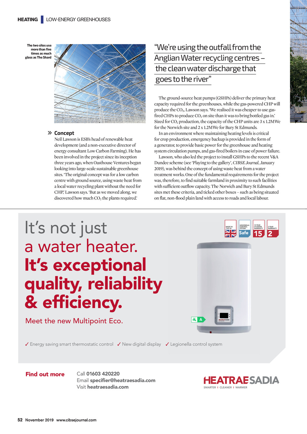 HEATING | LOW-ENERGY GREENHOUSES Were using the outfall from the Anglian Water recycling centres the clean water discharge that goes to the river The two sites use more than ve times as much glass as The Shard Concept Neil Lawson is ESBs head of renewable heat development (and a non-executive director of energy consultant Low Carbon Farming). He has been involved in the project since its inception three years ago, when Oasthouse Ventures began looking into large-scale sustainable greenhouse sites. The original concept was for a low carbon centre with ground source, using waste heat from a local water recycling plant without the need for CHP, Lawson says. But as we moved along, we discovered how much CO2 the plants required. The ground-source heat pumps (GSHPs) deliver the primary heat capacity required for the greenhouses, while the gas-powered CHP will produce the CO2, Lawson says. We realised it was cheaper to use gasfired CHPs to produce CO2 on site than it was to bring bottled gas in. Sized for CO2 production, the capacity of the CHP units are 3 x 1.2MWe for the Norwich site and 2 x 1.2MWe for Bury St Edmunds. In an environment where maintaining heating levels is critical for crop production, emergency backup is provided in the form of a generator, to provide basic power for the greenhouse and heating system circulation pumps, and gas-fired boilers in case of power failure. Lawson, who also led the project to install GSHPs to the recent V&A Dundee scheme (see Playing to the gallery, CIBSE Journal, January 2019), was behind the concept of using waste heat from a water treatment works. One of the fundamental requirements for the project was, therefore, to find suitable farmland in proximity to such facilities with sufficient outflow capacity. The Norwich and Bury St Edmunds sites met these criteria, and ticked other boxes such as being situated on flat, non-flood plain land with access to roads and local labour. Its not just a water heater. Its exceptional quality, reliability & efficiency. 15 Meet the new Multipoint Eco. Energy saving smart thermostatic control New digital display Legionella control system Find out more Call 01603 420220 Email specifier@heatraesadia.com Visit heatraesadia.com DEPT_375219_HeatraeSadia_MultipointEco_HalfHoriz_CIBSE_Oct19.indd 1 09/10/2019 09:54 52 November 2019 www.cibsejournal.com CIBSE Nov19 pp51-54 Heating Tomatoes.indd 52 25/10/2019 15:30