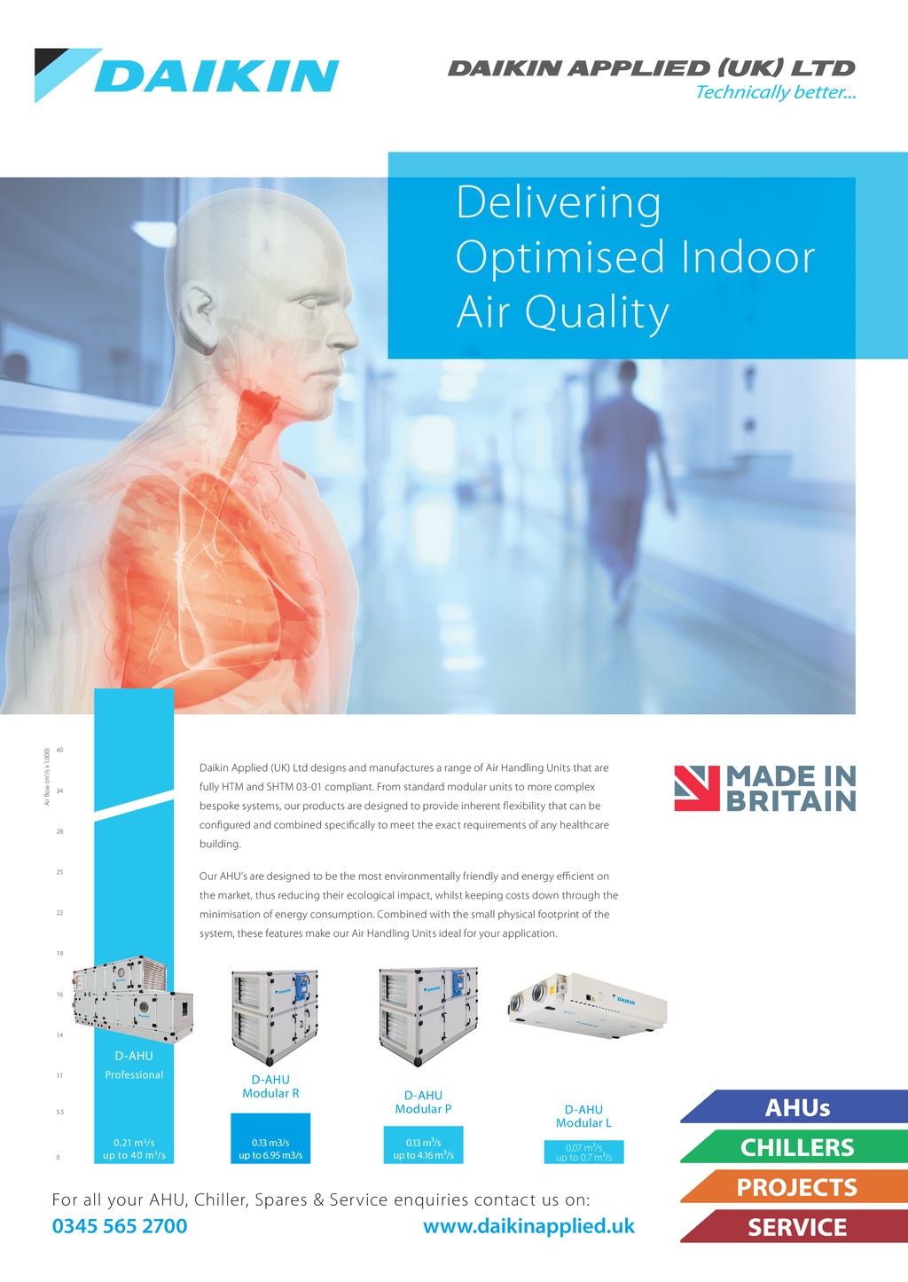 Air flow (m3/s x 1,000) Delivering Optimised Indoor Air Quality 40 Daikin Applied (UK) Ltd designs and manufactures a range of Air Handling Units that are fully HTM and SHTM 03-01 compliant. From standard modular units to more complex 34 bespoke systems, our products are designed to provide inherent flexibility that can be configured and combined specifically to meet the exact requirements of any healthcare 28 building. 25 Our AHUs are designed to be the most environmentally friendly and energy efficient on the market, thus reducing their ecological impact, whilst keeping costs down through the minimisation of energy consumption. Combined with the small physical footprint of the 22 system, these features make our Air Handling Units ideal for your application. 19 16 14 D-AHU 11 Professional D-AHU Modular R 5.5 0 0.21 m 3 /s up to 40 m 3 /s 0.13 m3/s up to 6.95 m3/s D-AHU Modular P 0.13 m/s up to 4.16 m/s D-AHU Modular L 0.07 m3/s up to 0.7 m3/s For all your AHU, Chiller, Spares & Service enquiries contact us on: 0345 565 2700 72 November 2019 www.cibsejournal.com p72.CIBSEMagNOV19.indd 72 www.daikinapplied.uk 22/10/2019 15:16
