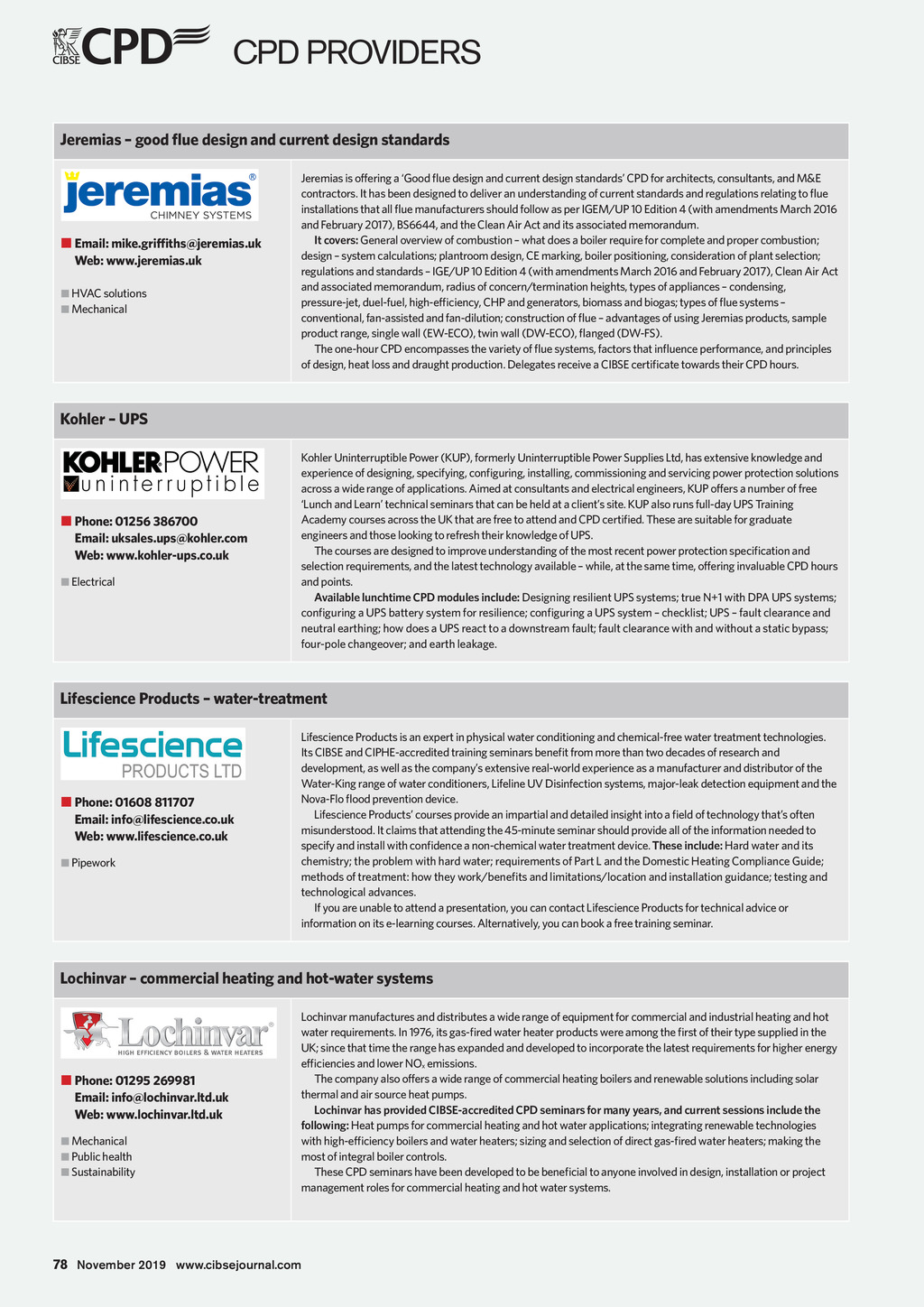 CPD PROVIDERS Jeremias good flue design and current design standards Email: mike.griffiths@jeremias.uk Web: www.jeremias.uk HVAC solutions Mechanical Jeremias is offering a Good flue design and current design standards CPD for architects, consultants, and M&E contractors. It has been designed to deliver an understanding of current standards and regulations relating to flue installations that all flue manufacturers should follow as per IGEM/UP 10 Edition 4 (with amendments March 2016 and February 2017), BS6644, and the Clean Air Act and its associated memorandum. It covers: General overview of combustion what does a boiler require for complete and proper combustion; design system calculations; plantroom design, CE marking, boiler positioning, consideration of plant selection; regulations and standards IGE/UP 10 Edition 4 (with amendments March 2016 and February 2017), Clean Air Act and associated memorandum, radius of concern/termination heights, types of appliances condensing, pressure-jet, duel-fuel, high-efficiency, CHP and generators, biomass and biogas; types of flue systems conventional, fan-assisted and fan-dilution; construction of flue advantages of using Jeremias products, sample product range, single wall (EW-ECO), twin wall (DW-ECO), flanged (DW-FS). The one-hour CPD encompasses the variety of flue systems, factors that influence performance, and principles of design, heat loss and draught production. Delegates receive a CIBSE certificate towards their CPD hours. Kohler UPS Phone: 01256 386700 Email: uksales.ups@kohler.com Web: www.kohler-ups.co.uk Electrical Kohler Uninterruptible Power (KUP), formerly Uninterruptible Power Supplies Ltd, has extensive knowledge and experience of designing, specifying, configuring, installing, commissioning and servicing power protection solutions across a wide range of applications. Aimed at consultants and electrical engineers, KUP offers a number of free Lunch and Learn technical seminars that can be held at a clients site. KUP also runs full-day UPS Training Academy courses across the UK that are free to attend and CPD certified. These are suitable for graduate engineers and those looking to refresh their knowledge of UPS. The courses are designed to improve understanding of the most recent power protection specification and selection requirements, and the latest technology available while, at the same time, offering invaluable CPD hours and points. Available lunchtime CPD modules include: Designing resilient UPS systems; true N+1 with DPA UPS systems; configuring a UPS battery system for resilience; configuring a UPS system checklist; UPS fault clearance and neutral earthing; how does a UPS react to a downstream fault; fault clearance with and without a static bypass; four-pole changeover; and earth leakage. Lifescience Products water-treatment P hone: 01608 811707 Email: info@lifescience.co.uk Web: www.lifescience.co.uk Pipework Lifescience Products is an expert in physical water conditioning and chemical-free water treatment technologies. Its CIBSE and CIPHE-accredited training seminars benefit from more than two decades of research and development, as well as the companys extensive real-world experience as a manufacturer and distributor of the Water-King range of water conditioners, Lifeline UV Disinfection systems, major-leak detection equipment and the Nova-Flo flood prevention device. Lifescience Products courses provide an impartial and detailed insight into a field of technology thats often misunderstood. It claims that attending the 45-minute seminar should provide all of the information needed to specify and install with confidence a non-chemical water treatment device. These include: Hard water and its chemistry; the problem with hard water; requirements of Part L and the Domestic Heating Compliance Guide; methods of treatment: how they work/benefits and limitations/location and installation guidance; testing and technological advances. If you are unable to attend a presentation, you can contact Lifescience Products for technical advice or information on its e-learning courses. Alternatively, you can book a free training seminar. Lochinvar commercial heating and hot-water systems P hone: 01295 269981 Email: info@lochinvar.ltd.uk Web: www.lochinvar.ltd.uk Mechanical Public health Sustainability Lochinvar manufactures and distributes a wide range of equipment for commercial and industrial heating and hot water requirements. In 1976, its gas-fired water heater products were among the first of their type supplied in the UK; since that time the range has expanded and developed to incorporate the latest requirements for higher energy efficiencies and lower NOx emissions. The company also offers a wide range of commercial heating boilers and renewable solutions including solar thermal and air source heat pumps. Lochinvar has provided CIBSE-accredited CPD seminars for many years, and current sessions include the following: Heat pumps for commercial heating and hot water applications; integrating renewable technologies with high-efficiency boilers and water heaters; sizing and selection of direct gas-fired water heaters; making the most of integral boiler controls. These CPD seminars have been developed to be beneficial to anyone involved in design, installation or project management roles for commercial heating and hot water systems. 78 November 2019 www.cibsejournal.com CIBSE Nov19 pp76-78 Directory.indd 78 25/10/2019 15:57