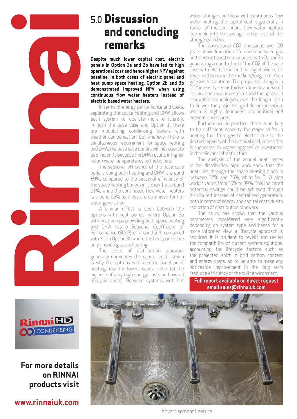 5.0 Discussion 5.0 and concluding 5.0 remarks Despite much lower capital cost, electric panels in Option 2a and 2b have led to high operational cost and hence higher NPV against baseline. In both cases of electric panel and heat pump space heating, Option 2b and 3b demonstrated improved NPV when using continuous ow water heaters instead of electric-based water heaters. In terms of energy performance and costs, separating the space heating and DHW allows each system to operate more efciently. In both the base case and Option 1, there are modulating condensing boilers with weather compensation, but whenever there is simultaneous requirement for space heating and DHW, the base case boilers will not operate as efciently because the DHW results in higher return water temperatures to the boilers. The seasonal efciency of the base case boilers doing both heating and DHW is around 89%, compared to the seasonal efciency of the space heating boilers in Option 1 at around 91%, while the continuous ow water heaters is around 95% as these are optimised for hot water generation. A similar effect is seen between the options with heat pumps, where Option 3a with heat pumps providing both space heating and DHW has a Seasonal Coefcient of Performance (SCoP) of around 2.4, compared with 3.1 in Option 3b where the heat pumps are only providing space heating. The costs of distribution pipework generally dominates the capital costs, which is why the options with electric panel point heating have the lowest capital costs (at the expense of very high energy costs and overall lifecycle costs). Between systems with hot water storage and those with continuous ow water heating, the capital cost is generally in favour of the continuous ow water heaters due mainly to the savings in the cost of the storage cylinders. The operational CO2 emissions over 20 years show dramatic differences between gas and electric based heat sources, with Option 3a generating around a third of the CO2 of the base case with electric-based heating shown to be lower carbon over the medium/long term than gas-based solutions. The projected changes in CO2 intensity seems fairly optimistic and would require continual investment and the uptake in renewable technologies over the longer term to deliver the projected grid decarbonisation, which is highly dependent on political and economic pressures. Furthermore, in practice, there is unlikely to be sufcient capacity for major shifts in heating fuel from gas to electric due to the limited capacity of the national grid, unless this is supported by urgent aggressive investment in the relevant infrastructure. The analysis of the annual heat losses in the distribution pipe work show that the heat loss through the space heating pipes is between 22% and 25%, while for DHW pipe work it varies from 35% to 39%. This indicated potential savings could be achieved through distributed instead of centralised generation, both in terms of energy and capital costs due to reduction of distribution pipework. The study has shown that the various parameters considered vary signicantly depending on system type and hence for a more informed view, a lifecycle approach is required. It is prudent to revisit and review the compatibility of current system solutions, accounting for lifecycle factors such as the projected shift in grid carbon content and energy costs, so to be able to make any noticeable improvement in the long term resource efciency of the built environment. Full report available on direct request email sales@rinnaiuk.com For more details on RINNAI products visit www.rinnaiuk.com 82 November 2019 www.cibsejournal.com Advertisement Feature p82.CIBSEMagNOV19.indd 82 22/10/2019 15:21