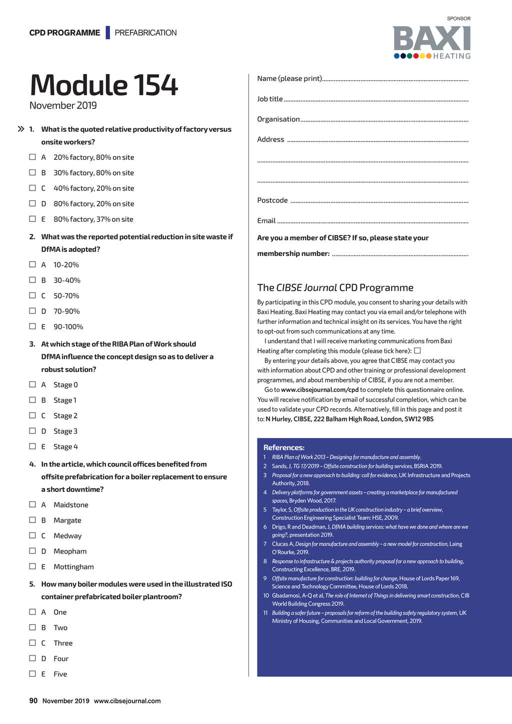 SPONSOR CPD PROGRAMME | PREFABRICATION Module 154 November 2019 Name (please print)......................................................................................... Job title................................................................................................................ Organisation...................................................................................................... 1.What is the quoted relative productivity of factory versus onsite workers? Address .............................................................................................................. A 20% factory, 80% on site ............................................................................................................................... B 30% factory, 80% on site C 40% factory, 20% on site ............................................................................................................................... 80% factory, 20% on site Postcode ............................................................................................................ E 80% factory, 37% on site Email .................................................................................................................... D 2.What was the reported potential reduction in site waste if DfMA is adopted? A 10-20% B 30-40% C 50-70% D 70-90% E 90-100% 3.At which stage of the RIBA Plan of Work should DfMA influence the concept design so as to deliver a robust solution? A Stage 0 B Stage 1 C Stage 2 D Stage 3 E Stage 4 4.In the article, which council offices benefited from offsite prefabrication for a boiler replacement to ensure a short downtime? A Maidstone B Margate C Medway D Meopham E Mottingham 5.How many boiler modules were used in the illustrated ISO container prefabricated boiler plantroom? A One B Two C Three Are you a member of CIBSE? If so, please state your membership number: ................................................................................... The CIBSE Journal CPD Programme By participating in this CPD module, you consent to sharing your details with Baxi Heating. Baxi Heating may contact you via email and/or telephone with further information and technical insight on its services. You have the right to opt-out from such communications at any time. I understand that I will receive marketing communications from Baxi Heating after completing this module (please tick here): By entering your details above, you agree that CIBSE may contact you with information about CPD and other training or professional development programmes, and about membership of CIBSE, if you are not a member. Go to www.cibsejournal.com/cpd to complete this questionnaire online. You will receive notification by email of successful completion, which can be used to validate your CPD records. Alternatively, fill in this page and post it to: N Hurley, CIBSE, 222 Balham High Road, London, SW12 9BS References: 1 RIBA Plan of Work 2013 Designing for manufacture and assembly. 2 Sands, J, TG 17/2019 Offsite construction for building services, BSRIA 2019. 3 Proposal for a new approach to building: call for evidence, UK Infrastructure and Projects Authority, 2018. 4 Delivery platforms for government assets creating a marketplace for manufactured spaces, Bryden Wood, 2017. 5 Taylor, S, Offsite production in the UK construction industry a brief overview, Construction Engineering Specialist Team: HSE, 2009. 6 Drigo, R and Deadman, J, DfMA building services: what have we done and where are we going?, presentation 2019. 7 Clucas A, Design for manufacture and assembly a new model for construction, Laing ORourke, 2019. 8 Response to infrastructure & projects authority proposal for a new approach to building, Constructing Excellence, BRE, 2019. 9 Offsite manufacture for construction: building for change, House of Lords Paper 169, Science and Technology Committee, House of Lords 2018. 10 Gbadamosi, A-Q et al, The role of Internet of Things in delivering smart construction, CIB World Building Congress 2019. 11 Building a safer future proposals for reform of the building safety regulatory system, UK Ministry of Housing, Communities and Local Government, 2019. D Four E Five 90 November 2019 www.cibsejournal.com CIBSE Nov19 pp87-90 CPD v4.indd 90 25/10/2019 16:00