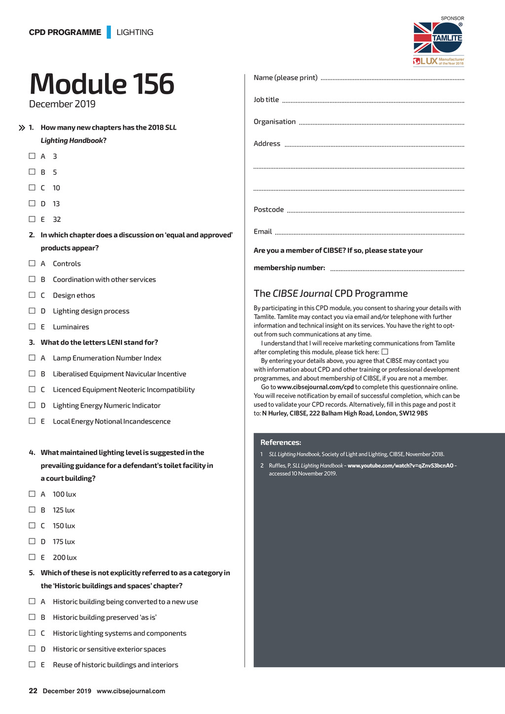 SPONSOR CPD PROGRAMME | LIGHTING Module 156 December 2019 1.How many new chapters has the 2018 SLL Lighting Handbook? LUX Manufacturer of theYear 2018 Name (please print) Job title Organisation Address A 3 B 5 C 10 D 13 Postcode E 32 2.In which chapter does a discussion on equal and approved products appear? A Controls B Coordination with other services C Design ethos D Lighting design process E Luminaires 3.What do the letters LENI stand for? A Lamp Enumeration Number Index B Liberalised Equipment Navicular Incentive C Licenced Equipment Neoteric Incompatibility D Lighting Energy Numeric Indicator Email Are you a member of CIBSE? If so, please state your membership number: The CIBSE Journal CPD Programme By participating in this CPD module, you consent to sharing your details with Tamlite. Tamlite may contact you via email and/or telephone with further information and technical insight on its services. You have the right to optout from such communications at any time. I understand that I will receive marketing communications from Tamlite after completing this module, please tick here: By entering your details above, you agree that CIBSE may contact you with information about CPD and other training or professional development programmes, and about membership of CIBSE, if you are not a member. Go to www.cibsejournal.com/cpd to complete this questionnaire online. You will receive notification by email of successful completion, which can be used to validate your CPD records. Alternatively, fill in this page and post it to: N Hurley, CIBSE, 222 Balham High Road, London, SW12 9BS E Local Energy Notional Incandescence References: 4.What maintained lighting level is suggested in the prevailing guidance for a defendants toilet facility in a court building? A 100 lux B 125 lux C 150 lux D 175 lux E 200 lux 1 SLL Lighting Handbook, Society of Light and Lighting, CIBSE, November 2018. 2 R uffles, P, SLL Lighting Handbook www.youtube.com/watch?v=qZnvS3bcnA0 accessed 10 November 2019. 5.Which of these is not explicitly referred to as a category in the Historic buildings and spaces chapter? A Historic building being converted to a new use B Historic building preserved as is C Historic lighting systems and components D Historic or sensitive exterior spaces E Reuse of historic buildings and interiors 22 December 2019 www.cibsejournal.com CIBSE Dec19 pp19-22 CPD Supp.indd 22 22/11/2019 17:06