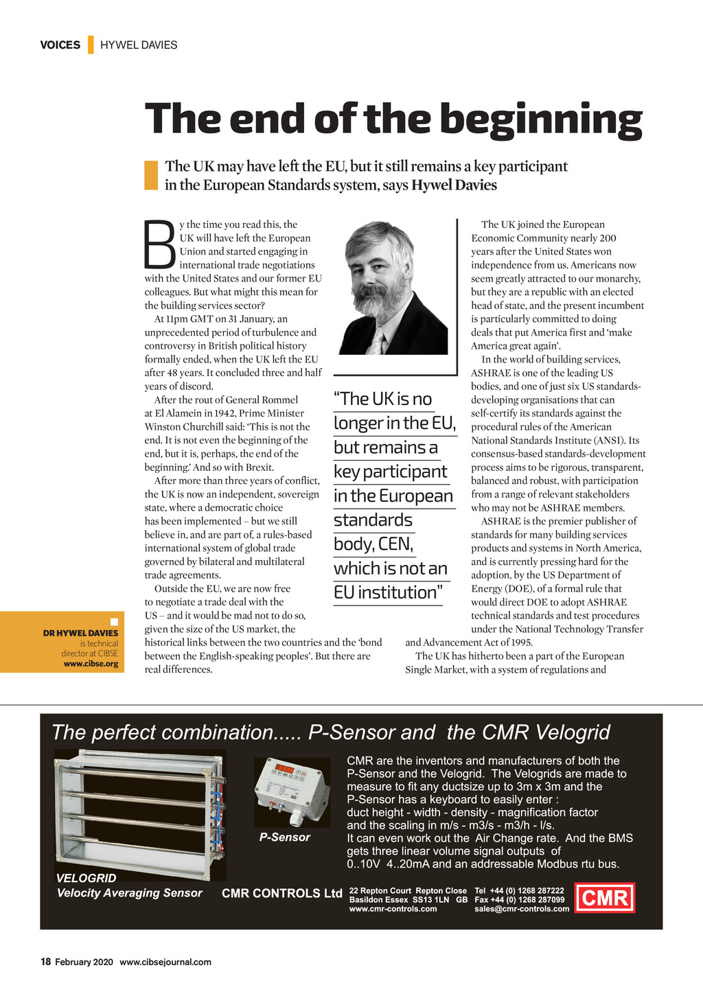 VOICES | HYWEL DAVIES The end of the beginning The UK may have left the EU, but it still remains a key participant in the European Standards system, says Hywel Davies B y the time you read this, the UK will have left the European Union and started engaging in international trade negotiations with the United States and our former EU colleagues. But what might this mean for the building services sector? At 11pm GMT on 31 January, an unprecedented period of turbulence and controversy in British political history formally ended, when the UK left the EU after 48 years. It concluded three and half years of discord. After the rout of General Rommel at El Alamein in 1942, Prime Minister Winston Churchill said: This is not the end. It is not even the beginning of the end, but it is, perhaps, the end of the beginning. And so with Brexit. After more than three years of conflict, the UK is now an independent, sovereign state, where a democratic choice has been implemented but we still believe in, and are part of, a rules-based international system of global trade governed by bilateral and multilateral trade agreements. Outside the EU, we are now free to negotiate a trade deal with the US and it would be mad not to do so, given the size of the US market, the historical links between the two countries and the bond between the English-speaking peoples. But there are real differences. The UK joined the European Economic Community nearly 200 years after the United States won independence from us. Americans now seem greatly attracted to our monarchy, but they are a republic with an elected head of state, and the present incumbent is particularly committed to doing deals that put America first and make America great again. In the world of building services, ASHRAE is one of the leading US bodies, and one of just six US standardsdeveloping organisations that can self-certify its standards against the procedural rules of the American National Standards Institute (ANSI). Its consensus-based standards-development process aims to be rigorous, transparent, balanced and robust, with participation from a range of relevant stakeholders who may not be ASHRAE members. ASHRAE is the premier publisher of standards for many building services products and systems in North America, and is currently pressing hard for the adoption, by the US Department of Energy (DOE), of a formal rule that would direct DOE to adopt ASHRAE technical standards and test procedures under the National Technology Transfer and Advancement Act of 1995. The UK has hitherto been a part of the European Single Market, with a system of regulations and The UK is no longer in the EU, but remains a key participant in the European standards body, CEN, which is not an EU institution DR HYWEL DAVIES is technical director at CIBSE www.cibse.org 18 February 2020 www.cibsejournal.com CIBSE Feb20 pp18-19 Hywel Davies.indd 18 24/01/2020 14:49