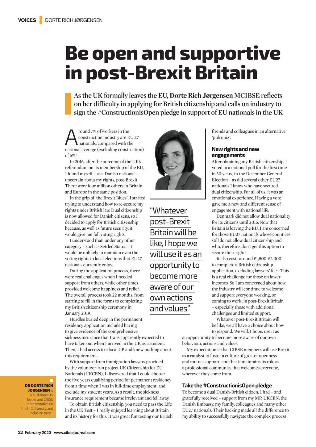 VOICES | DORTE RICH JRGENSEN Be open and supportive in post-Brexit Britain As the UK formally leaves the EU, Dorte Rich Jrgensen MCIBSE reects on her difculty in applying for British citizenship and calls on industry to sign the #ConstructionisOpen pledge in support of EU nationals in the UK A round 7% of workers in the construction industry are EU 27 nationals, compared with the national average (excluding construction) of 6%.1 In 2016, after the outcome of the UKs referendum on its membership of the EU, I found myself as a Danish national uncertain about my rights, post-Brexit. There were four million others in Britain and Europe in the same position. In the grip of the Brexit Blues, I started trying to understand how to re-secure my rights under British law. Dual citizenship is now allowed for Danish citizens, so I decided to apply for British citizenship because, as well as future security, it would give me full voting rights. I understood that, under any other category such as Settled Status I would be unlikely to maintain even the voting rights in local elections that EU27 nationals currently enjoy. During the application process, there were real challenges when I needed support from others, while other times provided welcome happiness and relief. The overall process took 22 months, from starting to fill in the forms to completing my British citizenship ceremony in January 2019. Hurdles buried deep in the permanent residency application included having to give evidence of the comprehensive sickness insurance that I was apparently expected to have taken out when I arrived in the UK as a student. Then, I had access to a local GP and knew nothing about this requirement. With support from immigration lawyers provided by the volunteer-run project UK Citizenship for EU Nationals (UKCEN), I discovered that I could choose the five years qualifying period for permanent residency from a time when I was in full-time employment, and exclude my student years. As a result, the sickness insurance requirement became irrelevant and fell away. To obtain British citizenship, you need to pass the Life in the UK Test I really enjoyed learning about Britain and its history for this. It was great fun testing our British friends and colleagues in an alternative pub quiz. New rights and new engagements After obtaining my British citizenship, I voted in a national poll for the first time in 30 years, in the December General Election as did several other EU27 nationals I know who have secured dual citizenship. For all of us, it was an emotional experience. Having a vote gave me a new and different sense of engagement with national life. Denmark did not allow dual nationality for its citizens until 2015. Now that Britain is leaving the EU, I am concerned for those EU27 nationals whose countries still do not allow dual citizenship and who, therefore, dont get this option to secure their rights. It also costs around 1,500-2,000 to complete a British citizenship application, excluding lawyers fees. This is a real challenge for those on lower incomes. So I am concerned about how the industry will continue to welcome and support everyone working, or coming to work, in post-Brexit Britain especially those with additional challenges and limited support. Whatever post-Brexit Britain will be like, we all have a choice about how to respond. We will, I hope, use it as an opportunity to become more aware of our own behaviour, actions and values. My expectation is that CIBSE members will use Brexit as a catalyst to foster a culture of greater openness and mutual support, and that it maintains its role as a professional community that welcomes everyone, wherever they come from. Whatever post-Brexit Britain will be like, I hope we will use it as an opportunity to become more aware of our own actions and values DR DORTE RICH JRGENSEN is a sustainability leader and CIBSE representative on the CIC diversity and inclusion panel. Take the #ConstructionisOpen pledge To become a dual Danish-British citizen, I had and gratefully received support from my MP, UKCEN, the Danish Embassy, my family, colleagues and many other EU27 nationals. Their backing made all the difference to my ability to successfully navigate the complex process 22 February 2020 www.cibsejournal.com CIBSE Feb20 pp22-23 Dorte / Swegon.indd 22 24/01/2020 14:52