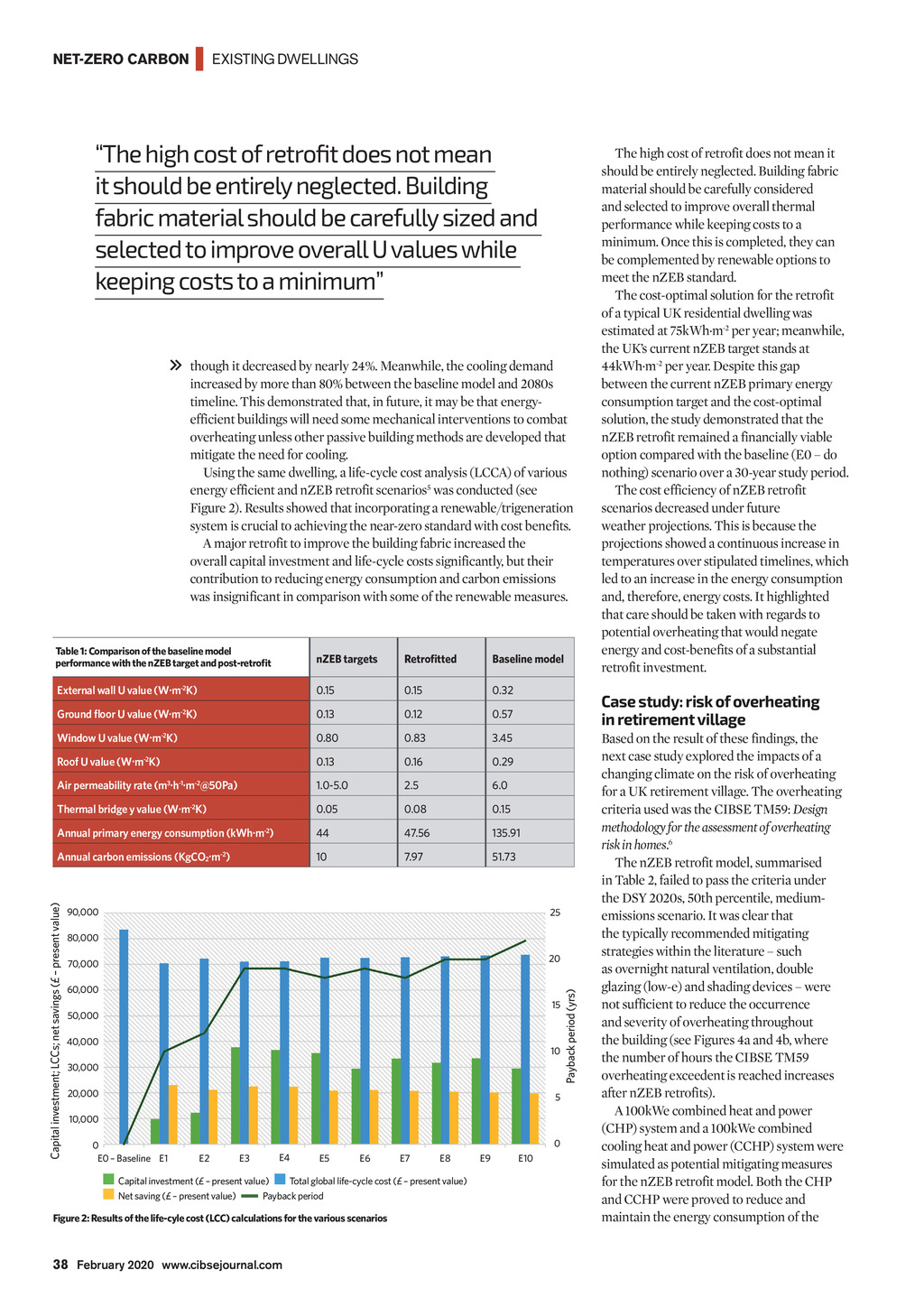 NET-ZERO CARBON | EXISTING DWELLINGS The high cost of retrofit does not mean it should be entirely neglected. Building fabric material should be carefully sized and selected to improve overall U values while keeping costs to a minimum though it decreased by nearly 24%. Meanwhile, the cooling demand increased by more than 80% between the baseline model and 2080s timeline. This demonstrated that, in future, it may be that energyefficient buildings will need some mechanical interventions to combat overheating unless other passive building methods are developed that mitigate the need for cooling. Using the same dwelling, a life-cycle cost analysis (LCCA) of various energy efficient and nZEB retrofit scenarios5 was conducted (see Figure 2). Results showed that incorporating a renewable/trigeneration system is crucial to achieving the near-zero standard with cost benefits. A major retrofit to improve the building fabric increased the overall capital investment and life-cycle costs significantly, but their contribution to reducing energy consumption and carbon emissions was insignificant in comparison with some of the renewable measures. Table 1: Comparison of the baseline model performance with the nZEB target and post-retrofit nZEB targets Retrofitted Baseline model External wall U value (W.m-2K) 0.15 0.15 0.32 Ground floor U value (W.m-2K) 0.13 0.12 0.57 Window U value (W.m-2K) 0.80 0.83 3.45 Roof U value (W.m-2K) 0.13 0.16 0.29 Air permeability rate (m3.h-1.m-2@50Pa) 1.0-5.0 2.5 6.0 0.05 0.08 0.15 Annual primary energy consumption (kWh.m ) 44 47.56 135.91 Annual carbon emissions (KgCO2.m-2) 10 7.97 51.73 Thermal bridge y value (W.m-2K) Case study: risk of overheating in retirement village 90,000 25 80,000 20 70,000 60,000 15 50,000 40,000 10 30,000 20,000 5 10,000 0 E0 Baseline E1 0 E2 E3 E4 E5 E6 E7 E8 Capital investment ( present value) Total global life-cycle cost ( present value) Net saving ( present value) Payback period Figure 2: Results of the life-cyle cost (LCC) calculations for the various scenarios E9 E10 Payback period (yrs) Capital investment; LCCs; net savings ( present value) -2 The high cost of retrofit does not mean it should be entirely neglected. Building fabric material should be carefully considered and selected to improve overall thermal performance while keeping costs to a minimum. Once this is completed, they can be complemented by renewable options to meet the nZEB standard. The cost-optimal solution for the retrofit of a typical UK residential dwelling was estimated at 75kWh.m-2 per year; meanwhile, the UKs current nZEB target stands at 44kWh.m-2 per year. Despite this gap between the current nZEB primary energy consumption target and the cost-optimal solution, the study demonstrated that the nZEB retrofit remained a financially viable option compared with the baseline (E0 do nothing) scenario over a 30-year study period. The cost efficiency of nZEB retrofit scenarios decreased under future weather projections. This is because the projections showed a continuous increase in temperatures over stipulated timelines, which led to an increase in the energy consumption and, therefore, energy costs. It highlighted that care should be taken with regards to potential overheating that would negate energy and cost-benefits of a substantial retrofit investment. Based on the result of these findings, the next case study explored the impacts of a changing climate on the risk of overheating for a UK retirement village. The overheating criteria used was the CIBSE TM59: Design methodology for the assessment of overheating risk in homes.6 The nZEB retrofit model, summarised in Table 2, failed to pass the criteria under the DSY 2020s, 50th percentile, mediumemissions scenario. It was clear that the typically recommended mitigating strategies within the literature such as overnight natural ventilation, double glazing (low-e) and shading devices were not sufficient to reduce the occurrence and severity of overheating throughout the building (see Figures 4a and 4b, where the number of hours the CIBSE TM59 overheating exceedent is reached increases after nZEB retrofits). A 100kWe combined heat and power (CHP) system and a 100kWe combined cooling heat and power (CCHP) system were simulated as potential mitigating measures for the nZEB retrofit model. Both the CHP and CCHP were proved to reduce and maintain the energy consumption of the 38 February 2020 www.cibsejournal.com CIBSE Feb20 pp36-39 Zero carbon.indd 38 24/01/2020 15:06