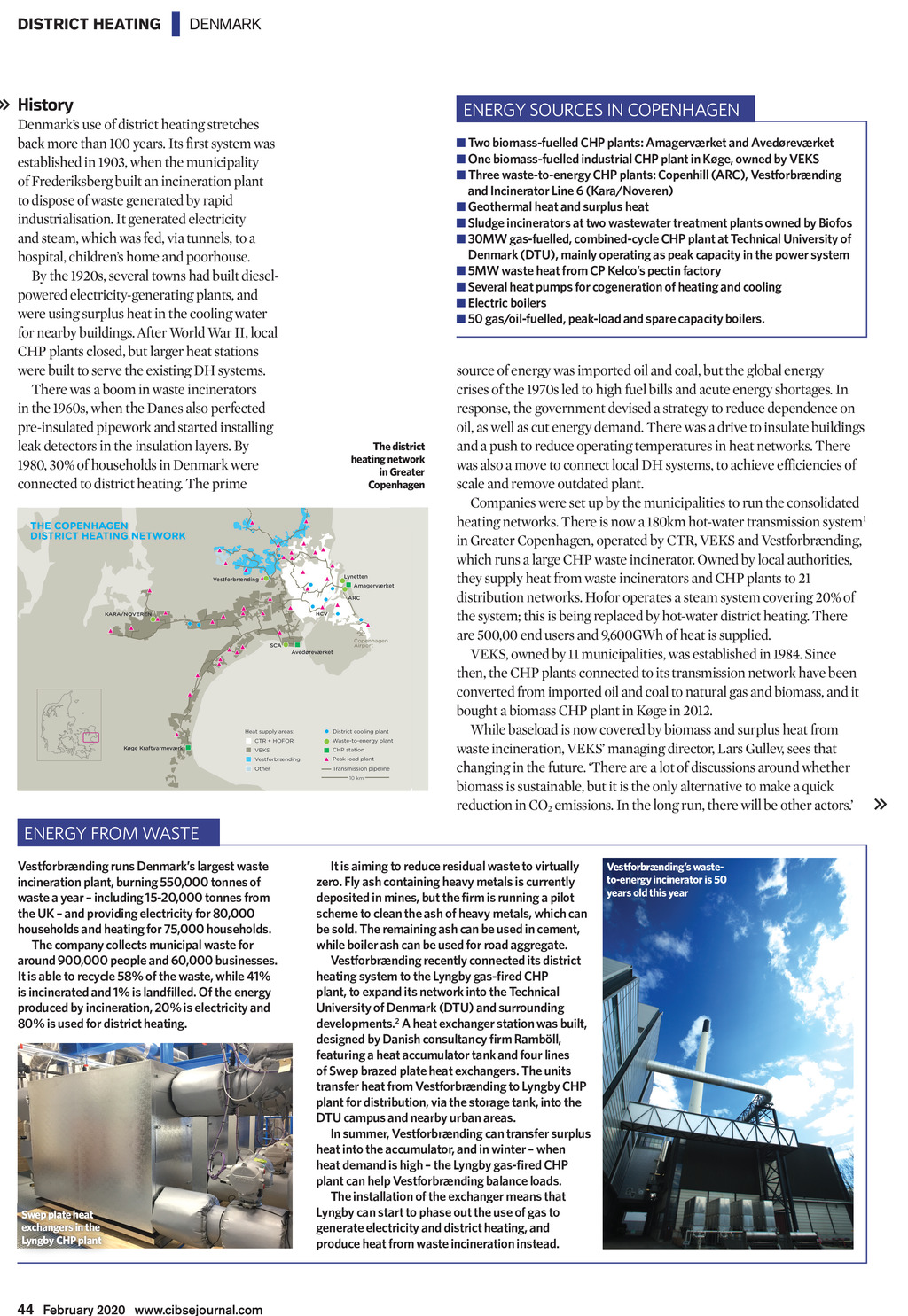 DISTRICT HEATING | DENMARK History Denmarks use of district heating stretches back more than 100 years. Its first system was established in 1903, when the municipality of Frederiksberg built an incineration plant to dispose of waste generated by rapid industrialisation. It generated electricity and steam, which was fed, via tunnels, to a hospital, childrens home and poorhouse. By the 1920s, several towns had built dieselpowered electricity-generating plants, and were using surplus heat in the cooling water for nearby buildings. After World War II, local CHP plants closed, but larger heat stations were built to serve the existing DH systems. There was a boom in waste incinerators in the 1960s, when the Danes also perfected pre-insulated pipework and started installing leak detectors in the insulation layers. By 1980, 30% of households in Denmark were connected to district heating. The prime ENERGY SOURCES IN COPENHAGEN Two biomass-fuelled CHP plants: Amagervrket and Avedrevrket One biomass-fuelled industrial CHP plant in Kge, owned by VEKS Three waste-to-energy CHP plants: Copenhill (ARC), Vestforbrnding and Incinerator Line 6 (Kara/Noveren) Geothermal heat and surplus heat Sludge incinerators at two wastewater treatment plants owned by Biofos 30MW gas-fuelled, combined-cycle CHP plant at Technical University of Denmark (DTU), mainly operating as peak capacity in the power system 5MW waste heat from CP Kelcos pectin factory Several heat pumps for cogeneration of heating and cooling Electric boilers 50 gas/oil-fuelled, peak-load and spare capacity boilers. The district heating network in Greater Copenhagen source of energy was imported oil and coal, but the global energy crises of the 1970s led to high fuel bills and acute energy shortages. In response, the government devised a strategy to reduce dependence on oil, as well as cut energy demand. There was a drive to insulate buildings and a push to reduce operating temperatures in heat networks. There was also a move to connect local DH systems, to achieve efficiencies of scale and remove outdated plant. Companies were set up by the municipalities to run the consolidated heating networks. There is now a 180km hot-water transmission system1 in Greater Copenhagen, operated by CTR, VEKS and Vestforbrnding, which runs a large CHP waste incinerator. Owned by local authorities, they supply heat from waste incinerators and CHP plants to 21 distribution networks. Hofor operates a steam system covering 20% of the system; this is being replaced by hot-water district heating. There are 500,00 end users and 9,600GWh of heat is supplied. VEKS, owned by 11 municipalities, was established in 1984. Since then, the CHP plants connected to its transmission network have been converted from imported oil and coal to natural gas and biomass, and it bought a biomass CHP plant in Kge in 2012. While baseload is now covered by biomass and surplus heat from waste incineration, VEKS managing director, Lars Gullev, sees that changing in the future. There are a lot of discussions around whether biomass is sustainable, but it is the only alternative to make a quick reduction in CO2 emissions. In the long run, there will be other actors. ENERGY FROM WASTE Vestforbrnding runs Denmarks largest waste incineration plant, burning 550,000 tonnes of waste a year including 15-20,000 tonnes from the UK and providing electricity for 80,000 households and heating for 75,000 households. The company collects municipal waste for around 900,000 people and 60,000 businesses. It is able to recycle 58% of the waste, while 41% is incinerated and 1% is landlled. Of the energy produced by incineration, 20% is electricity and 80% is used for district heating. Swep plate heat exchangers in the Lyngby CHP plant 44 February 2020 www.cibsejournal.com It is aiming to reduce residual waste to virtually zero. Fly ash containing heavy metals is currently deposited in mines, but the rm is running a pilot scheme to clean the ash of heavy metals, which can be sold. The remaining ash can be used in cement, while boiler ash can be used for road aggregate. Vestforbrnding recently connected its district heating system to the Lyngby gas-red CHP plant, to expand its network into the Technical University of Denmark (DTU) and surrounding developments.2 A heat exchanger station was built, designed by Danish consultancy rm Rambll, featuring a heat accumulator tank and four lines of Swep brazed plate heat exchangers. The units transfer heat from Vestforbrnding to Lyngby CHP plant for distribution, via the storage tank, into the DTU campus and nearby urban areas. In summer, Vestforbrnding can transfer surplus heat into the accumulator, and in winter when heat demand is high the Lyngby gas-red CHP plant can help Vestforbrnding balance loads. The installation of the exchanger means that Lyngby can start to phase out the use of gas to generate electricity and district heating, and produce heat from waste incineration instead. Vestforbrndings wasteto-energy incinerator is 50 years old this year