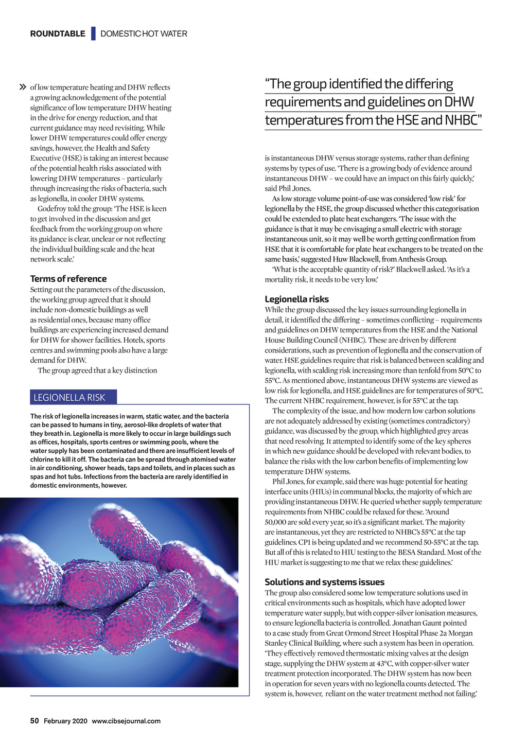 ROUNDTABLE | DOMESTIC HOT WATER of low temperature heating and DHW reflects a growing acknowledgement of the potential significance of low temperature DHW heating in the drive for energy reduction, and that current guidance may need revisiting. While lower DHW temperatures could offer energy savings, however, the Health and Safety Executive (HSE) is taking an interest because of the potential health risks associated with lowering DHW temperatures particularly through increasing the risks of bacteria, such as legionella, in cooler DHW systems. Godefroy told the group: The HSE is keen to get involved in the discussion and get feedback from the working group on where its guidance is clear, unclear or not reflecting the individual building scale and the heat network scale. Terms of reference Setting out the parameters of the discussion, the working group agreed that it should include non-domestic buildings as well as residential ones, because many office buildings are experiencing increased demand for DHW for shower facilities. Hotels, sports centres and swimming pools also have a large demand for DHW. The group agreed that a key distinction LEGIONELLA RISK The risk of legionella increases in warm, static water, and the bacteria can be passed to humans in tiny, aerosol-like droplets of water that they breath in. Legionella is more likely to occur in large buildings such as offices, hospitals, sports centres or swimming pools, where the water supply has been contaminated and there are insufficient levels of chlorine to kill it off. The bacteria can be spread through atomised water in air conditioning, shower heads, taps and toilets, and in places such as spas and hot tubs. Infections from the bacteria are rarely identified in domestic environments, however. The group identified the differing requirements and guidelines on DHW temperatures from the HSE and NHBC is instantaneous DHW versus storage systems, rather than defining systems by types of use. There is a growing body of evidence around instantaneous DHW we could have an impact on this fairly quickly, said Phil Jones. As low storage volume point-of-use was considered low risk for legionella by the HSE, the group discussed whether this categorisation could be extended to plate heat exchangers. The issue with the guidance is that it may be envisaging a small electric with storage instantaneous unit, so it may well be worth getting confirmation from HSE that it is comfortable for plate heat exchangers to be treated on the same basis, suggested Huw Blackwell, from Anthesis Group. What is the acceptable quantity of risk? Blackwell asked. As its a mortality risk, it needs to be very low. Legionella risks While the group discussed the key issues surrounding legionella in detail, it identified the differing sometimes conflicting requirements and guidelines on DHW temperatures from the HSE and the National House Building Council (NHBC). These are driven by different considerations, such as prevention of legionella and the conservation of water. HSE guidelines require that risk is balanced between scalding and legionella, with scalding risk increasing more than tenfold from 50C to 55C. As mentioned above, instantaneous DHW systems are viewed as low risk for legionella, and HSE guidelines are for temperatures of 50C. The current NHBC requirement, however, is for 55C at the tap. The complexity of the issue, and how modern low carbon solutions are not adequately addressed by existing (sometimes contradictory) guidance, was discussed by the group, which highlighted grey areas that need resolving. It attempted to identify some of the key spheres in which new guidance should be developed with relevant bodies, to balance the risks with the low carbon benefits of implementing low temperature DHW systems. Phil Jones, for example, said there was huge potential for heating interface units (HIUs) in communal blocks, the majority of which are providing instantaneous DHW. He queried whether supply temperature requirements from NHBC could be relaxed for these. Around 50,000 are sold every year, so its a significant market. The majority are instantaneous, yet they are restricted to NHBCs 55C at the tap guidelines. CP1 is being updated and we recommend 50-55C at the tap. But all of this is related to HIU testing to the BESA Standard. Most of the HIU market is suggesting to me that we relax these guidelines. Solutions and systems issues The group also considered some low temperature solutions used in critical environments such as hospitals, which have adopted lower temperature water supply, but with copper-silver ionisation measures, to ensure legionella bacteria is controlled. Jonathan Gaunt pointed to a case study from Great Ormond Street Hospital Phase 2a Morgan Stanley Clinical Building, where such a system has been in operation. They effectively removed thermostatic mixing valves at the design stage, supplying the DHW system at 43C, with copper-silver water treatment protection incorporated. The DHW system has now been in operation for seven years with no legionella counts detected. The system is, however, reliant on the water treatment method not failing. 50 February 2020 www.cibsejournal.com CIBSE Feb20 pp49-51 DHW roundtable.indd 50 24/01/2020 15:45